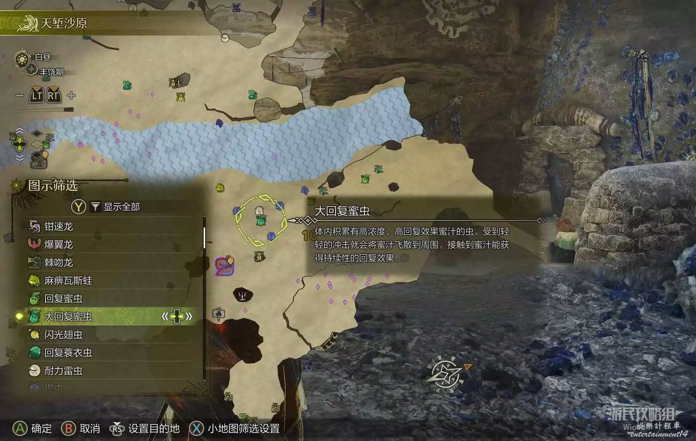 此時打開地圖,通過左下角的圖示篩選選擇一個離得近的【大回復密蟲】的位置,設置目的地後直接自動尋路過去。