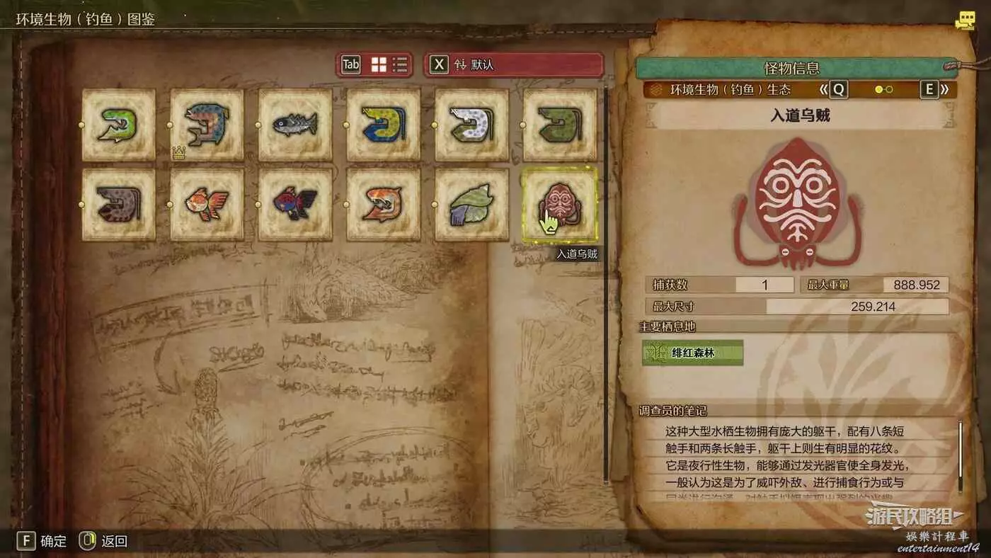 本作中除了普通的環境生物之外,還加入了通過釣魚捕獲的環境生物,通關後可以繼續解鎖所有環境生物圖鑒。