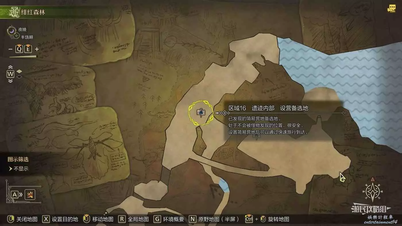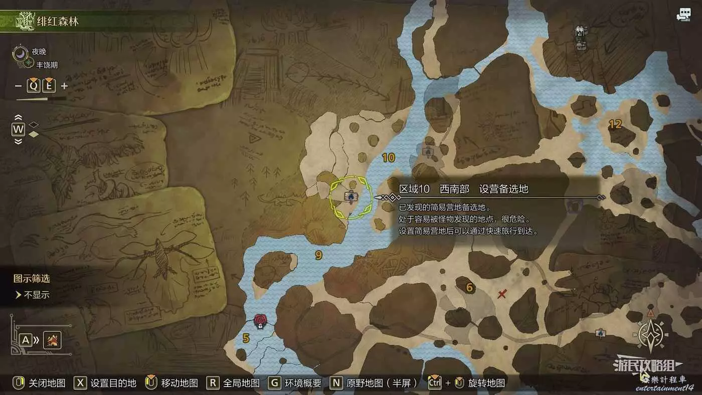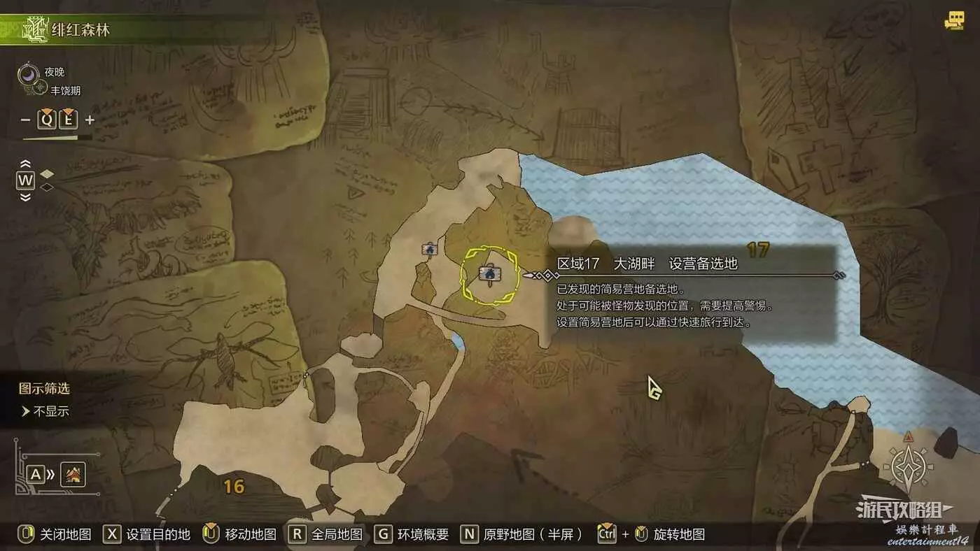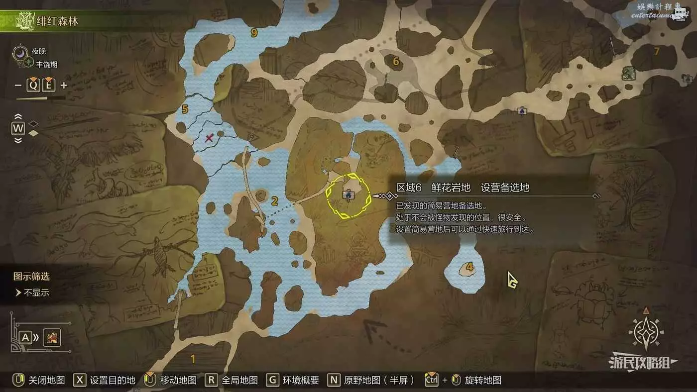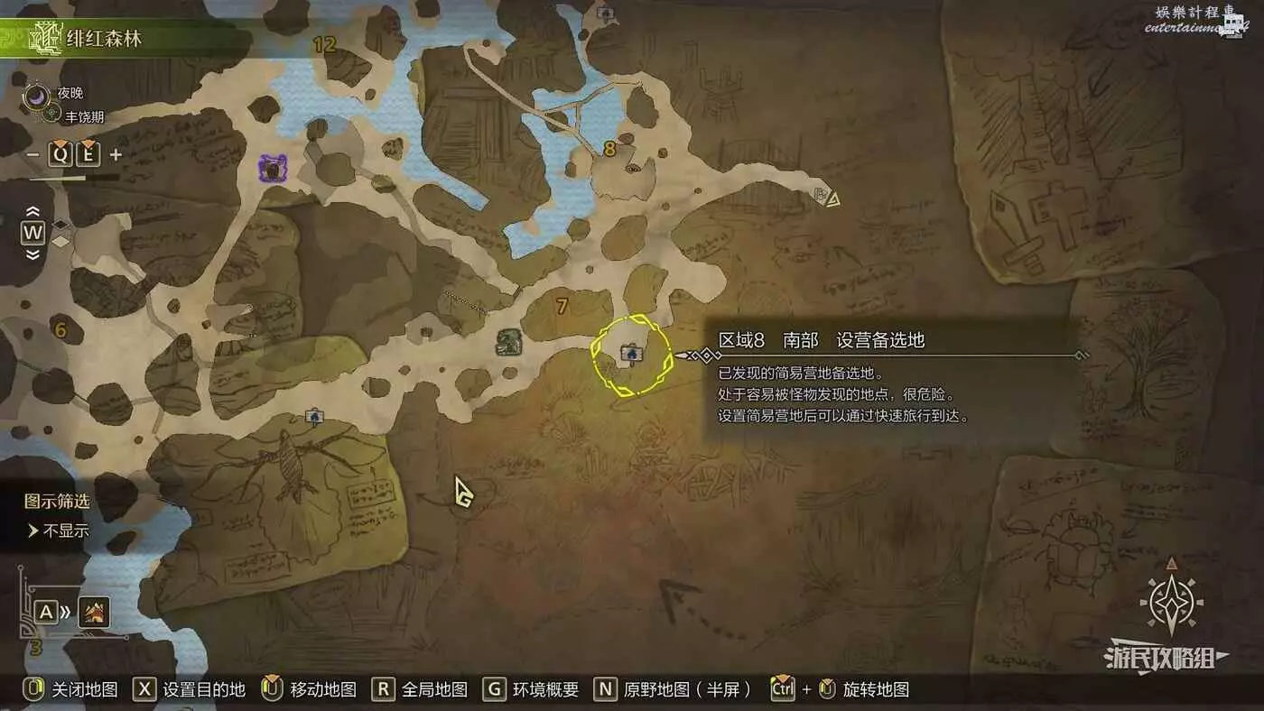 緋紅森林總共有12個可搭建簡易營地的位置,最多可搭建的數量會根據獵人等級提升而增加。臨時營地距離許多都比較近,因此可以根據自己的喜好來選擇搭建位置。尤其建議在【區域6鮮花岩地】、【區域16遺跡內部】和【區域17大湖畔】搭建營地,這幾處都是靠近釣魚點比較安全的位置。如果有其他想要採集的礦產或素材,可以考慮在富集點附近的點位搭建臨時營地,方便一次性刷完所需素材,哪怕之後營地被破壞掉也影響不大。