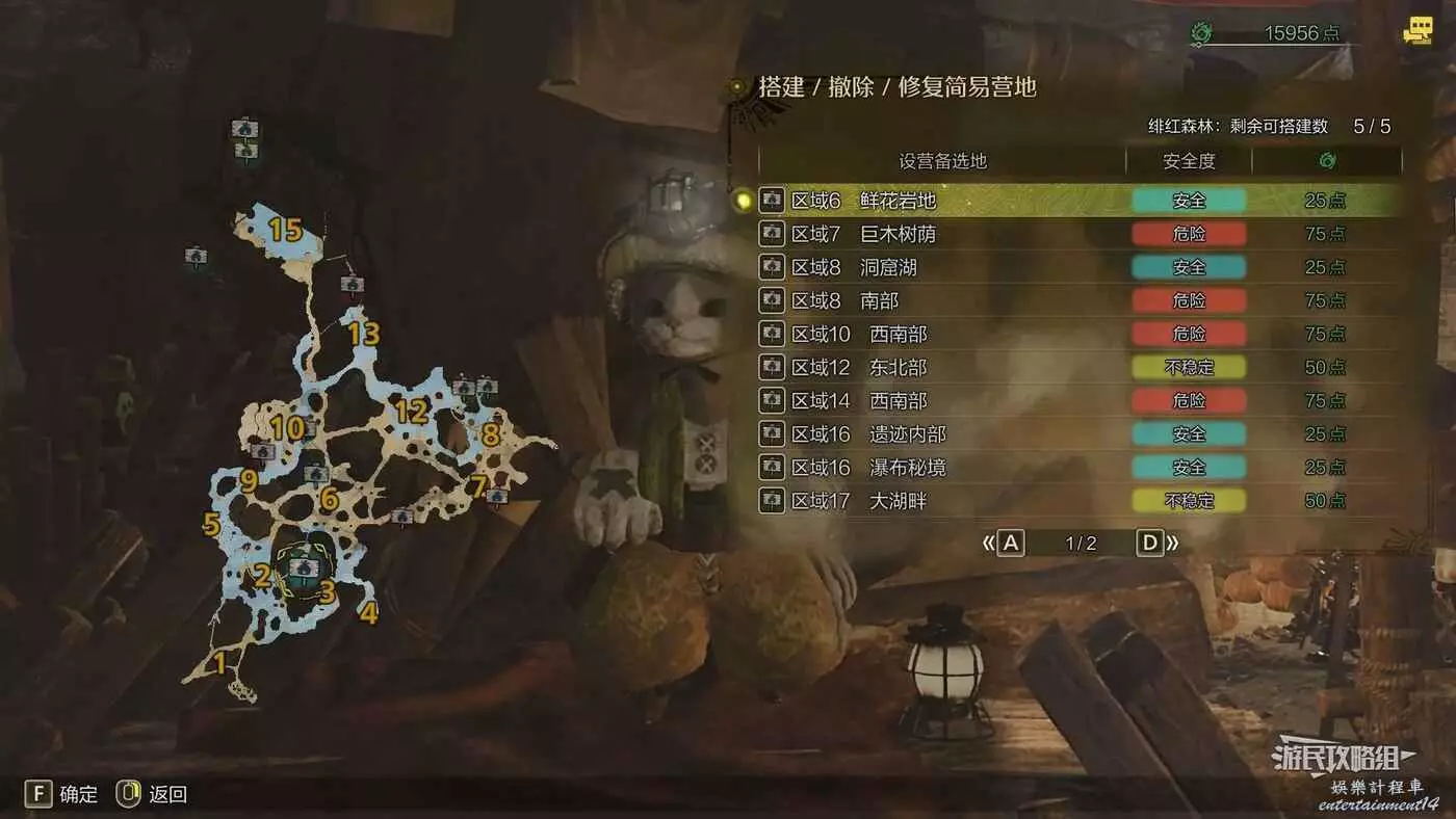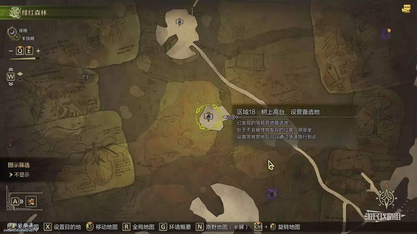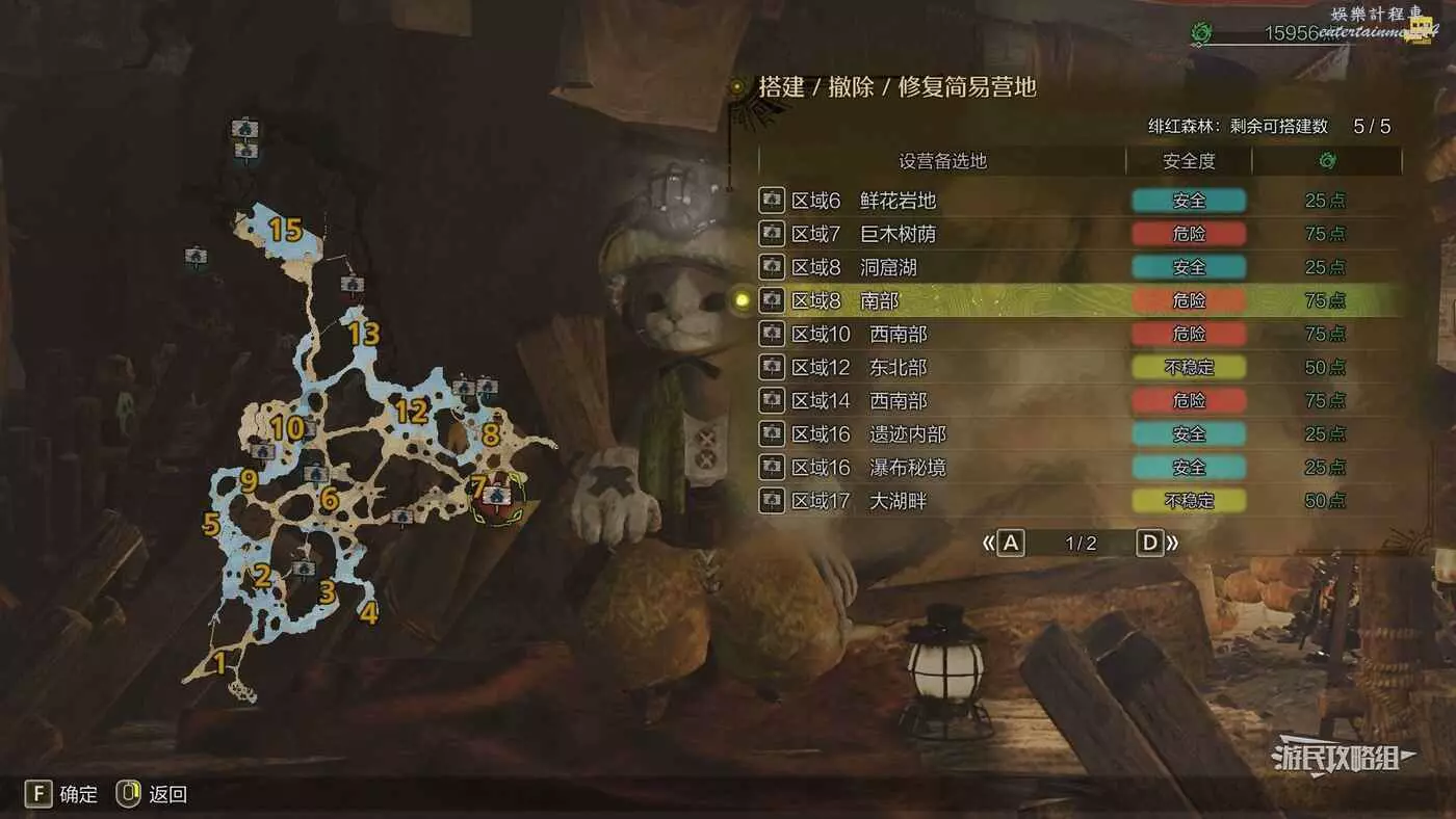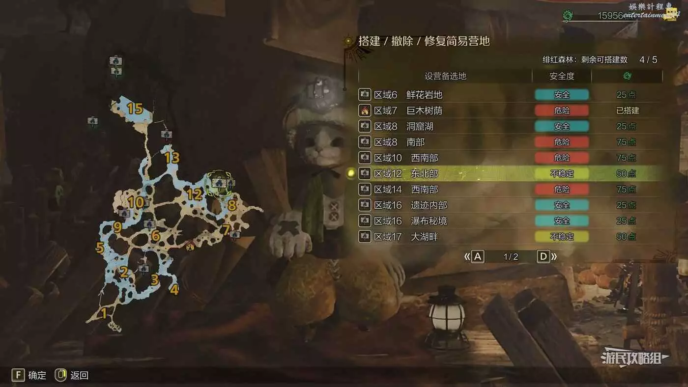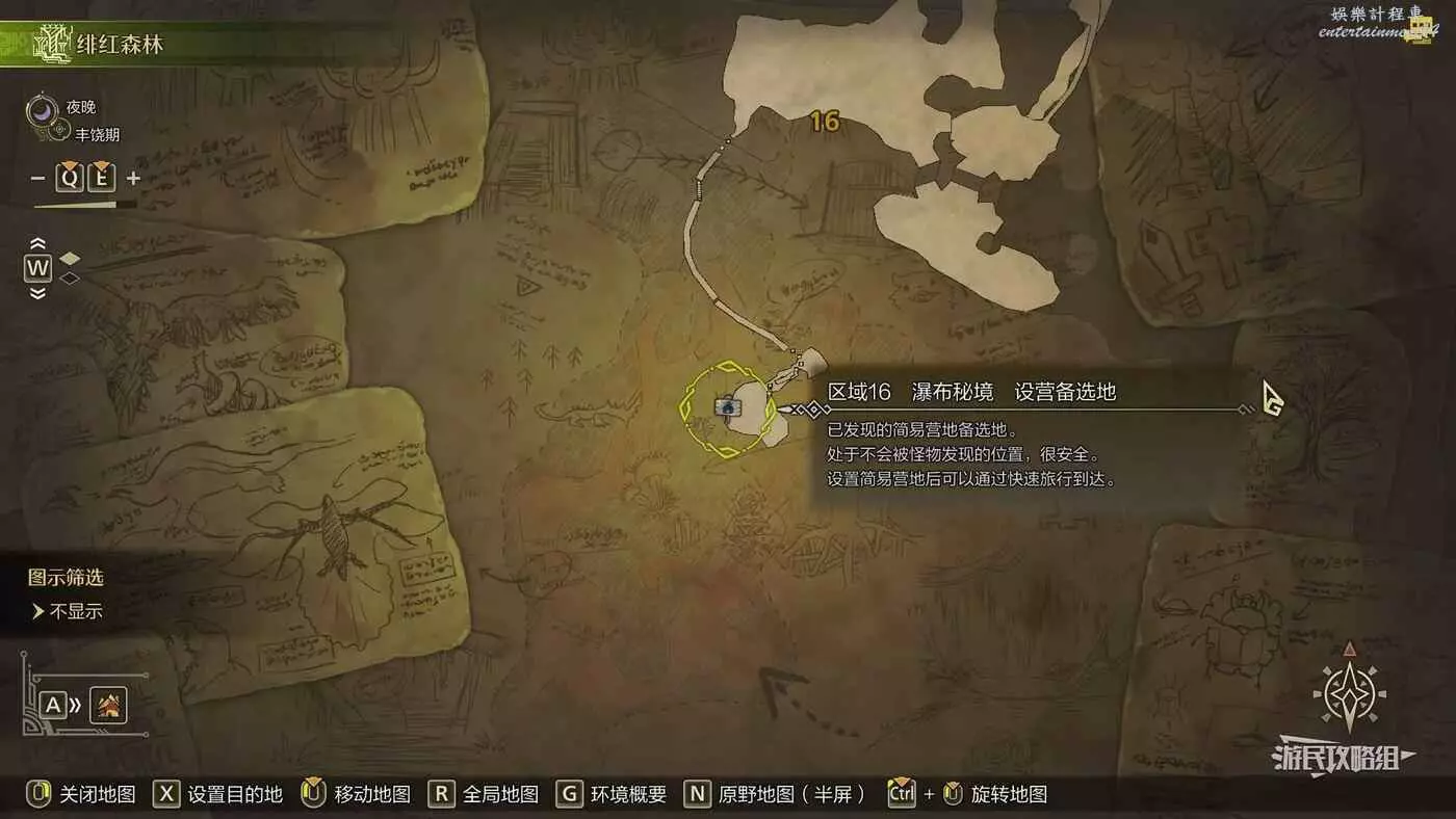 緋紅森林總共有12個可搭建簡易營地的位置,最多可搭建的數量會根據獵人等級提升而增加。臨時營地距離許多都比較近,因此可以根據自己的喜好來選擇搭建位置。尤其建議在【區域6鮮花岩地】、【區域16遺跡內部】和【區域17大湖畔】搭建營地,這幾處都是靠近釣魚點比較安全的位置。如果有其他想要採集的礦產或素材,可以考慮在富集點附近的點位搭建臨時營地,方便一次性刷完所需素材,哪怕之後營地被破壞掉也影響不大。