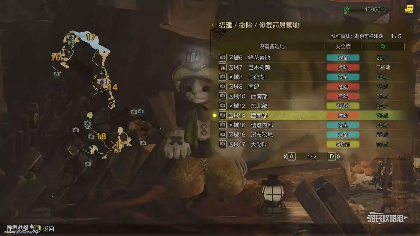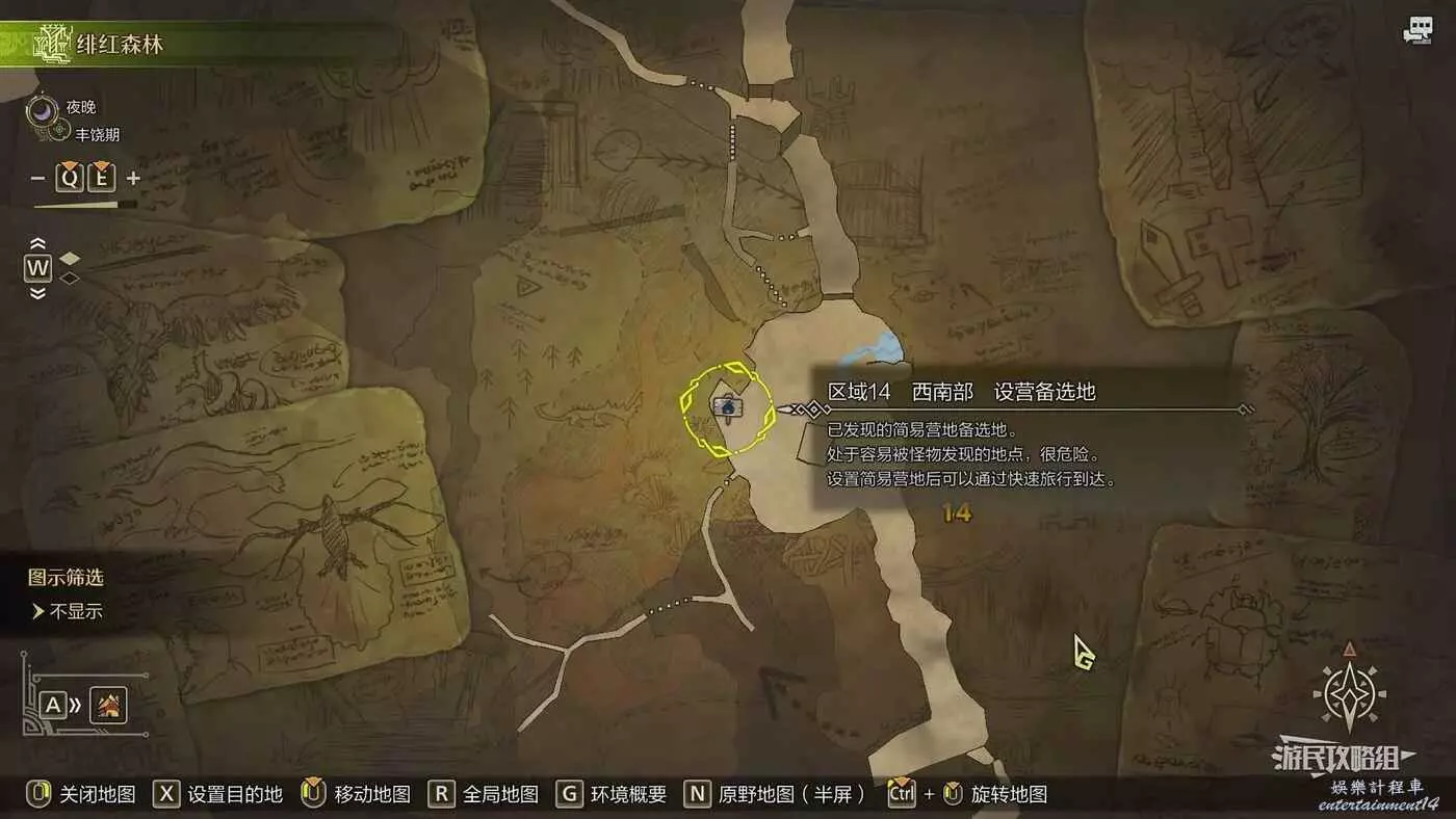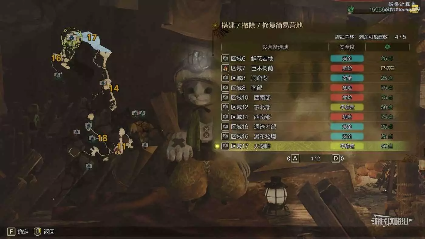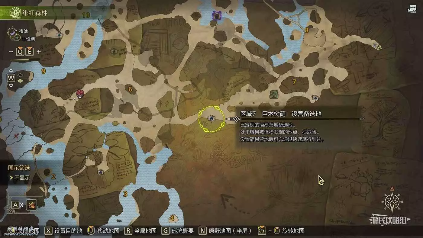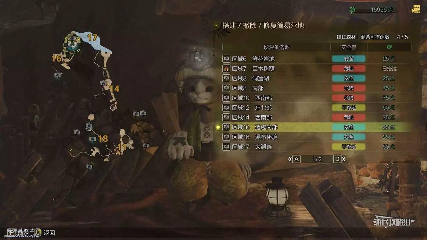 緋紅森林總共有12個可搭建簡易營地的位置,最多可搭建的數量會根據獵人等級提升而增加。臨時營地距離許多都比較近,因此可以根據自己的喜好來選擇搭建位置。尤其建議在【區域6鮮花岩地】、【區域16遺跡內部】和【區域17大湖畔】搭建營地,這幾處都是靠近釣魚點比較安全的位置。如果有其他想要採集的礦產或素材,可以考慮在富集點附近的點位搭建臨時營地,方便一次性刷完所需素材,哪怕之後營地被破壞掉也影響不大。