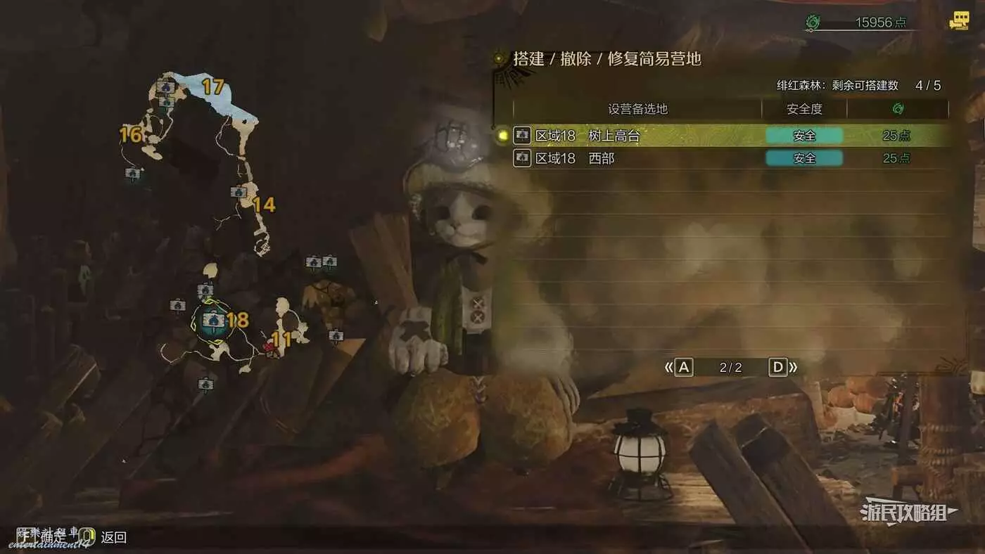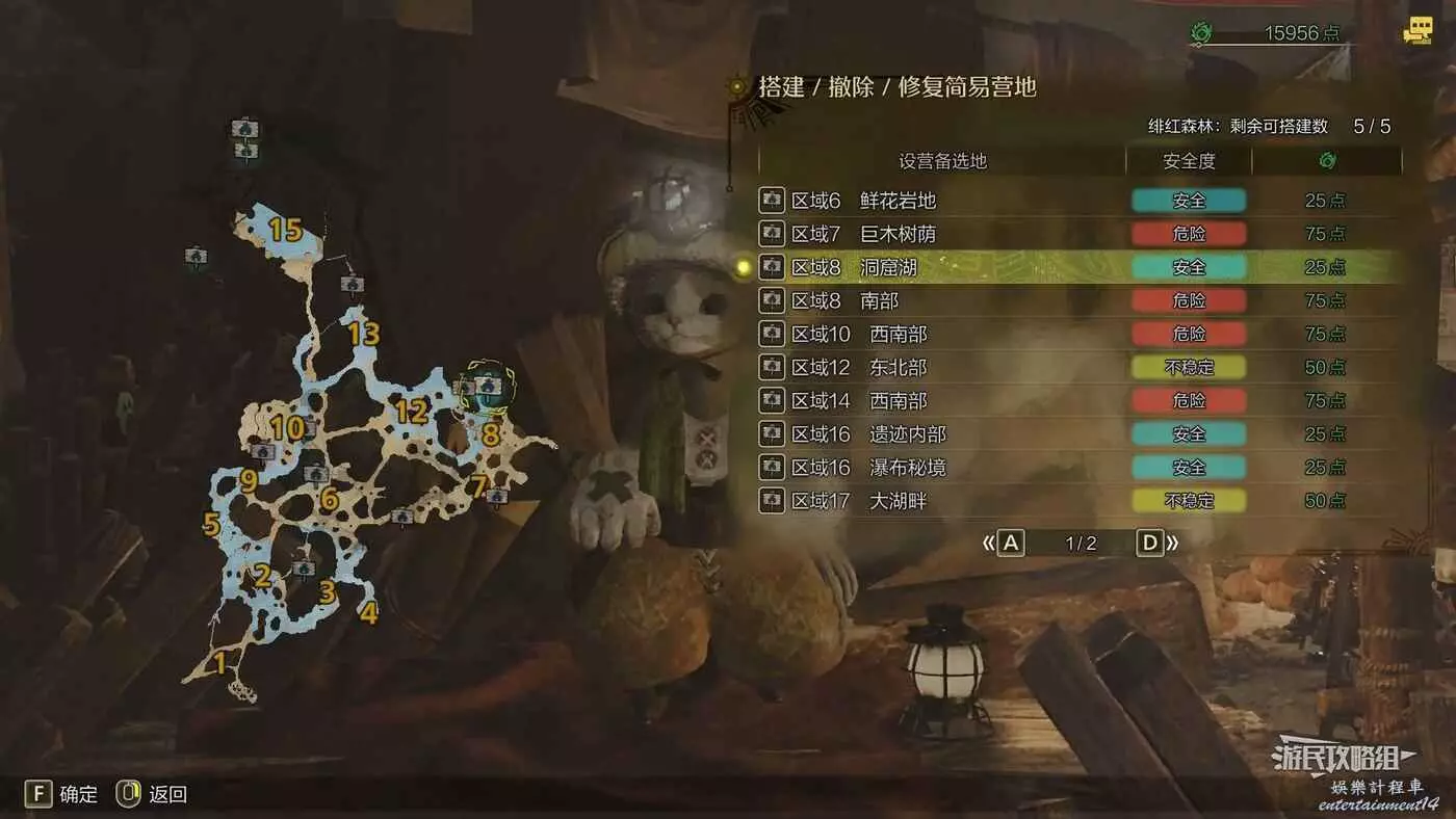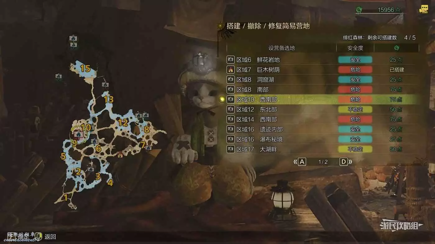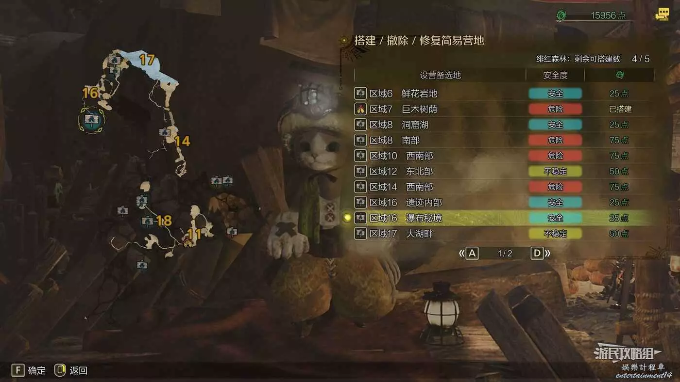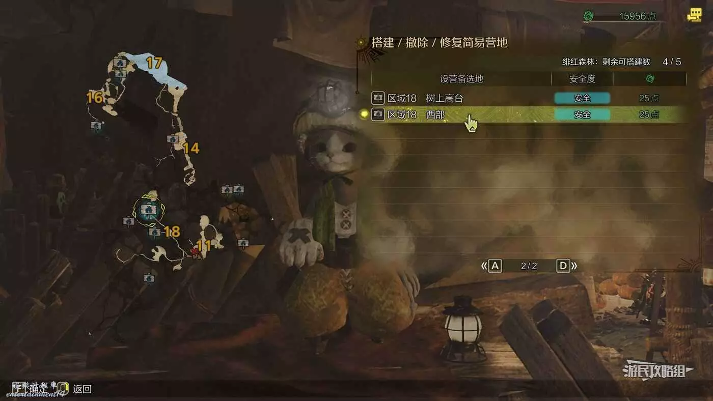 緋紅森林總共有12個可搭建簡易營地的位置,最多可搭建的數量會根據獵人等級提升而增加。臨時營地距離許多都比較近,因此可以根據自己的喜好來選擇搭建位置。尤其建議在【區域6鮮花岩地】、【區域16遺跡內部】和【區域17大湖畔】搭建營地,這幾處都是靠近釣魚點比較安全的位置。如果有其他想要採集的礦產或素材,可以考慮在富集點附近的點位搭建臨時營地,方便一次性刷完所需素材,哪怕之後營地被破壞掉也影響不大。