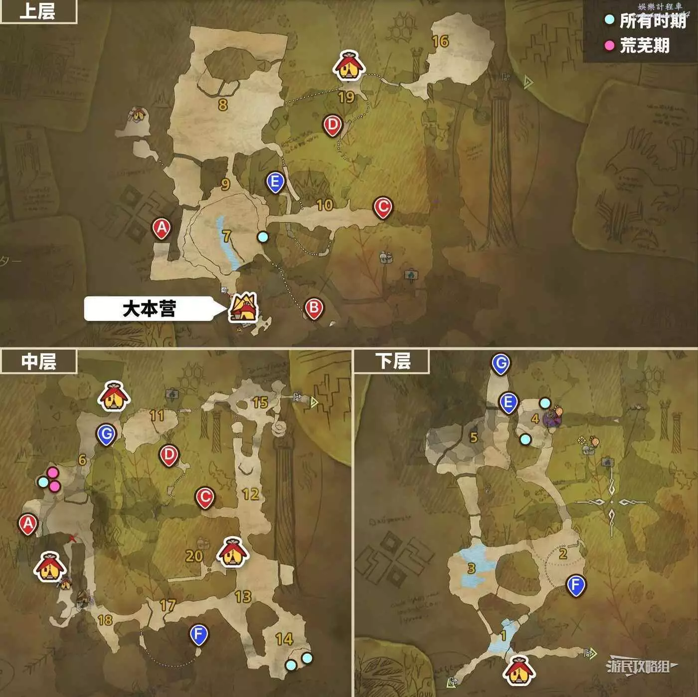 冰霧斷崖的骨塚採集路線推薦從大本營出發,先收集區域7和6中的骨塚,然後通過簡易營地【區域20遺跡房間】和【區域1冰河岸邊】出發並分別拾取這兩個區域的骨塚。建議重複【荒蕪期的自由任務中採集→返回】的步驟。注意簡易營地【區域6北部】被破壞的幾率非常大,但如果在此處搭建營地的話能夠在一定程度上縮短採集此區域中骨塚消耗的時間,不嫌反覆修麻煩的話可以在此處搭建簡易營地。