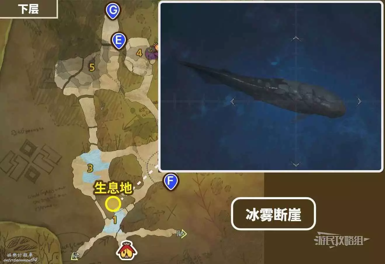 推薦前往冰霧斷崖區域1的釣魚點,在豐饒期釣。其他地圖出沒釣點請參考下文。