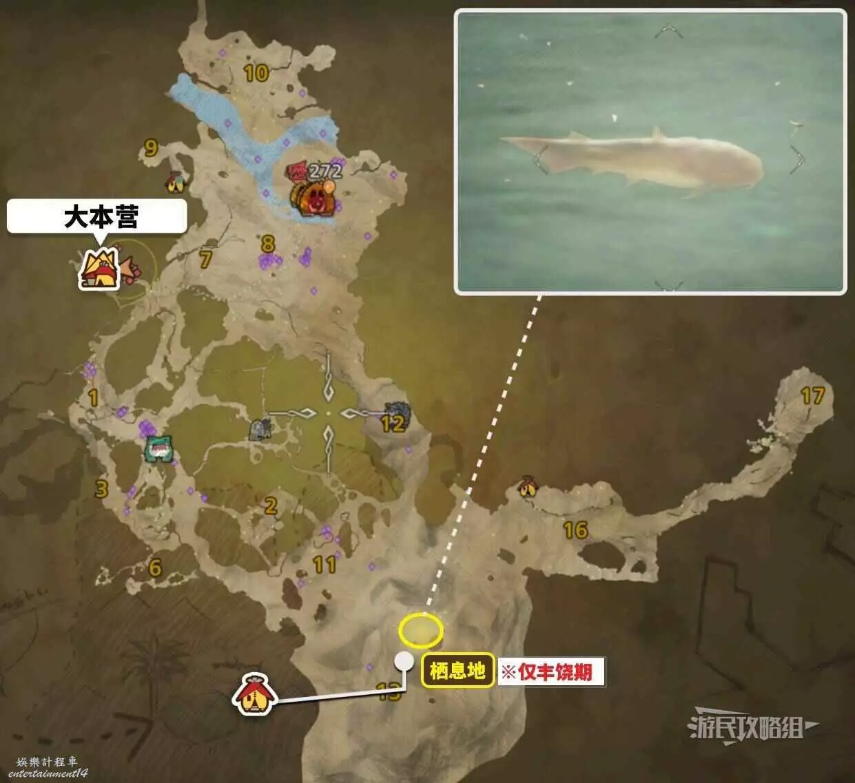 帶卵弓鰭魚也會出現在其他地圖。下方為各個地圖區域內出沒的釣點位置。