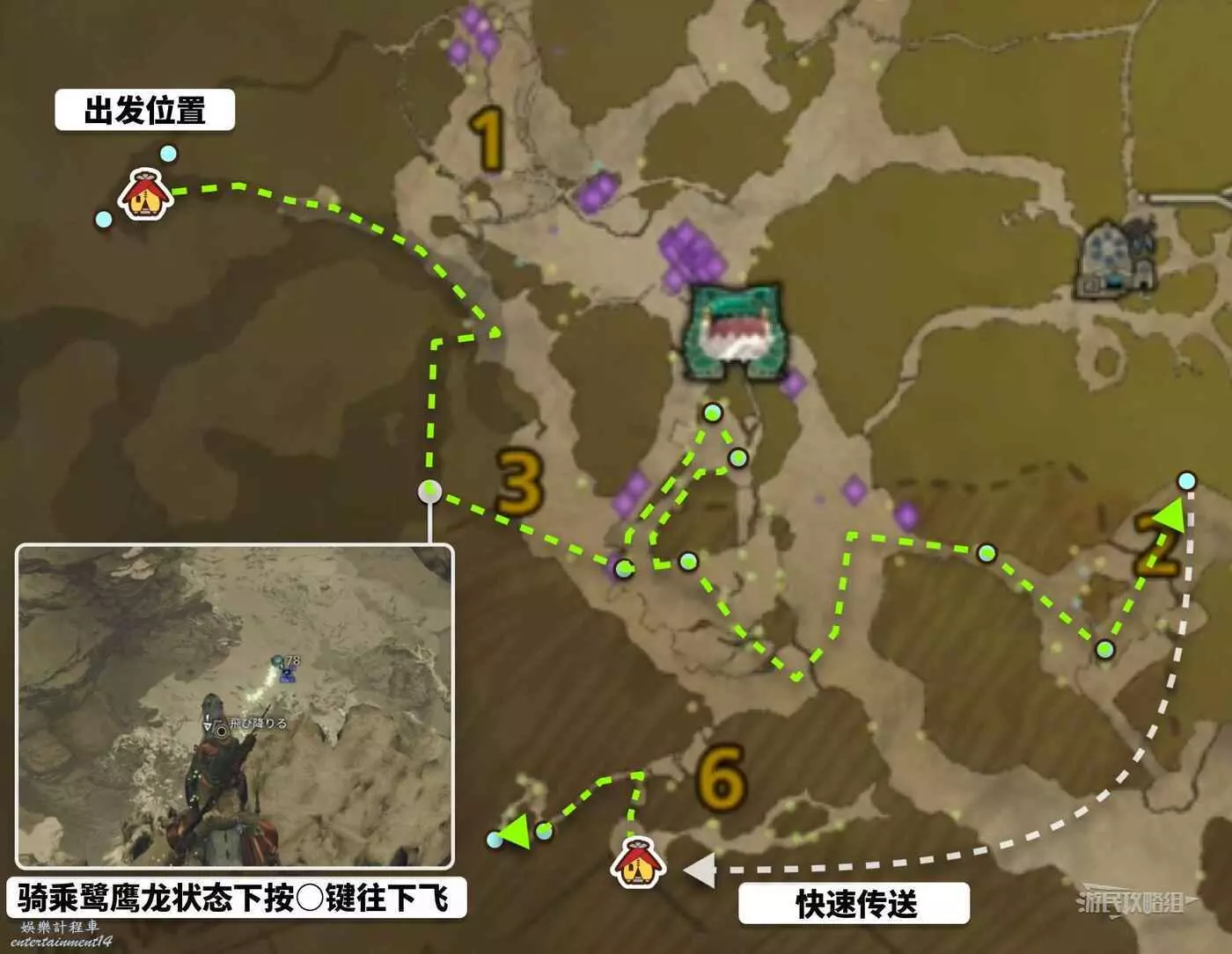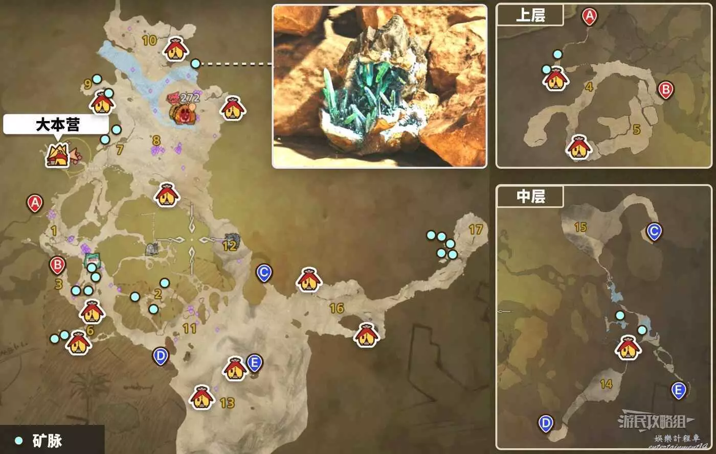 魔物獵人 荒野 天塹沙原礦脈點位及採集路線推薦 6 3 月 2025-03-06 廣告 作者:瑞破受氣包 來源:遊民星空 天塹沙原 天塹沙原的礦脈在上、中和下層都有分佈,上層和下層分別有2個點位,中層19個點位。 下位礦脈:鐵礦石、燕雀石、大地結晶 上位礦脈:鐵礦石、大地結晶、靈鶴石、光水晶、璀璨水晶 天塹沙原的礦脈採集路線推薦從上層簡易營地【礦石洞窟】出發後前往中層,採集完區域2中的礦石後,快速傳送到簡易營地【區域6山谷藏身處】。 注意從上層區域5到中層區域3的礦脈時需要騎鷺鷹龍往下飛,中途滑翔再落地。