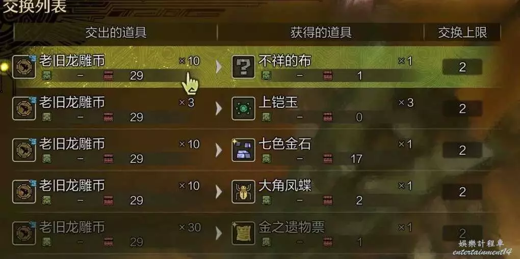 休息到豐饒期夜晚,出來和丁真對話看一下以物易物的內容(和古舊龍雕幣相關的只要看閃光假面和柳浪),然後重複上面的步驟。注意一定要豐饒期,我試過荒蕪期一個都沒有,而且最好是夜晚,白天森林6區的池塘有一次也沒刷出來。一趟路下來大概幾分鐘搞定,過程中還有礦、植物、捕魚之類的亂七八糟的東西可以摸一下,調查點數也是純賺的。