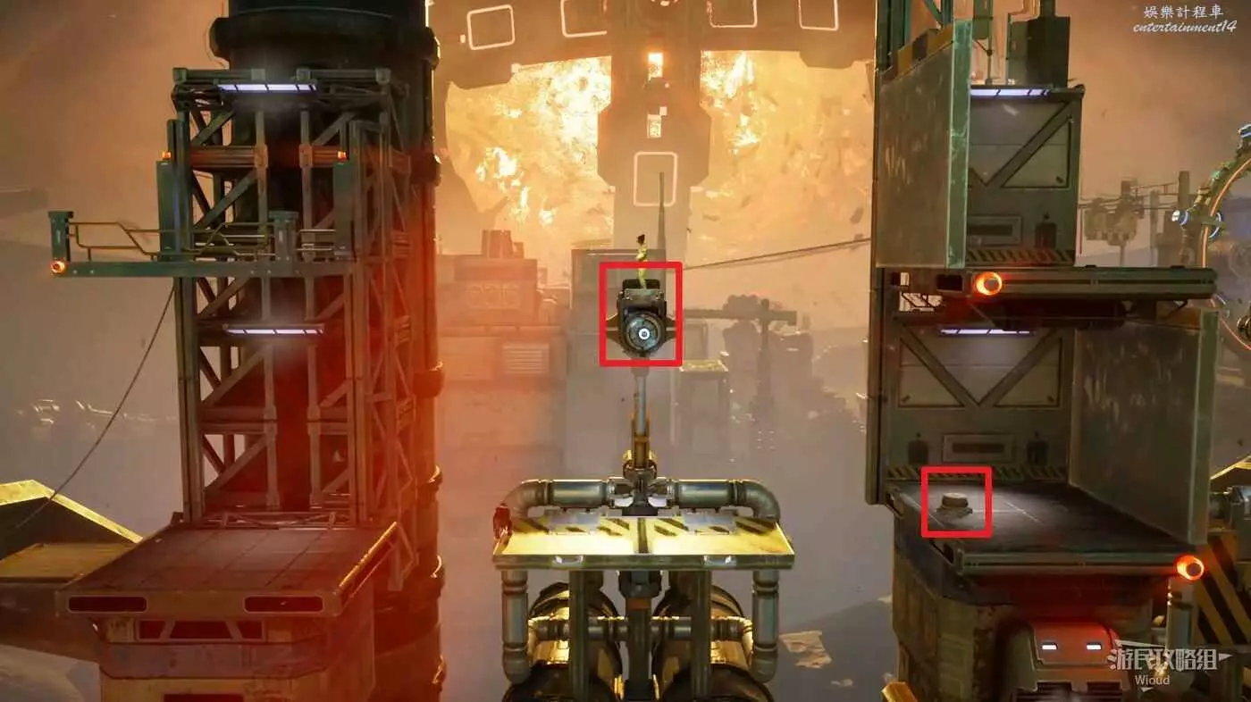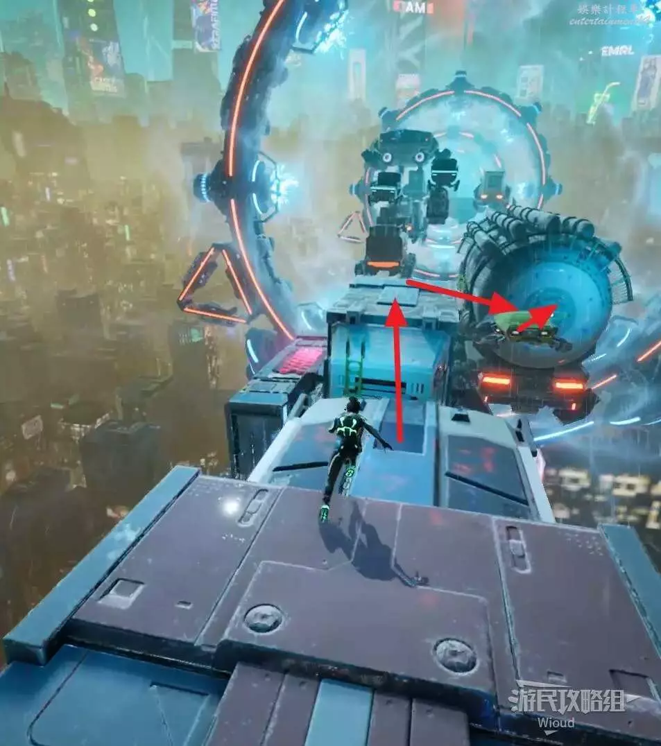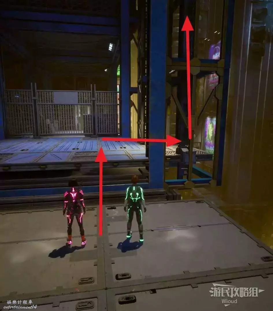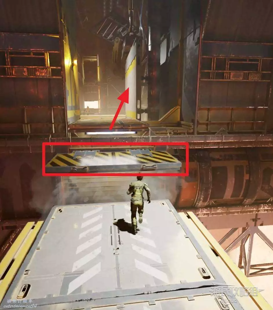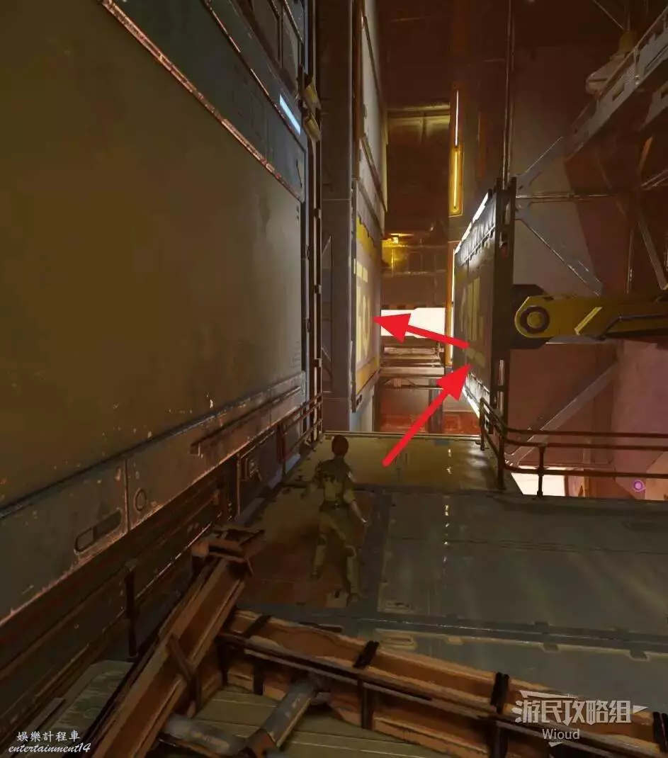 使用鉤爪跟過去,從車輛另一頭出來,沿著下圖路線一直跳到盡頭處的平台,兩個玩家合作與活板門互動觸發劇情。