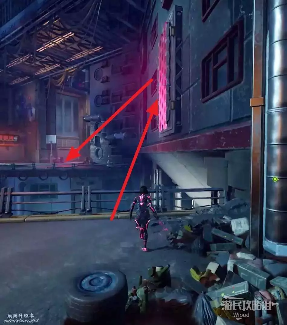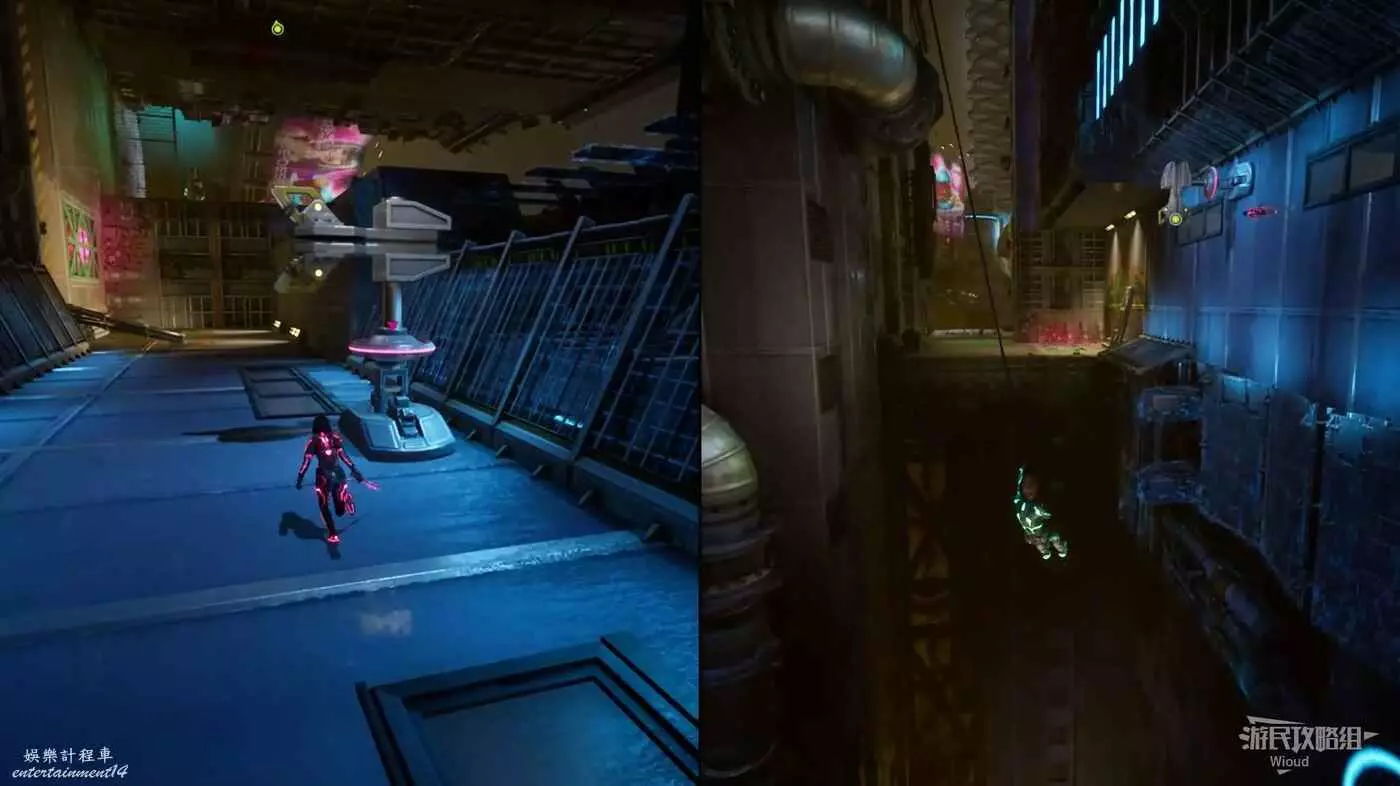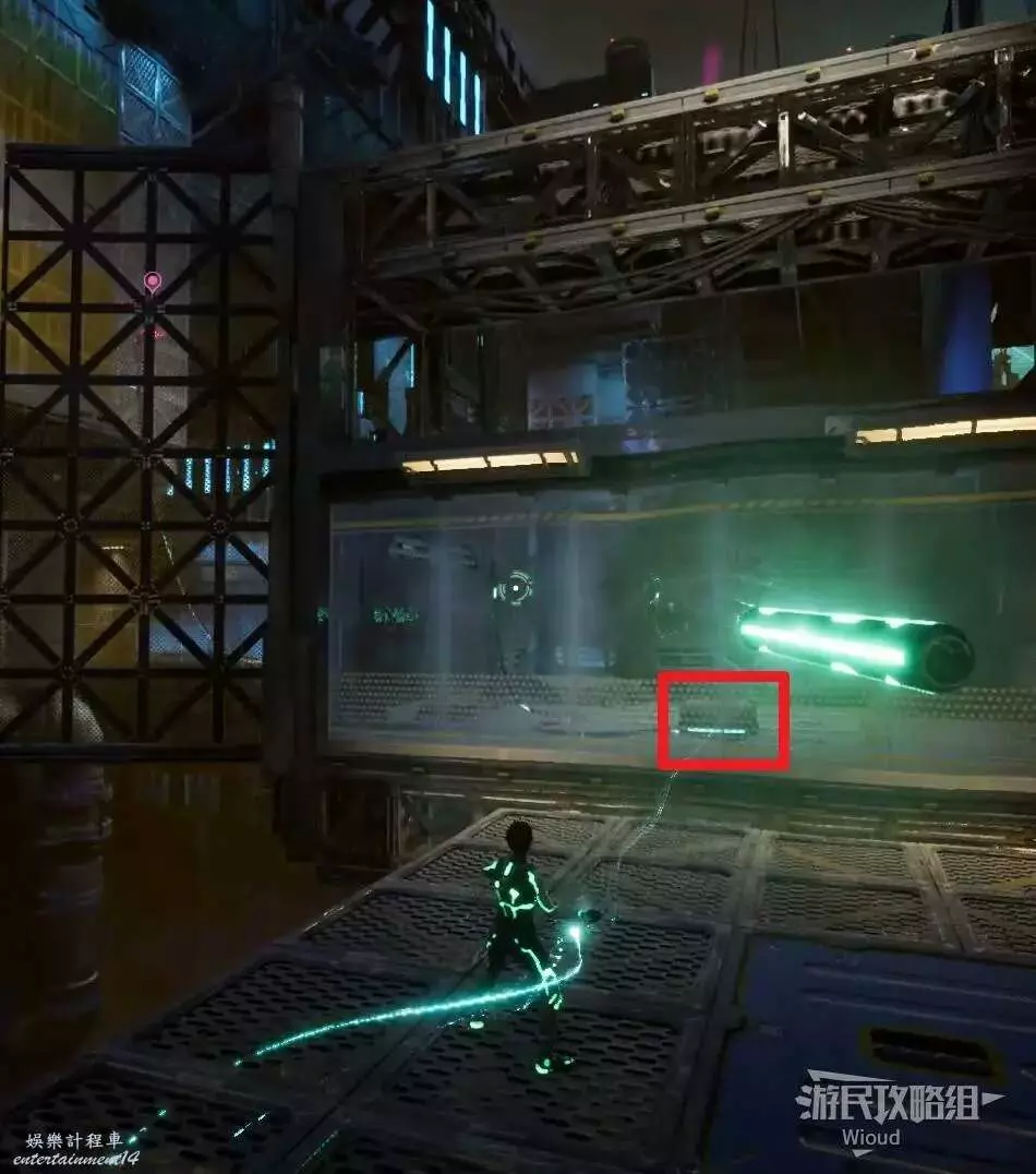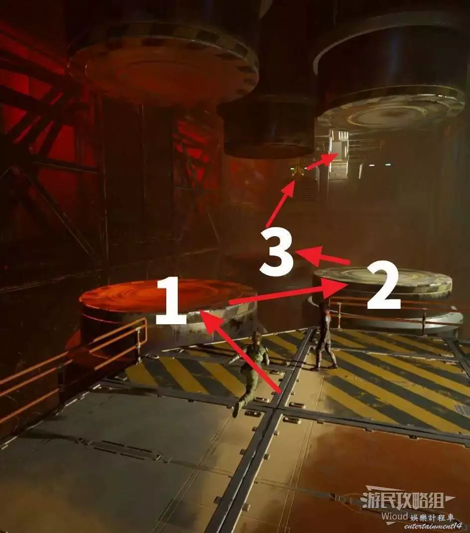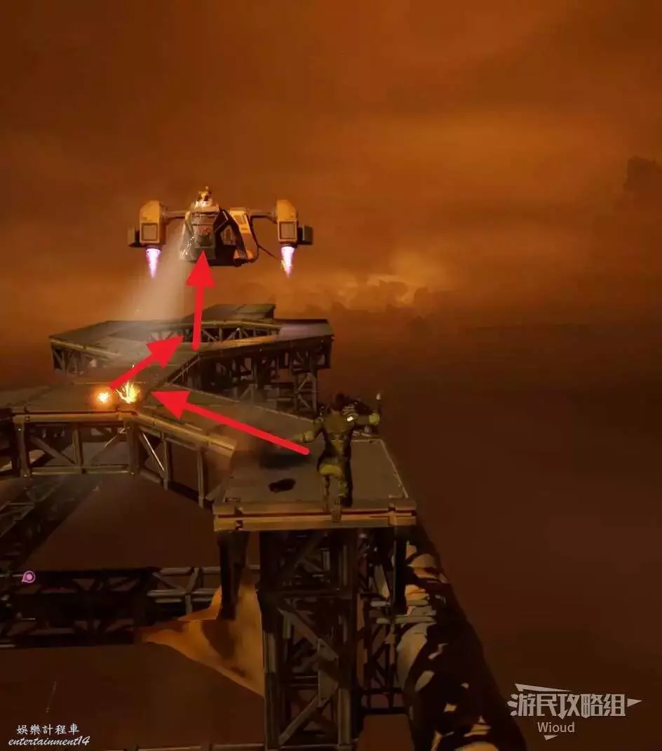 使用鉤爪跟過去,從車輛另一頭出來,沿著下圖路線一直跳到盡頭處的平台,兩個玩家合作與活板門互動觸發劇情。