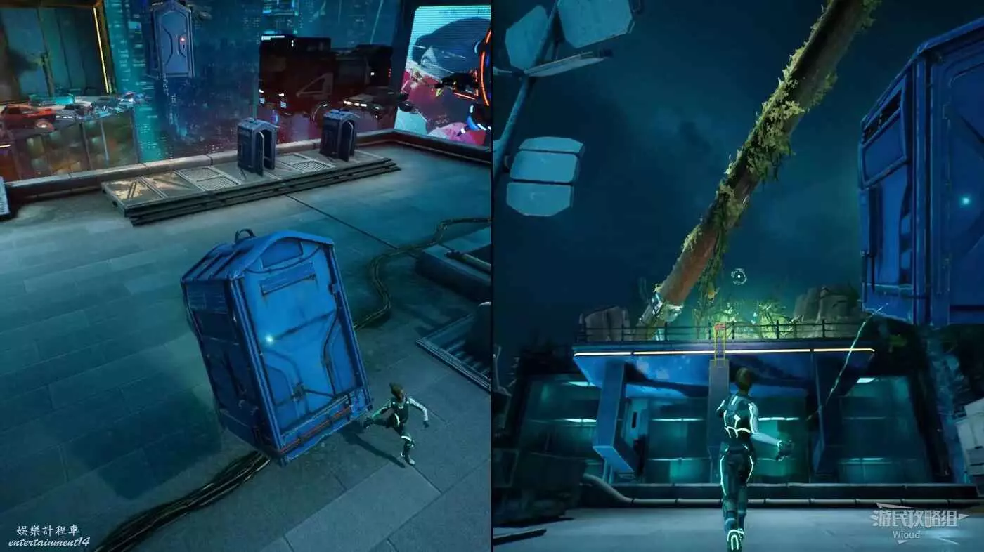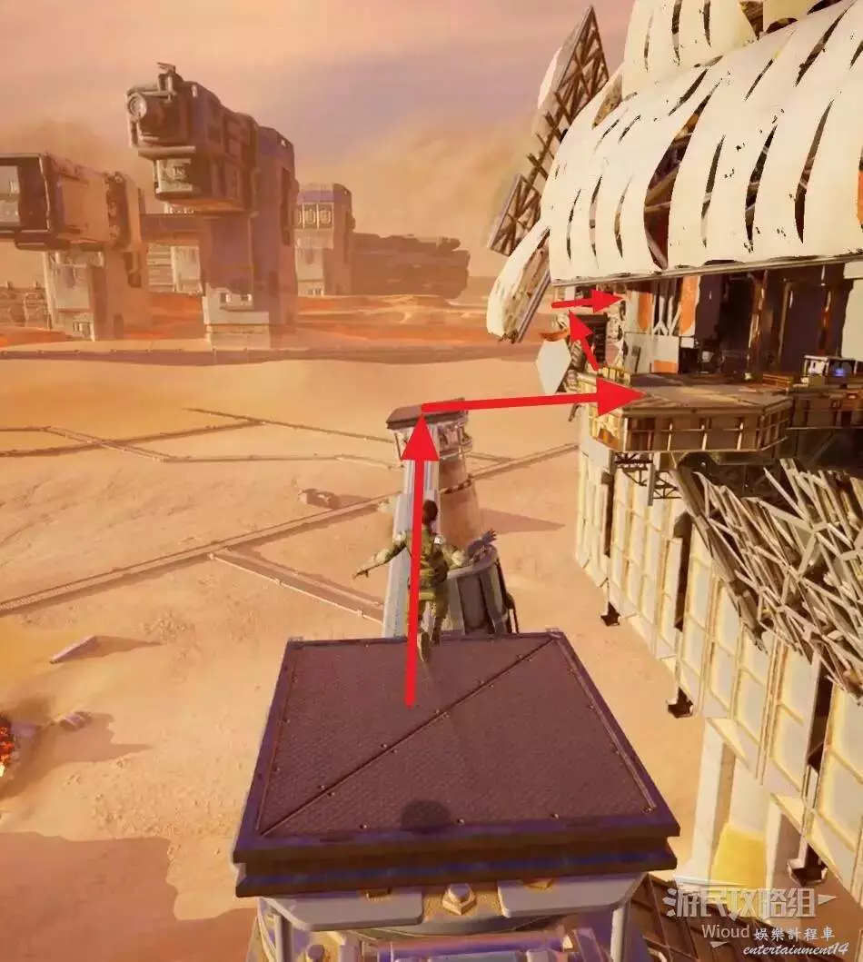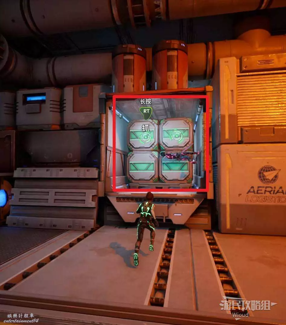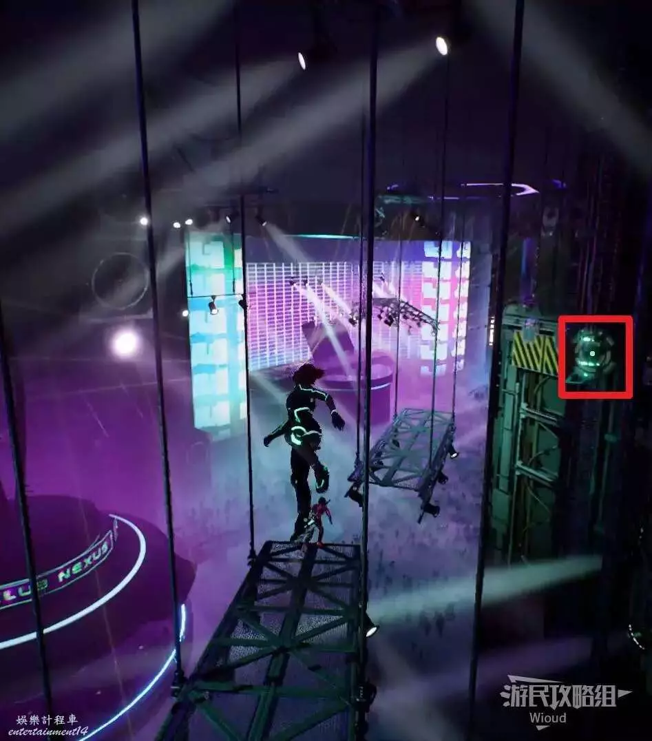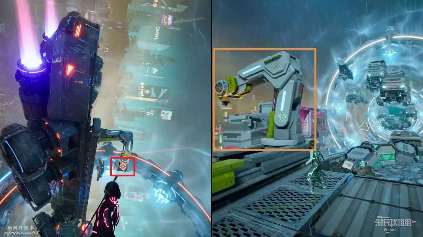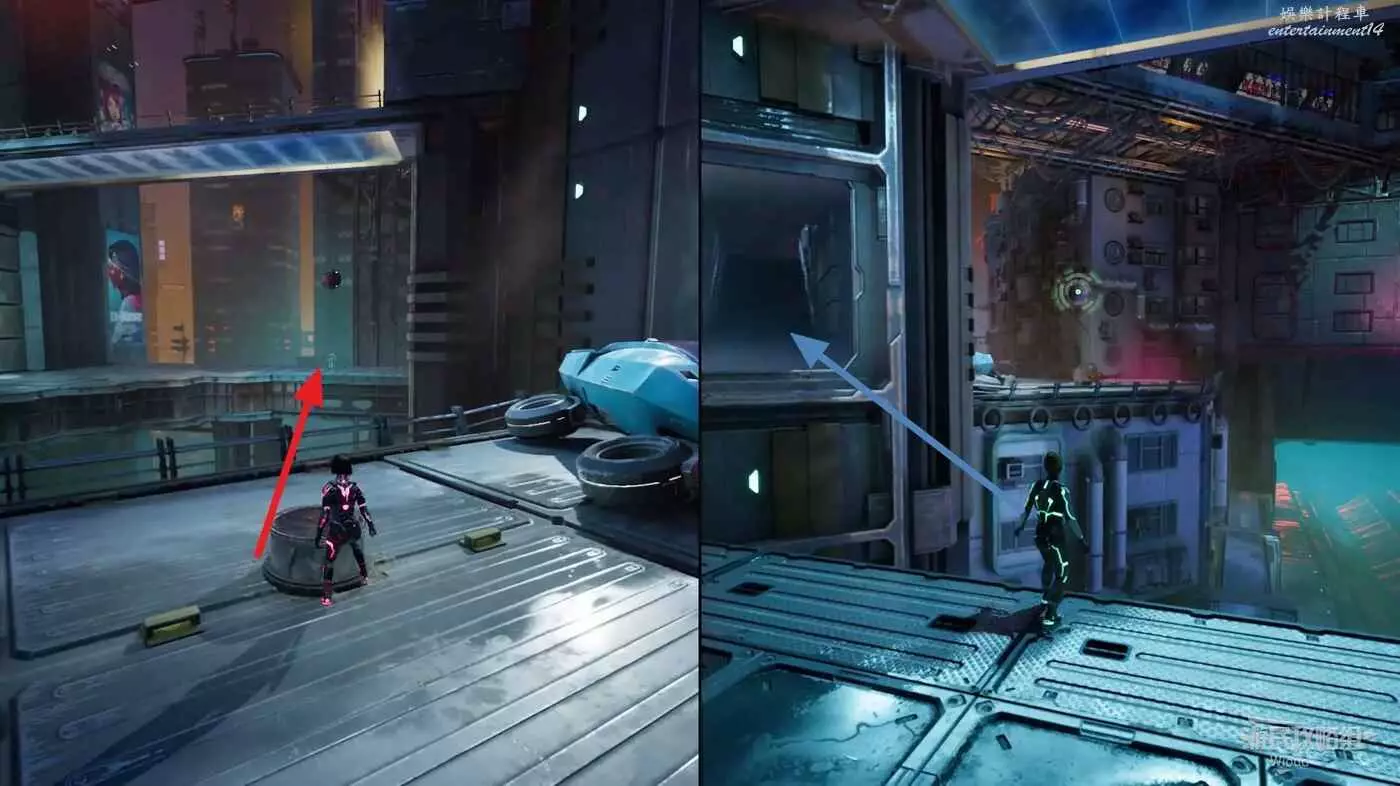 使用鉤爪跟過去,從車輛另一頭出來,沿著下圖路線一直跳到盡頭處的平台,兩個玩家合作與活板門互動觸發劇情。