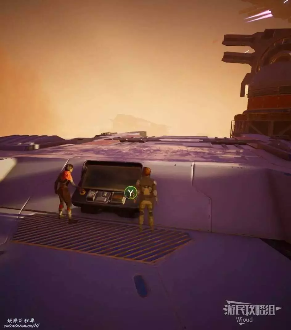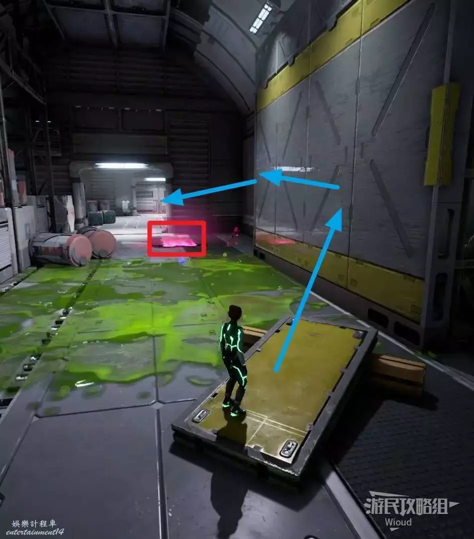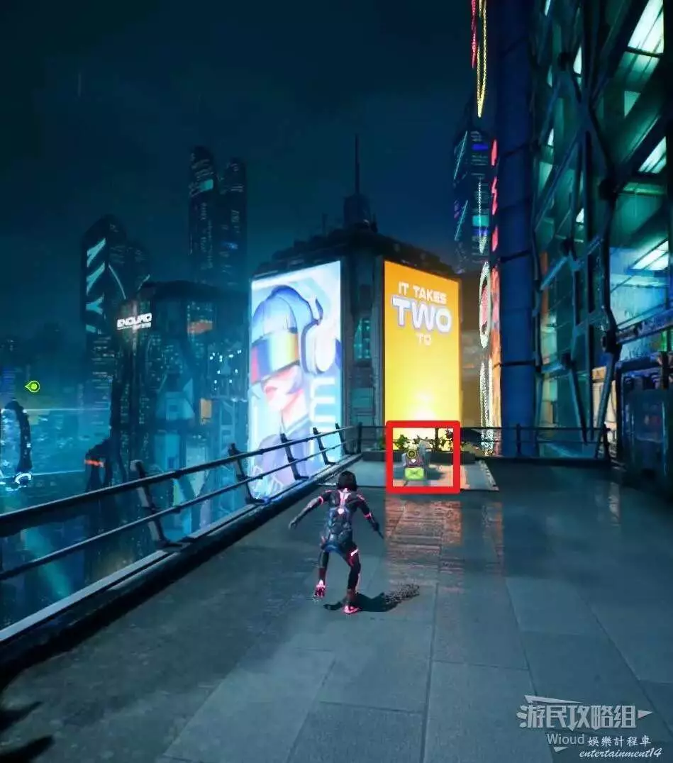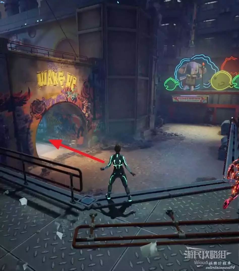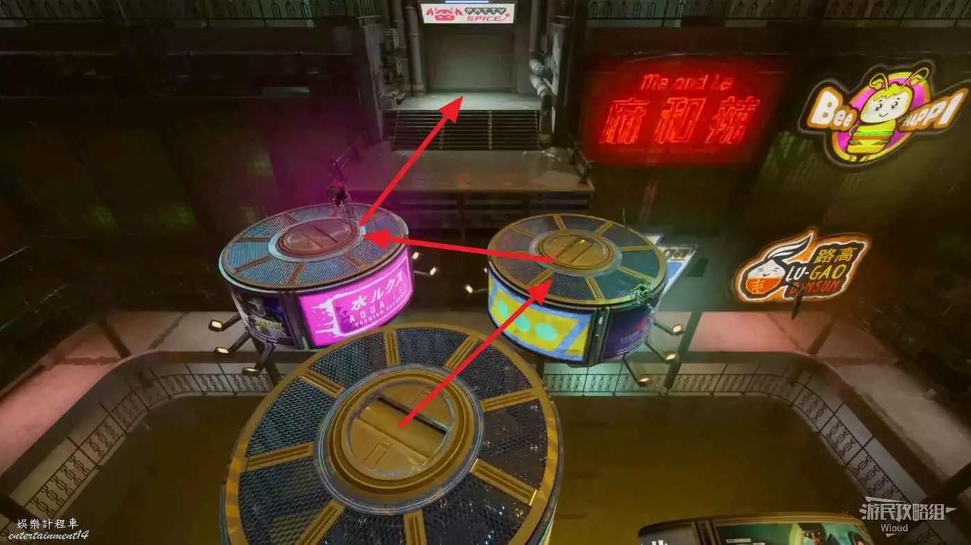 使用鉤爪跟過去,從車輛另一頭出來,沿著下圖路線一直跳到盡頭處的平台,兩個玩家合作與活板門互動觸發劇情。