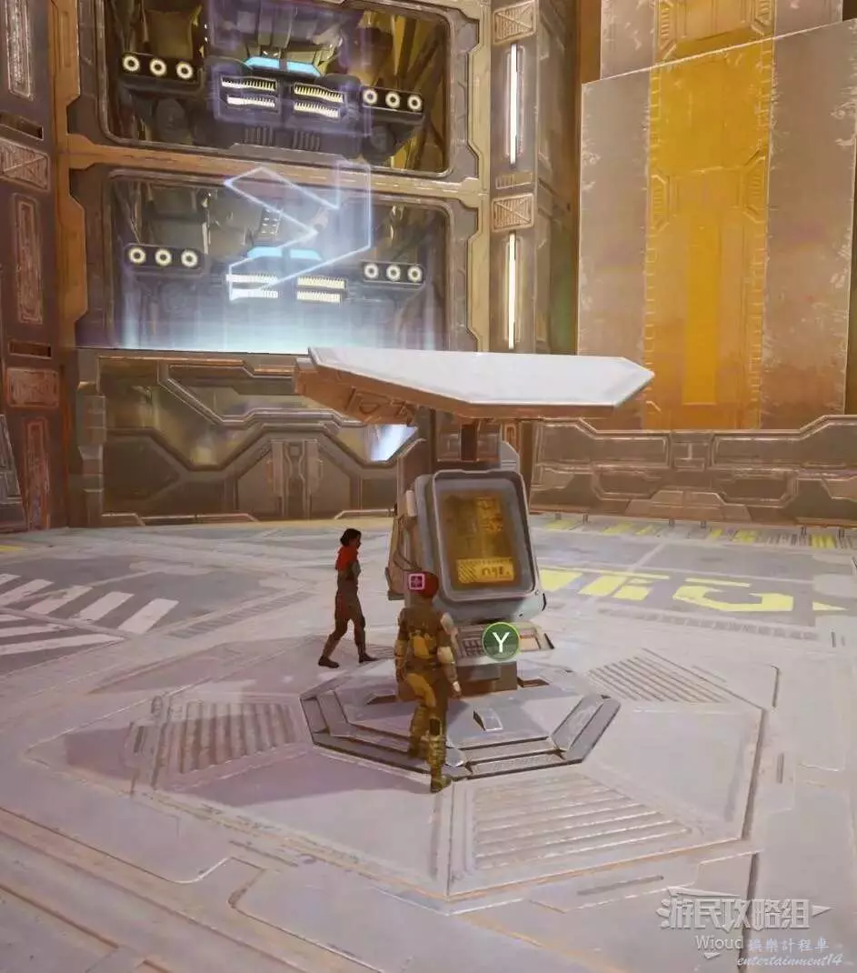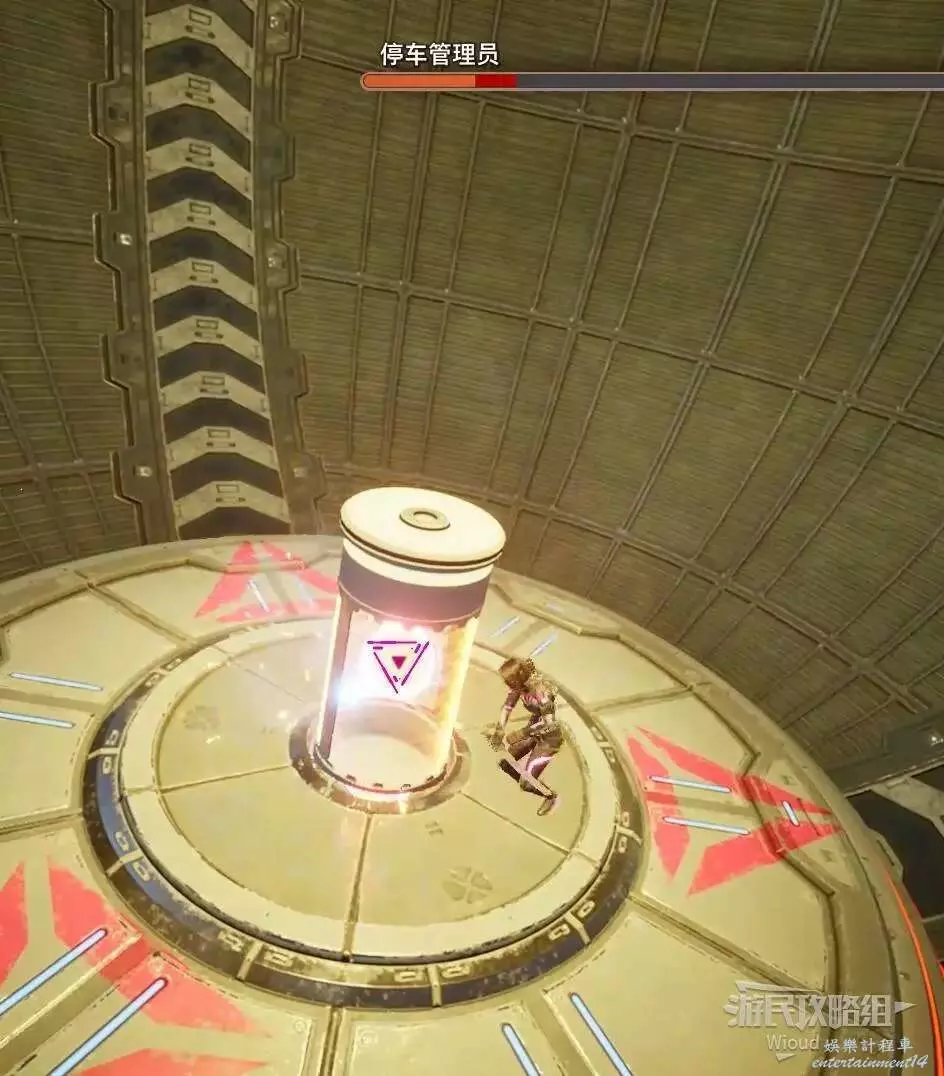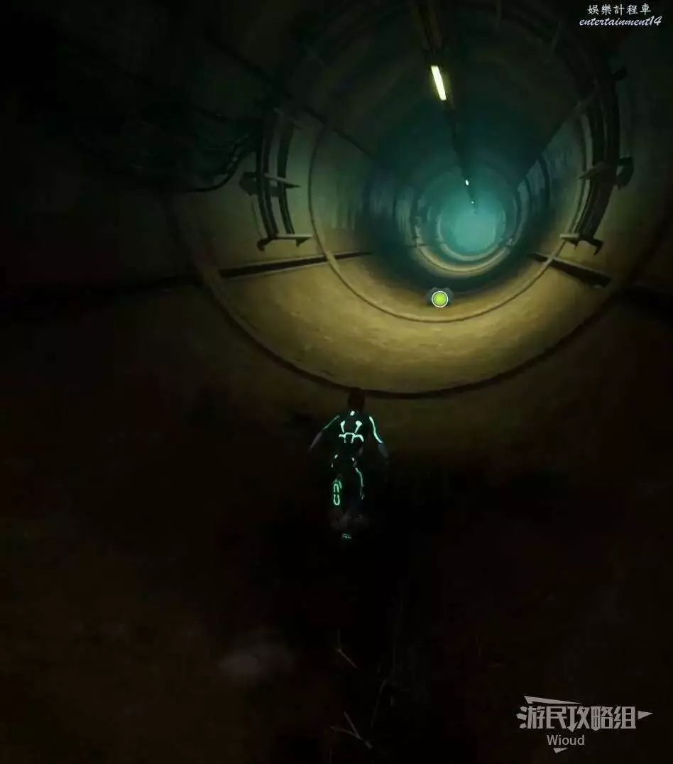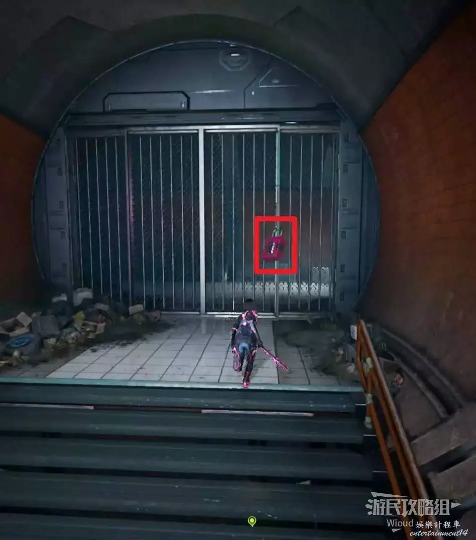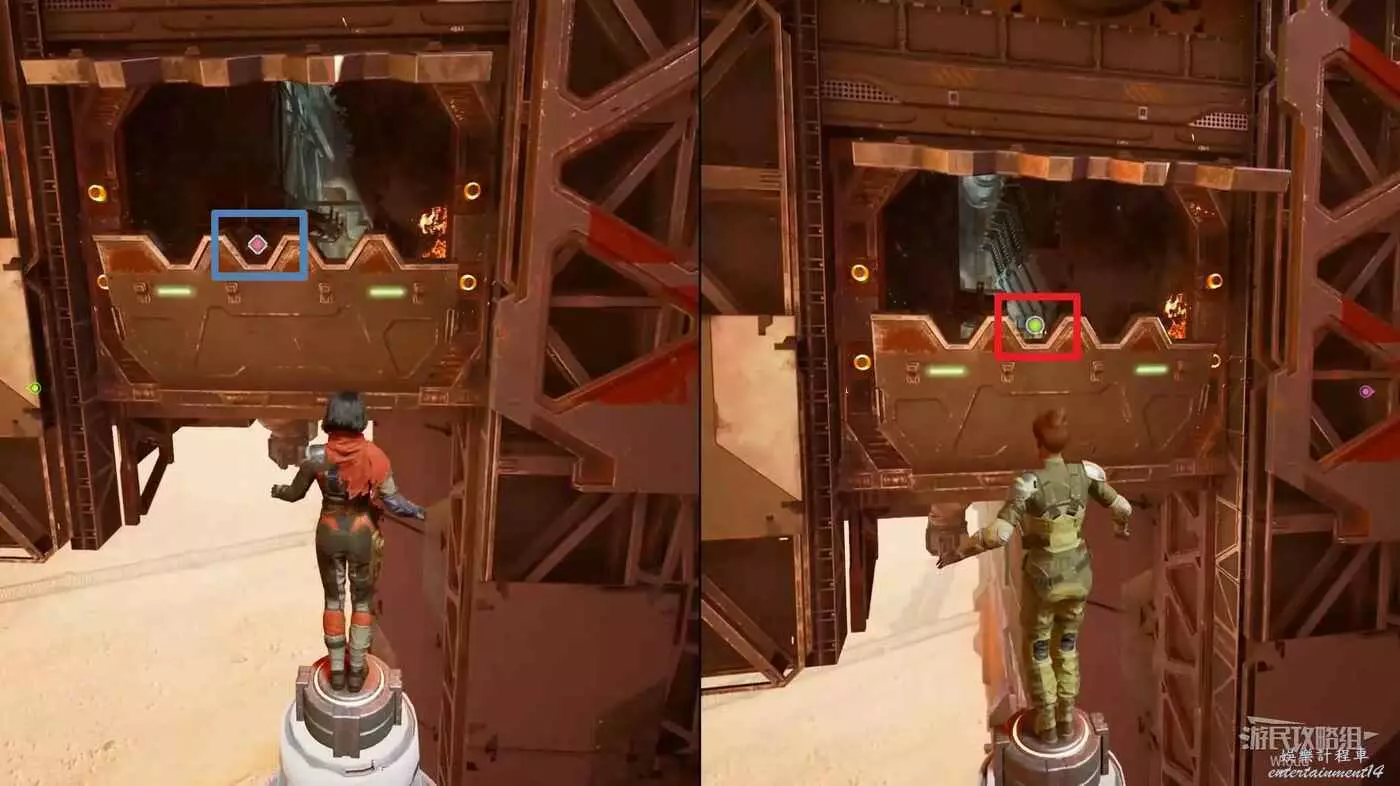 使用鉤爪跟過去,從車輛另一頭出來,沿著下圖路線一直跳到盡頭處的平台,兩個玩家合作與活板門互動觸發劇情。