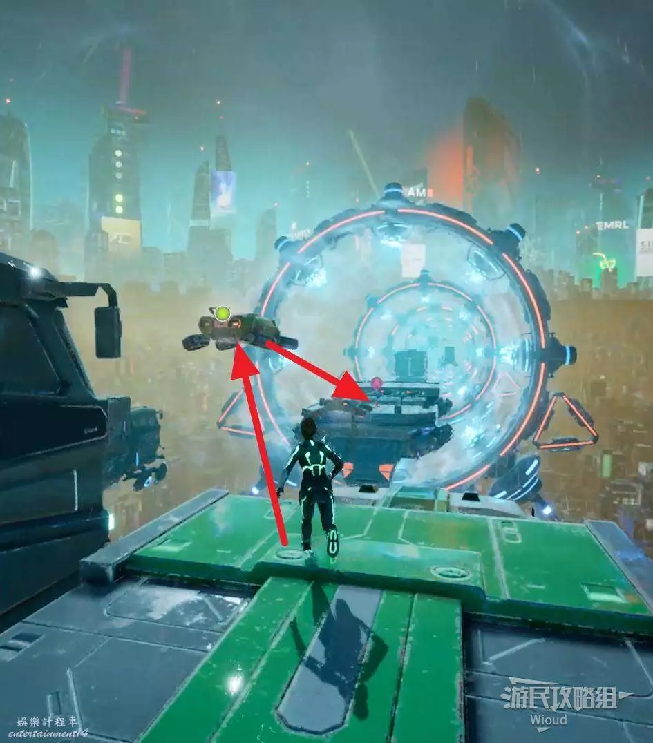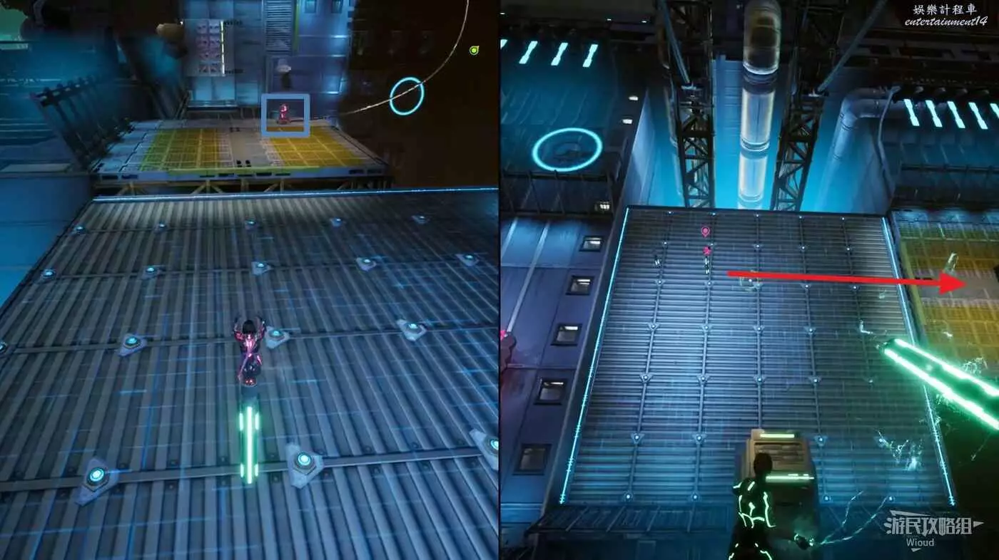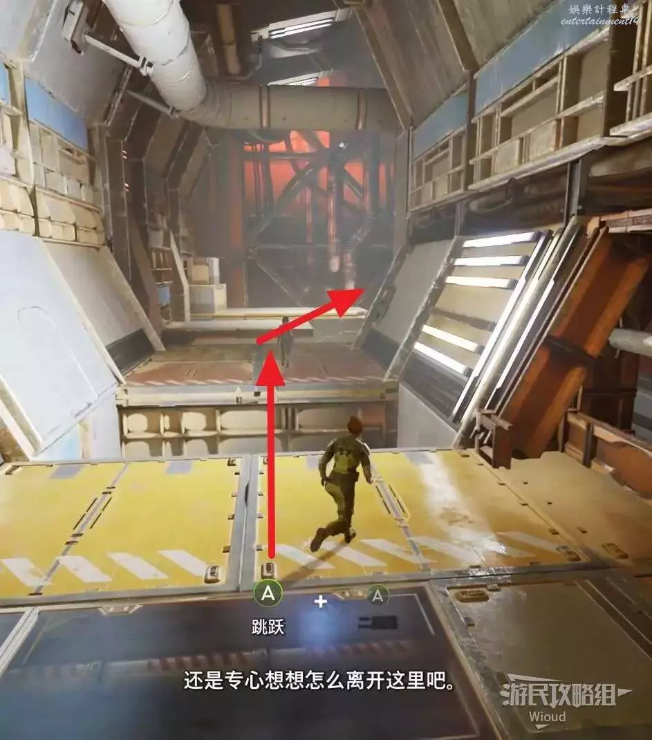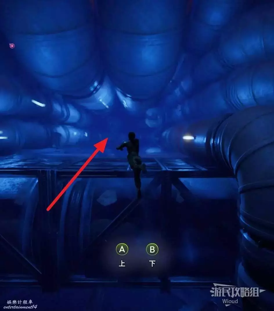 當飛船讓路後,連跳到前面的平台,貼著路徑往右走到頭,跳動右側平台再沿著左邊的牆頂繼續移動,純動作戲。