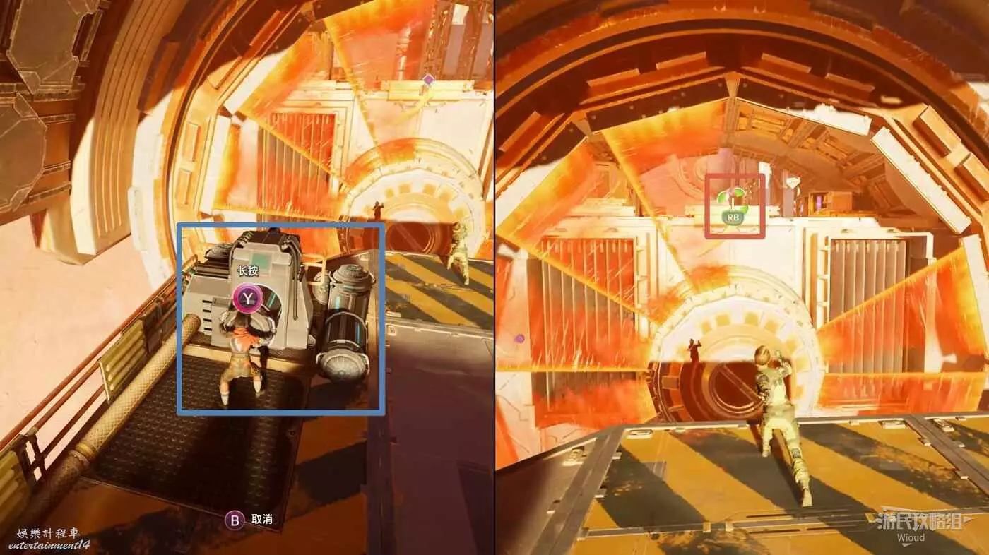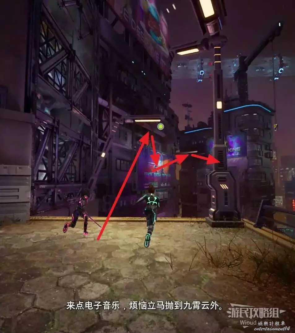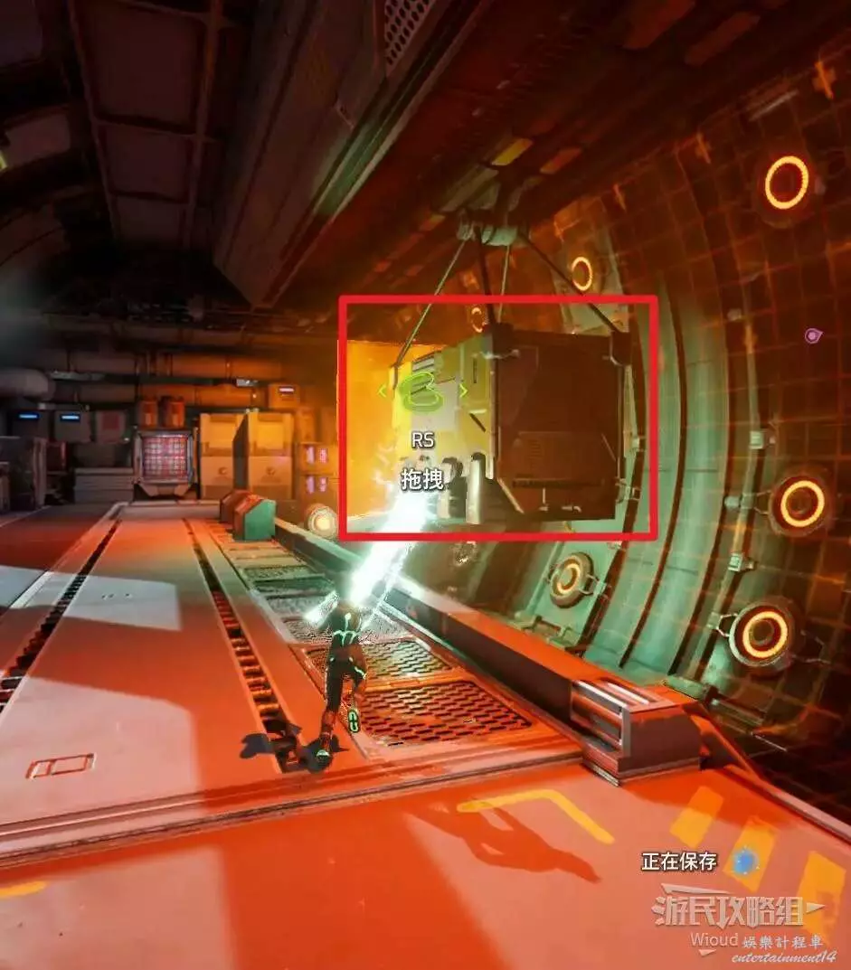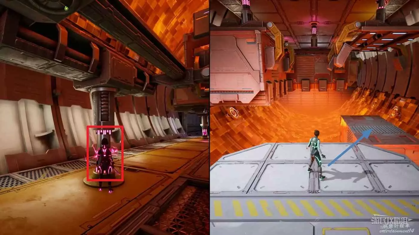 當飛船讓路後,連跳到前面的平台,貼著路徑往右走到頭,跳動右側平台再沿著左邊的牆頂繼續移動,純動作戲。