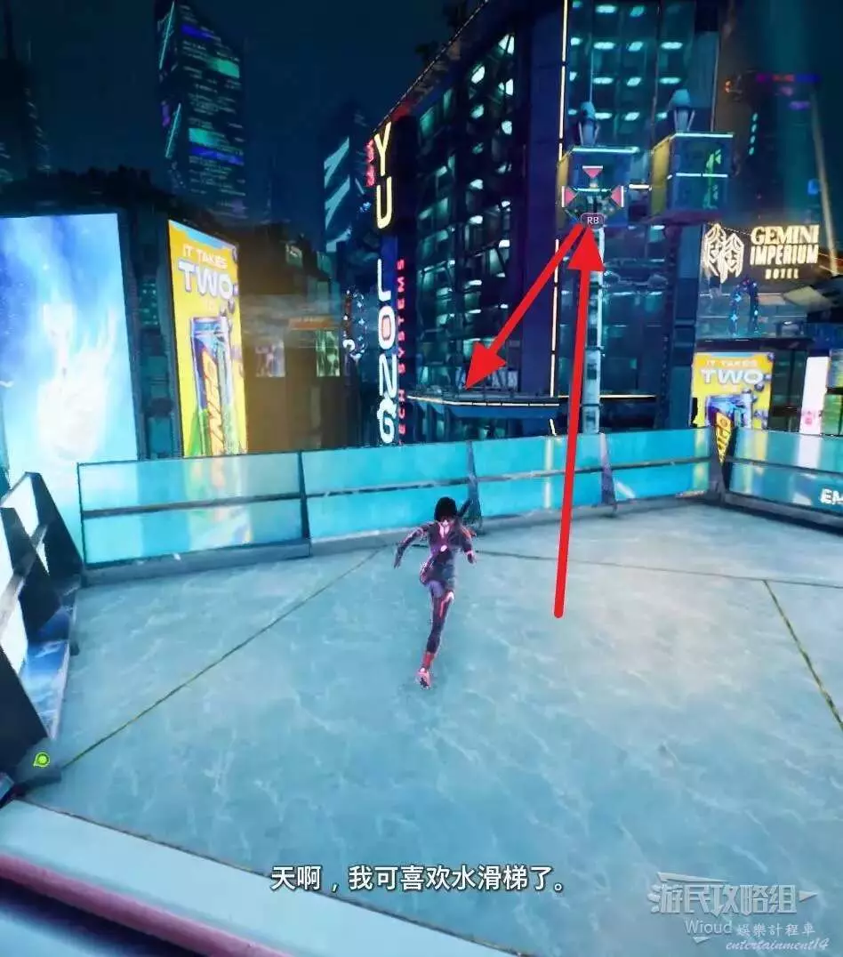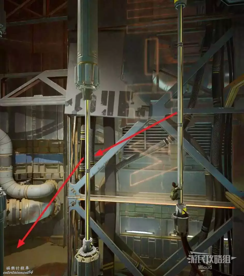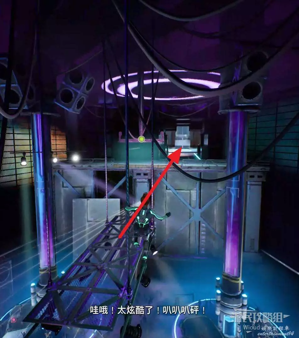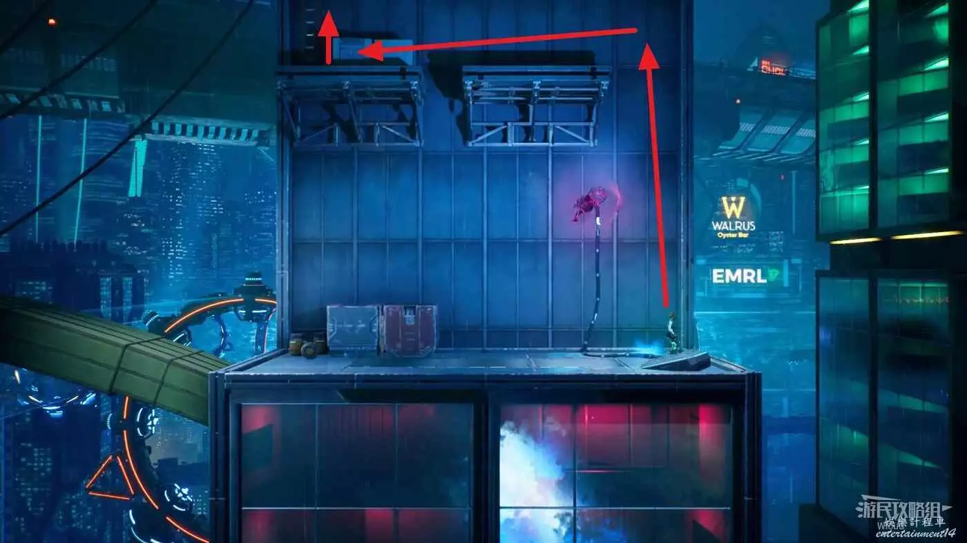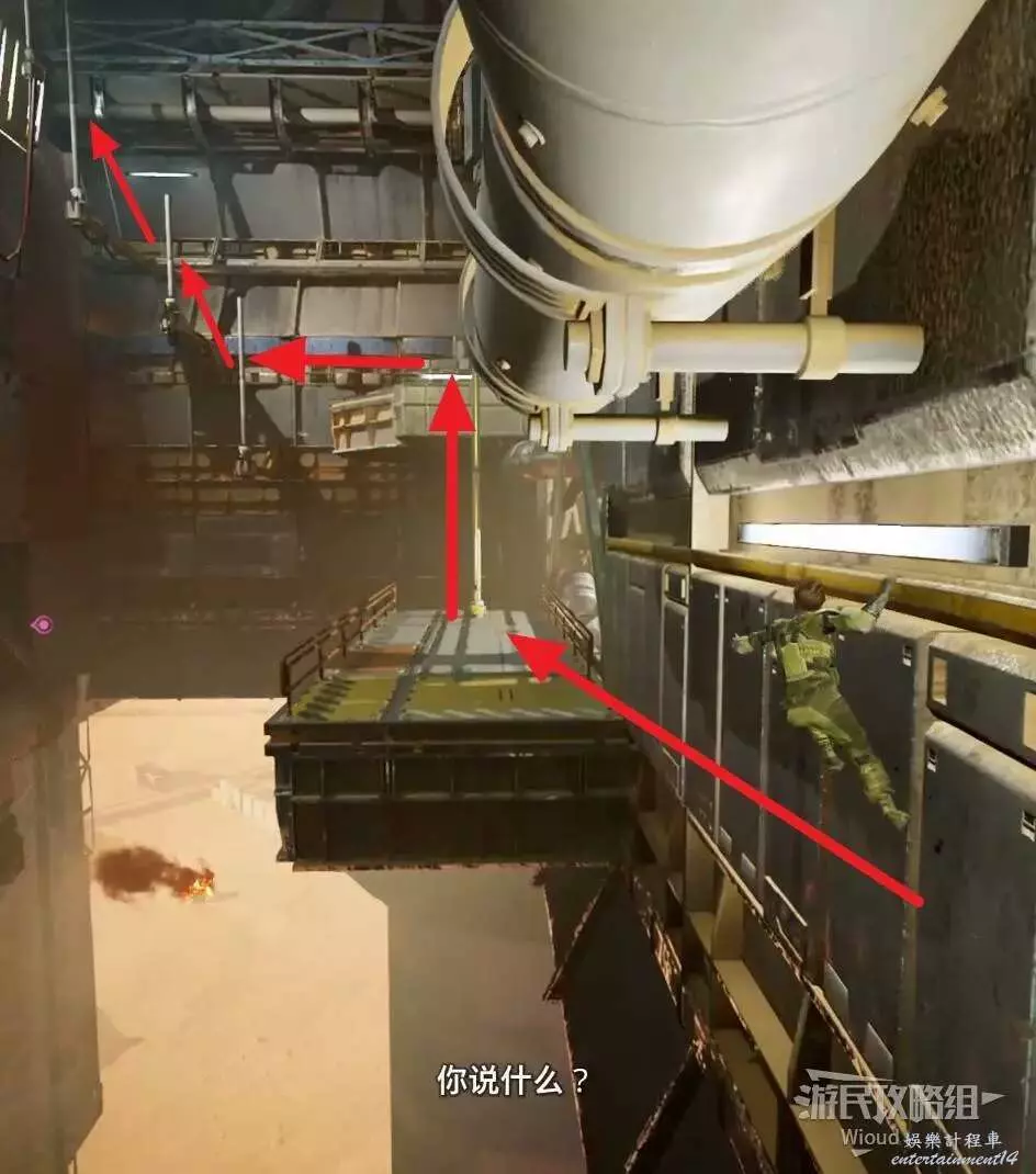 沿著牆壁頂端走到盡頭的兩個柱子上,一個玩家站一個柱子觸發劇情,對面大門炸開會出現一個鉤爪點,直接過去。