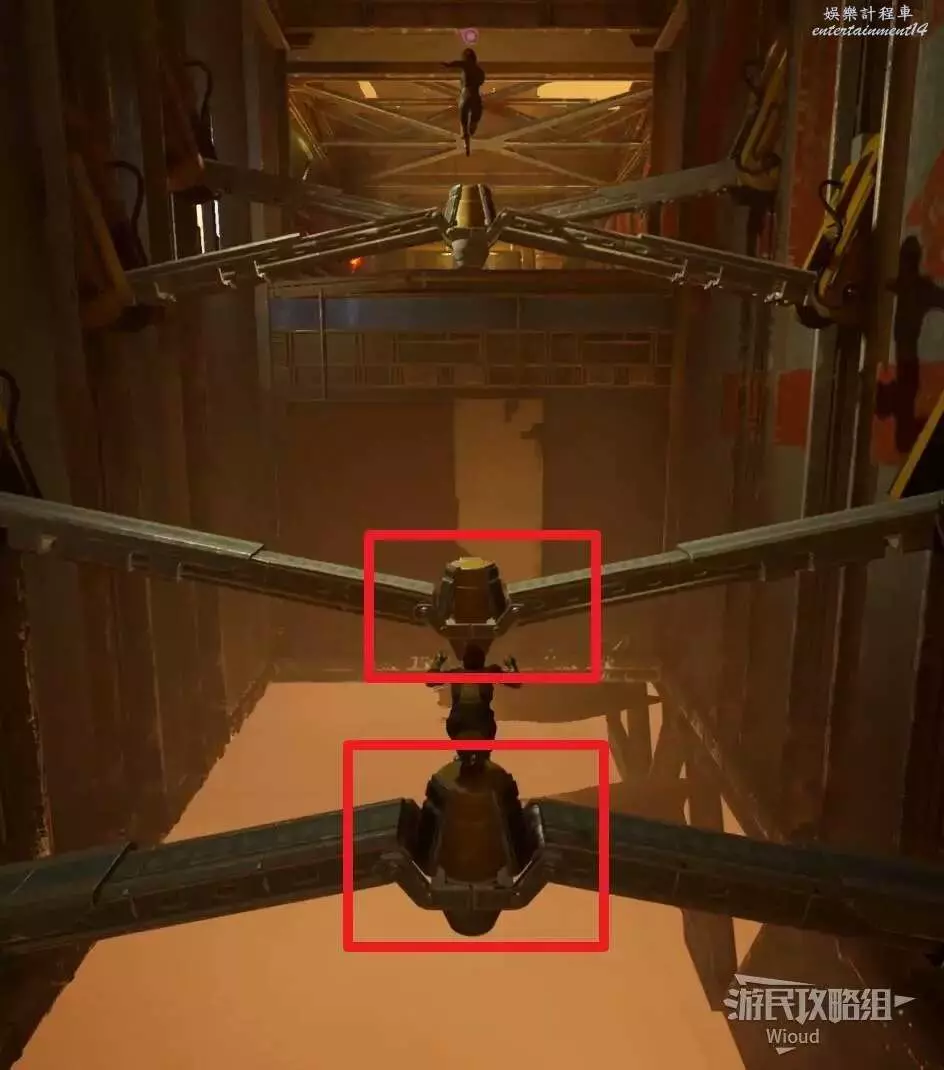 此時另一個玩家需要趁著風扇缺口到達鉤爪點時,打一個提前量直接使用鉤爪移動到風扇另一端的平台。