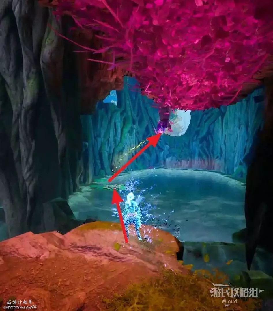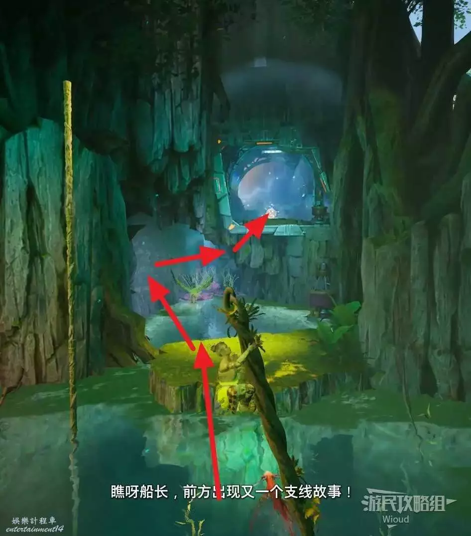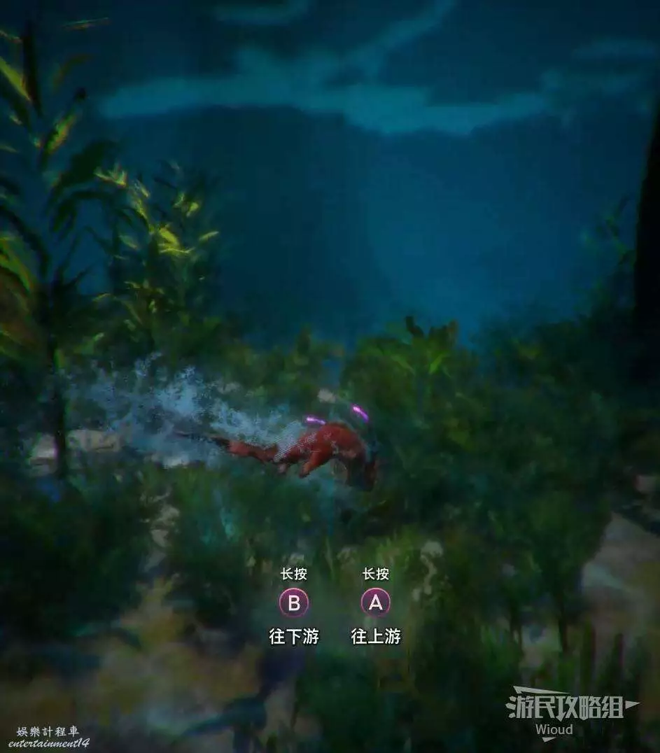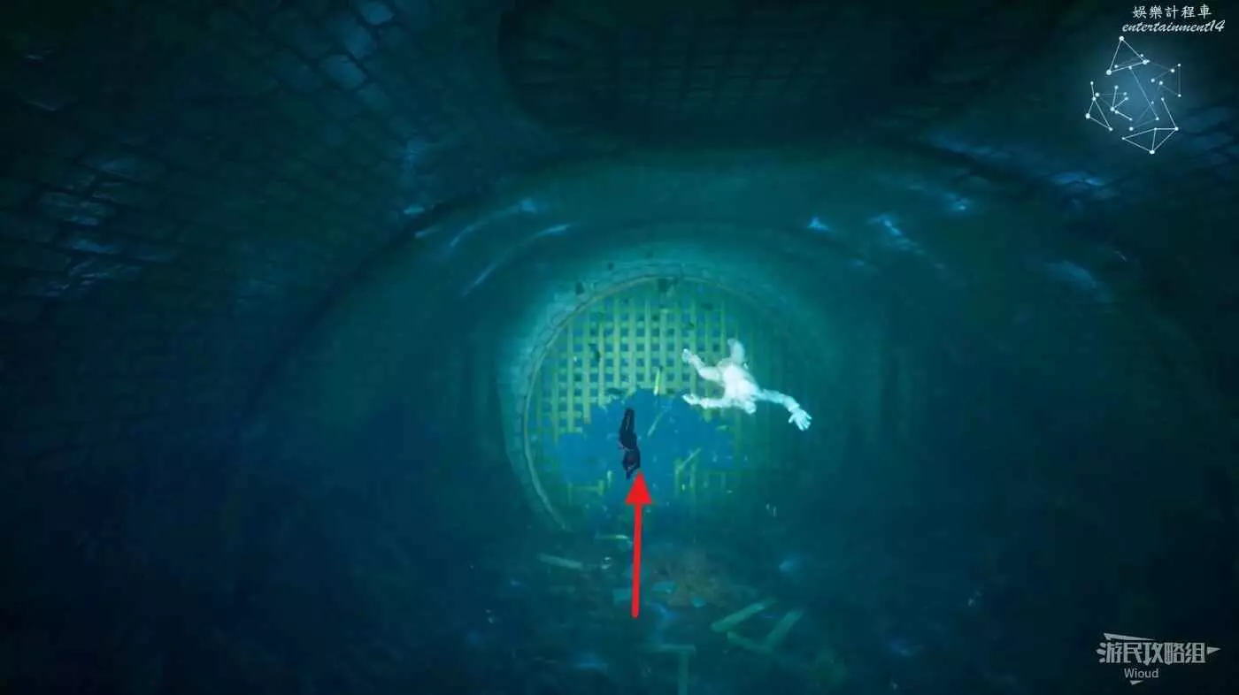 掉入水下後,仔細觀察周圍環境,有一個明顯的洞穴,這就是後面的正路。