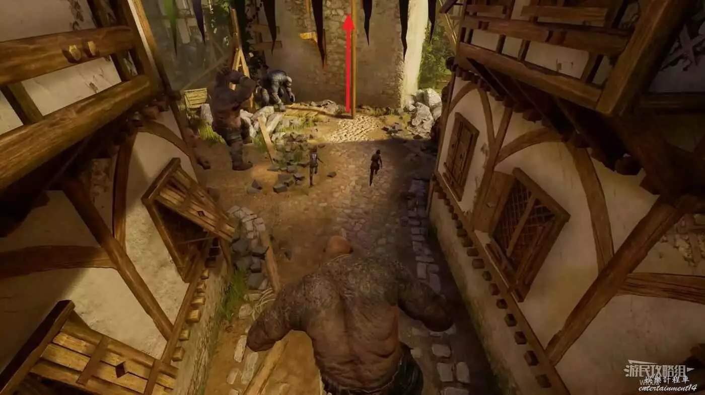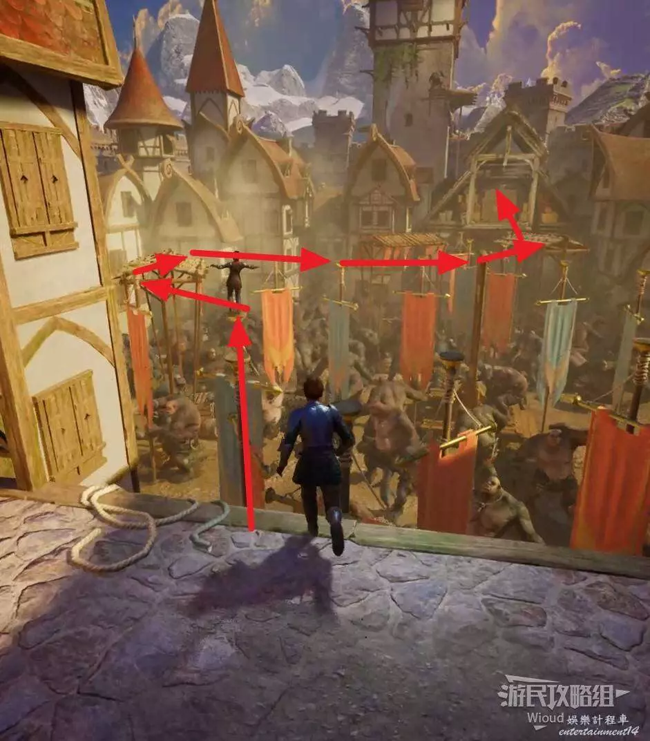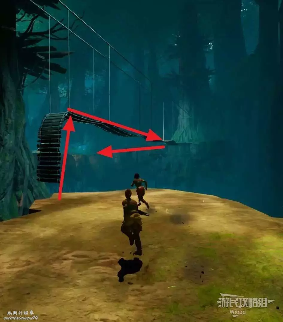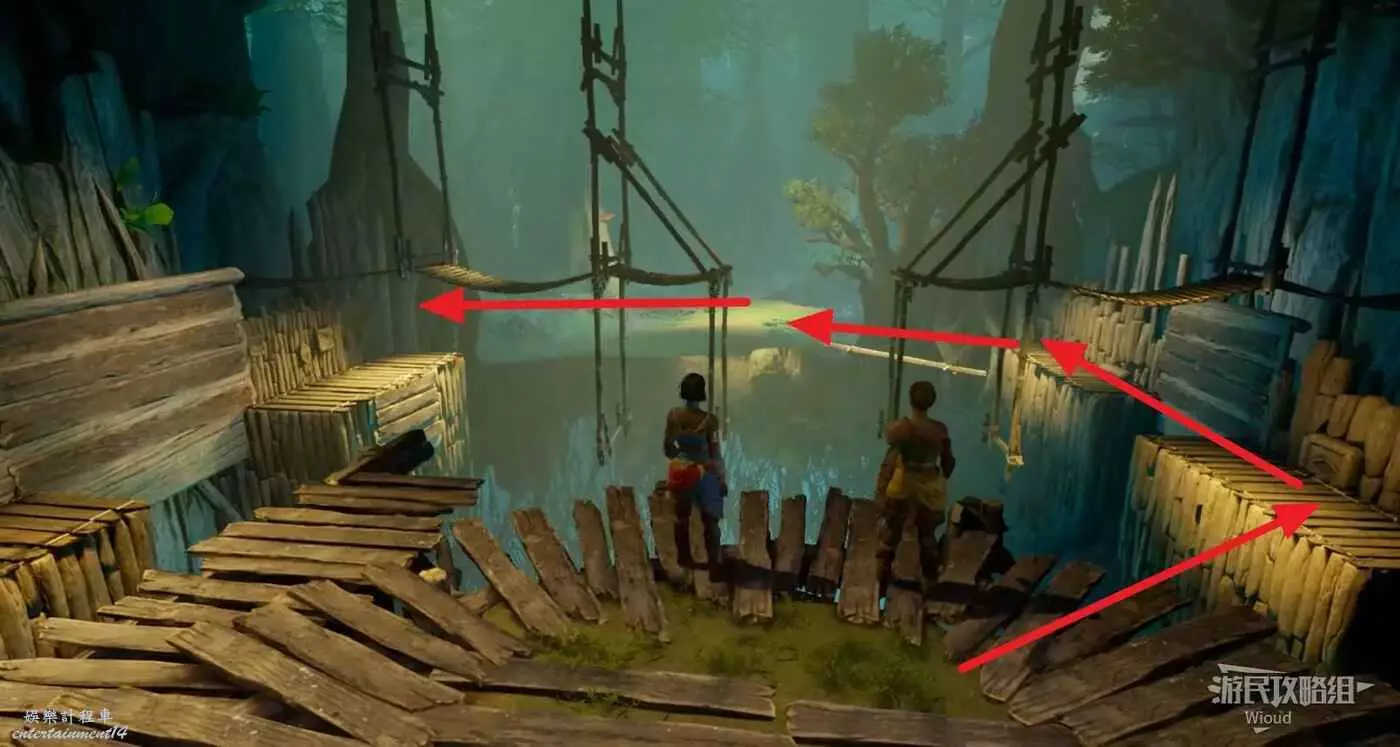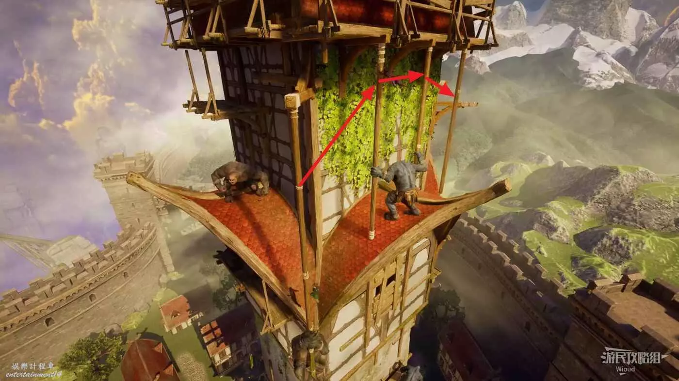 到達集合點一起按下互動鍵,推開大門再次被巨魔追逐,爬到盡頭爬杆子到高處。
