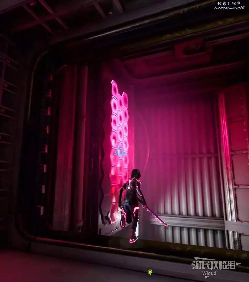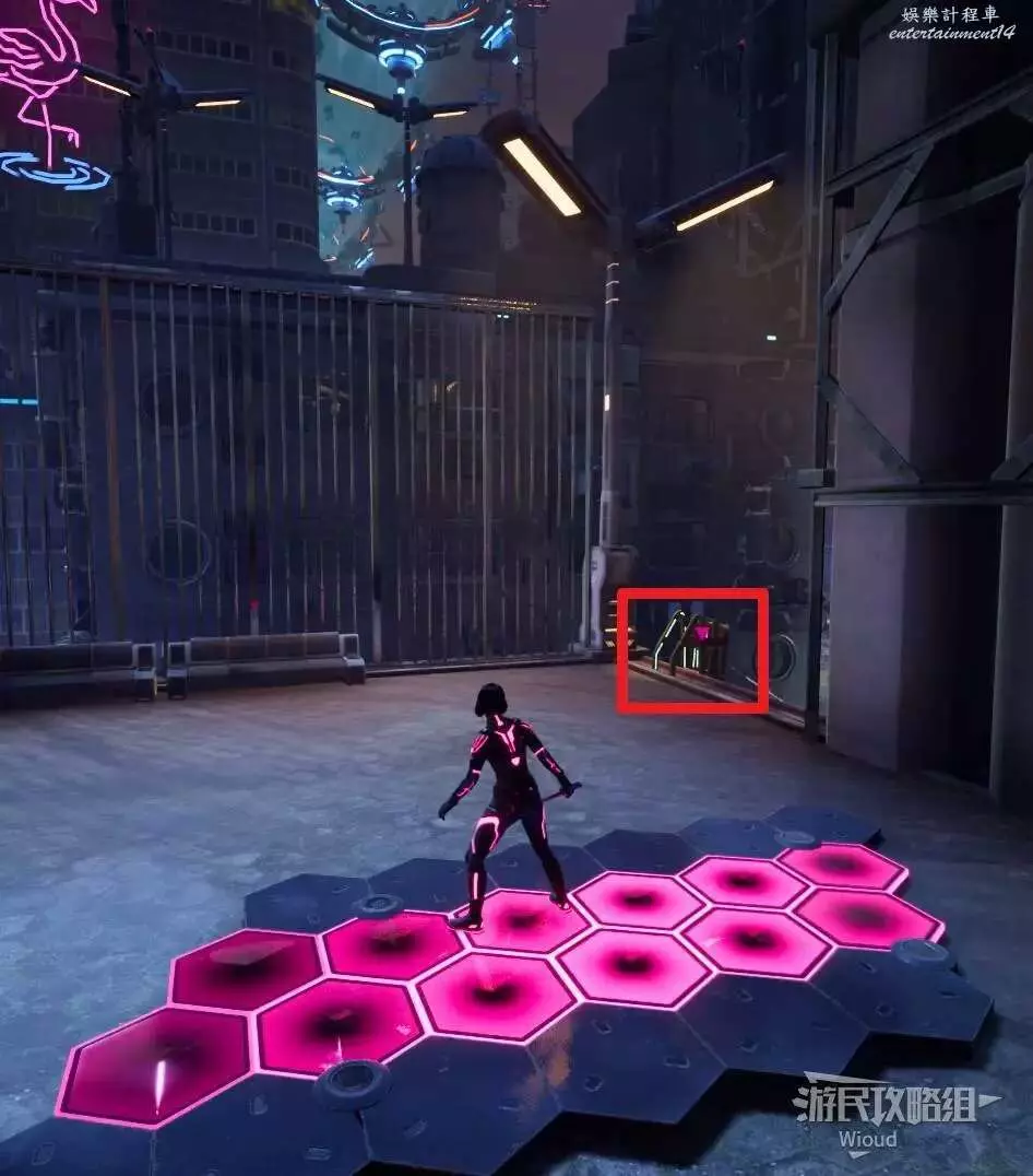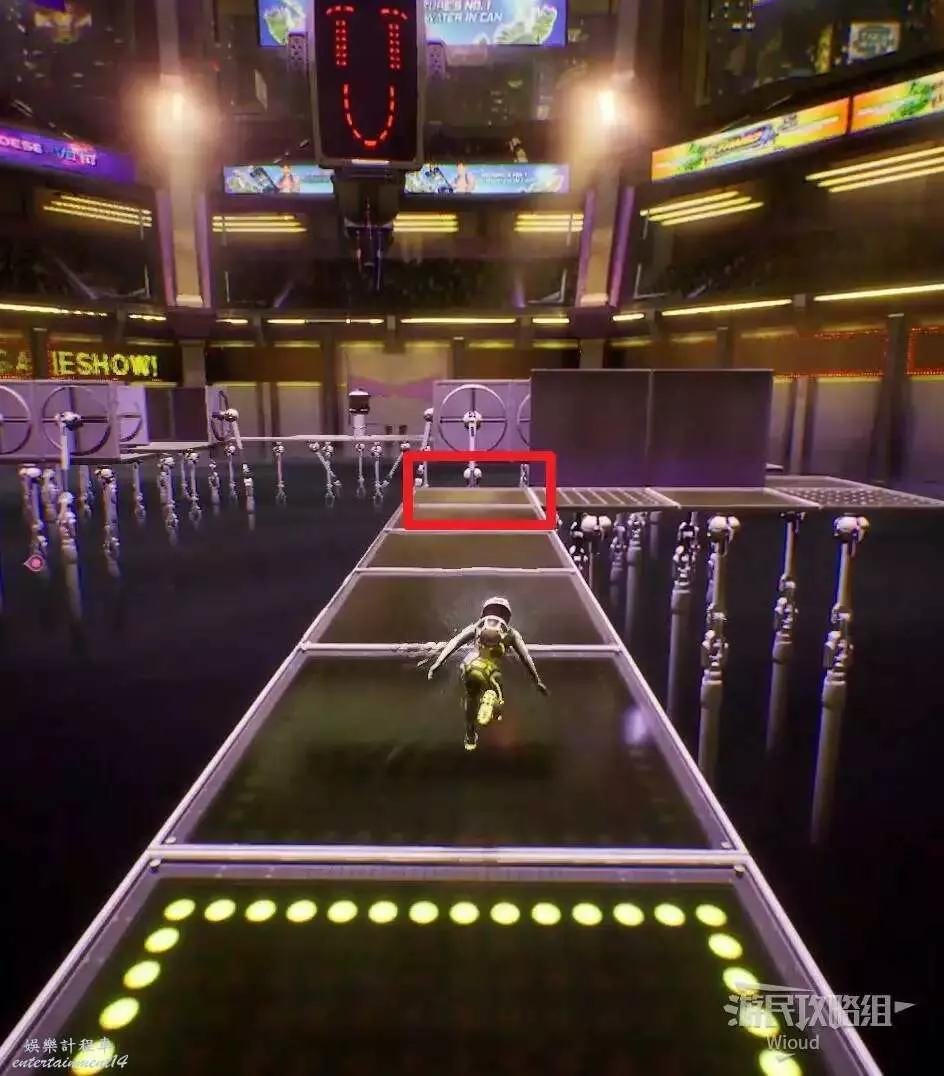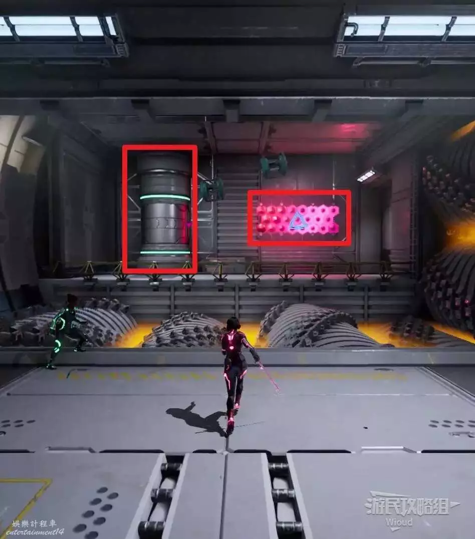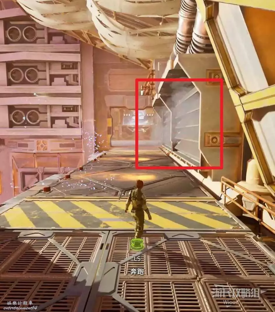 拐角盡頭一個活口板塊,會重複彈起收回的動作,等待板塊彈起時跳過去或者直接連跳+衝刺也能扒邊過。