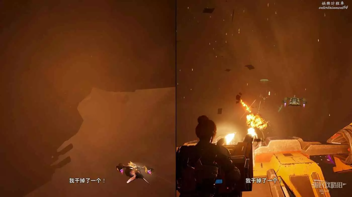 此時一個玩家負責開飛船躲避障礙物,一個玩家負責操控機炮攻擊敵人,到達終點完成第一章的第一個關卡。