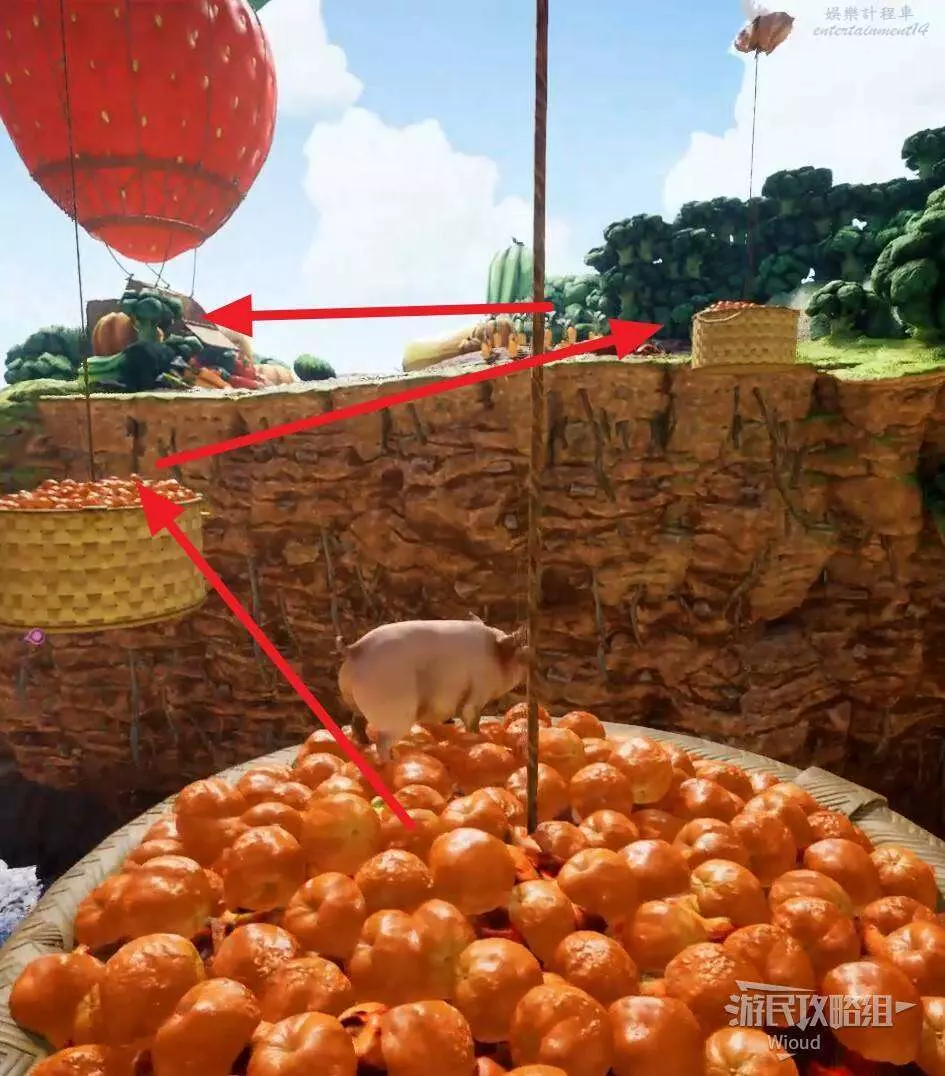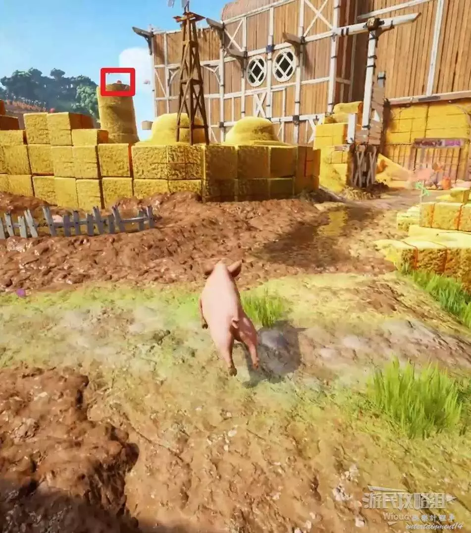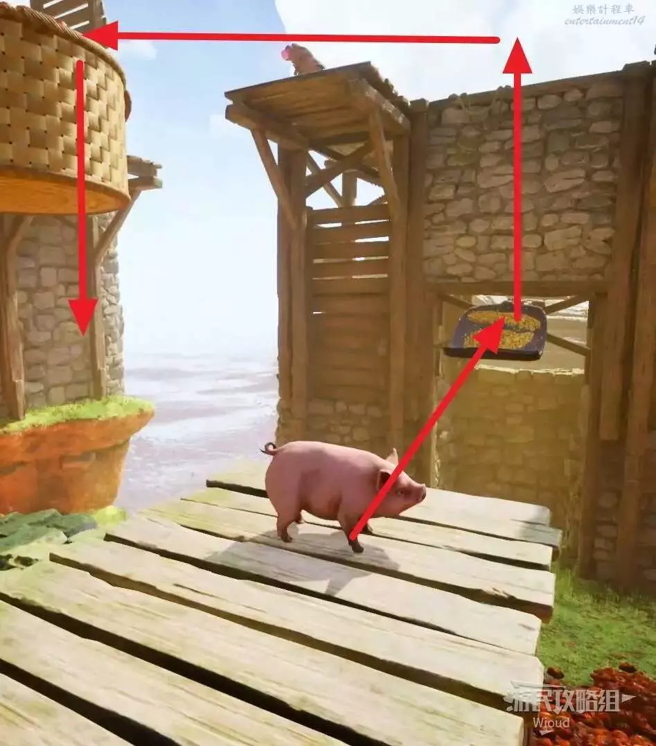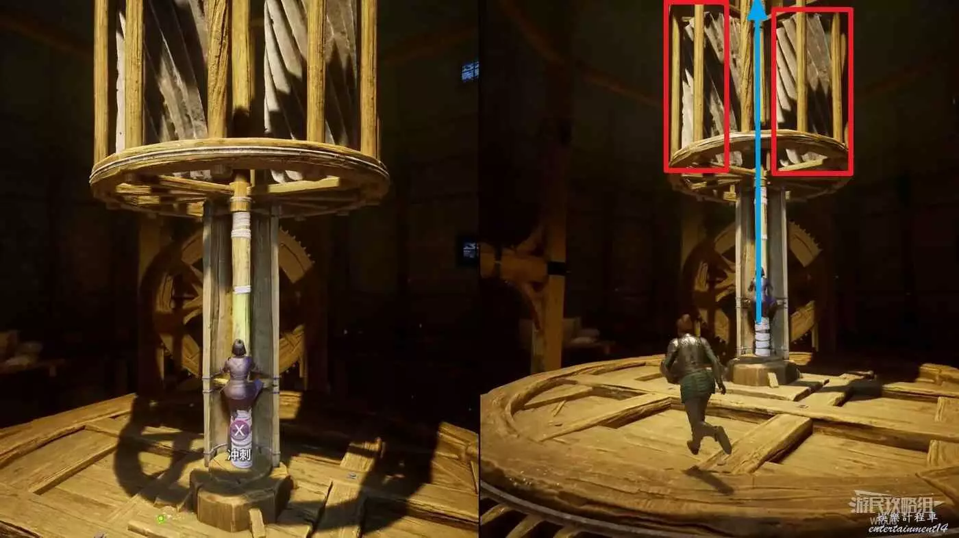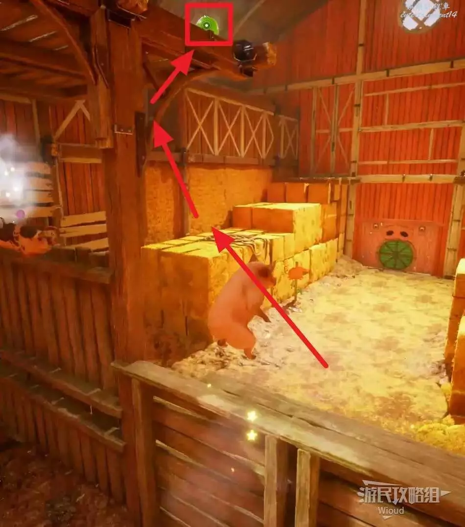 被吸入一個房間後,通過房間左側的稻草堆移動到高台,通過中間的柱子往上爬。