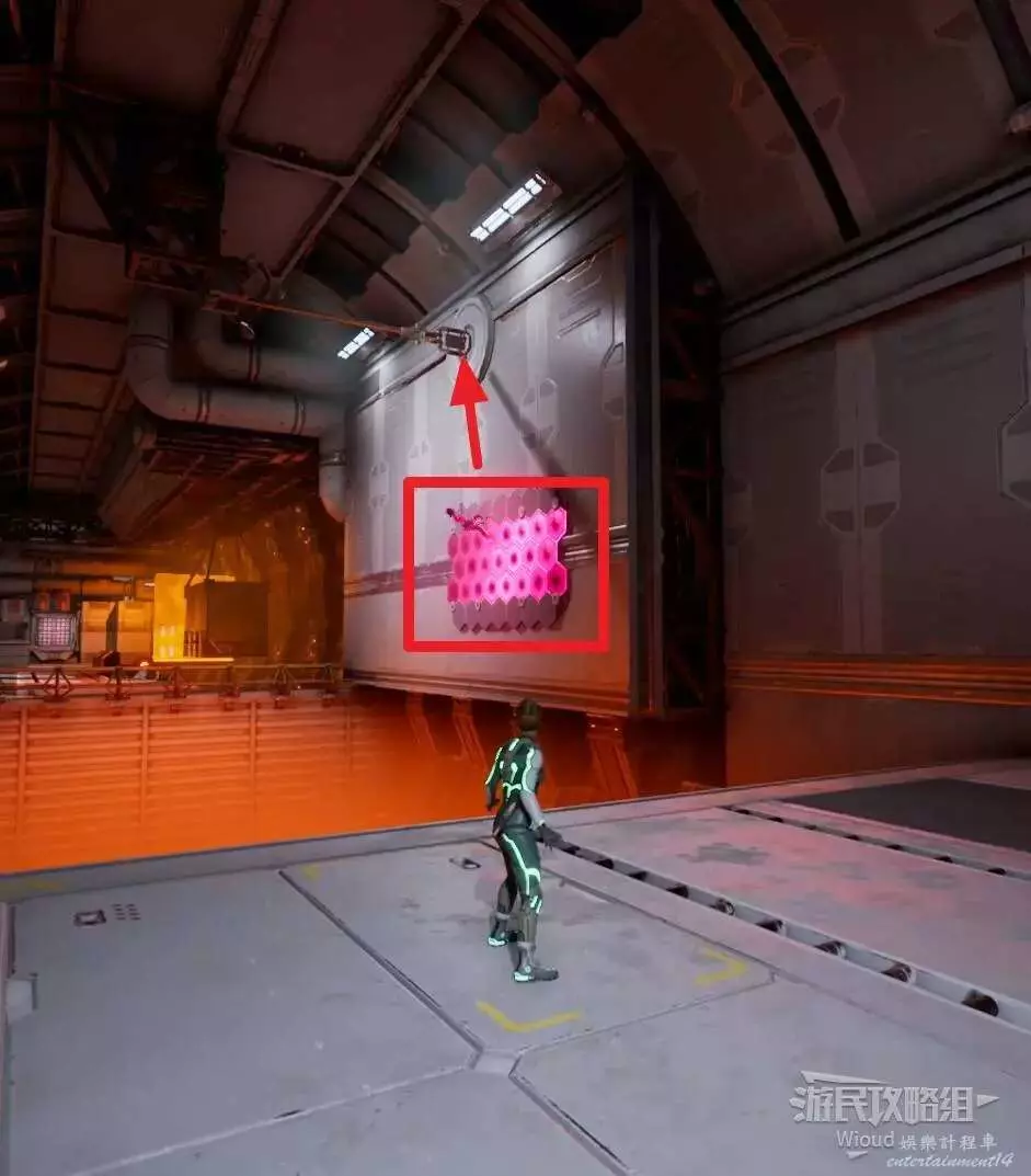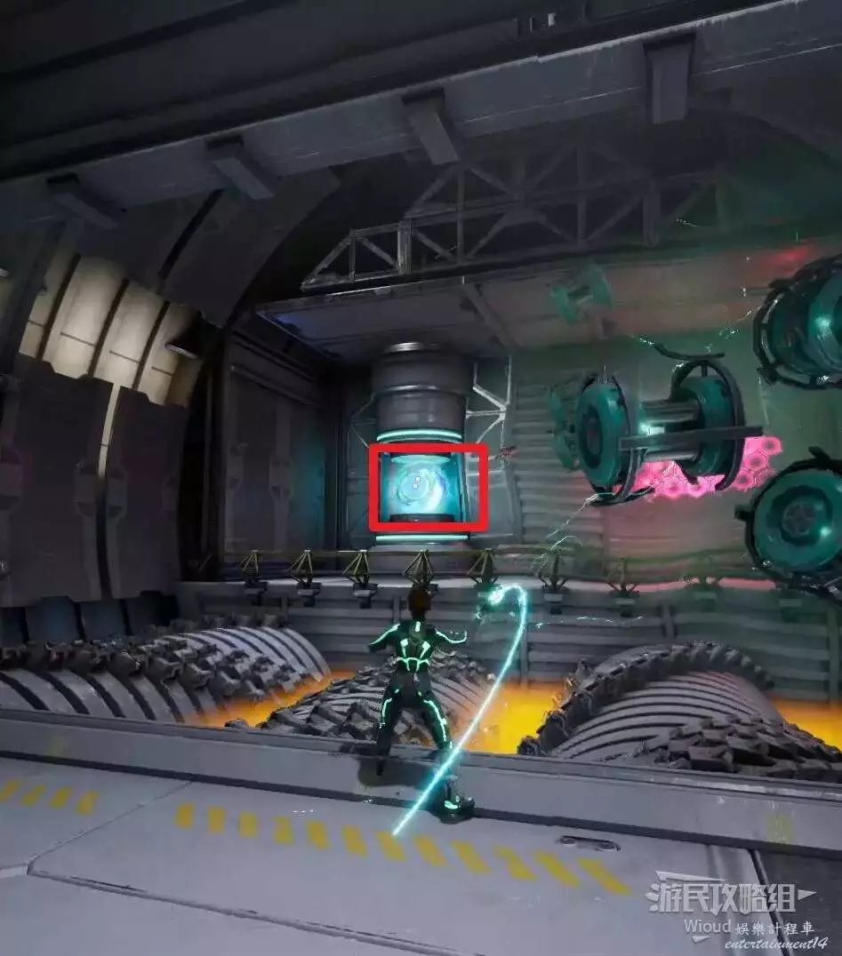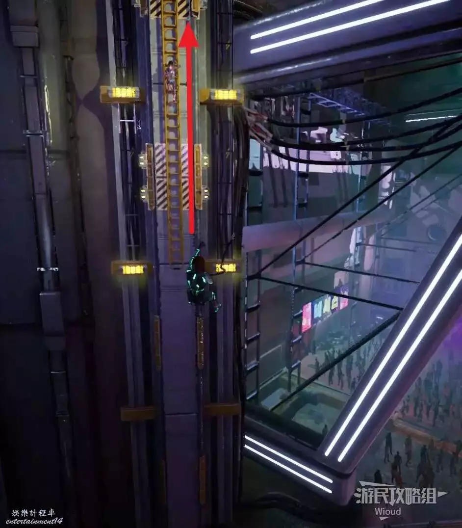 走過一段牆頂,攀爬梯子到達新機關位置,我們需要跳到機關中間的黃色月台上,月台有吸附功能,不用爬跳歪。