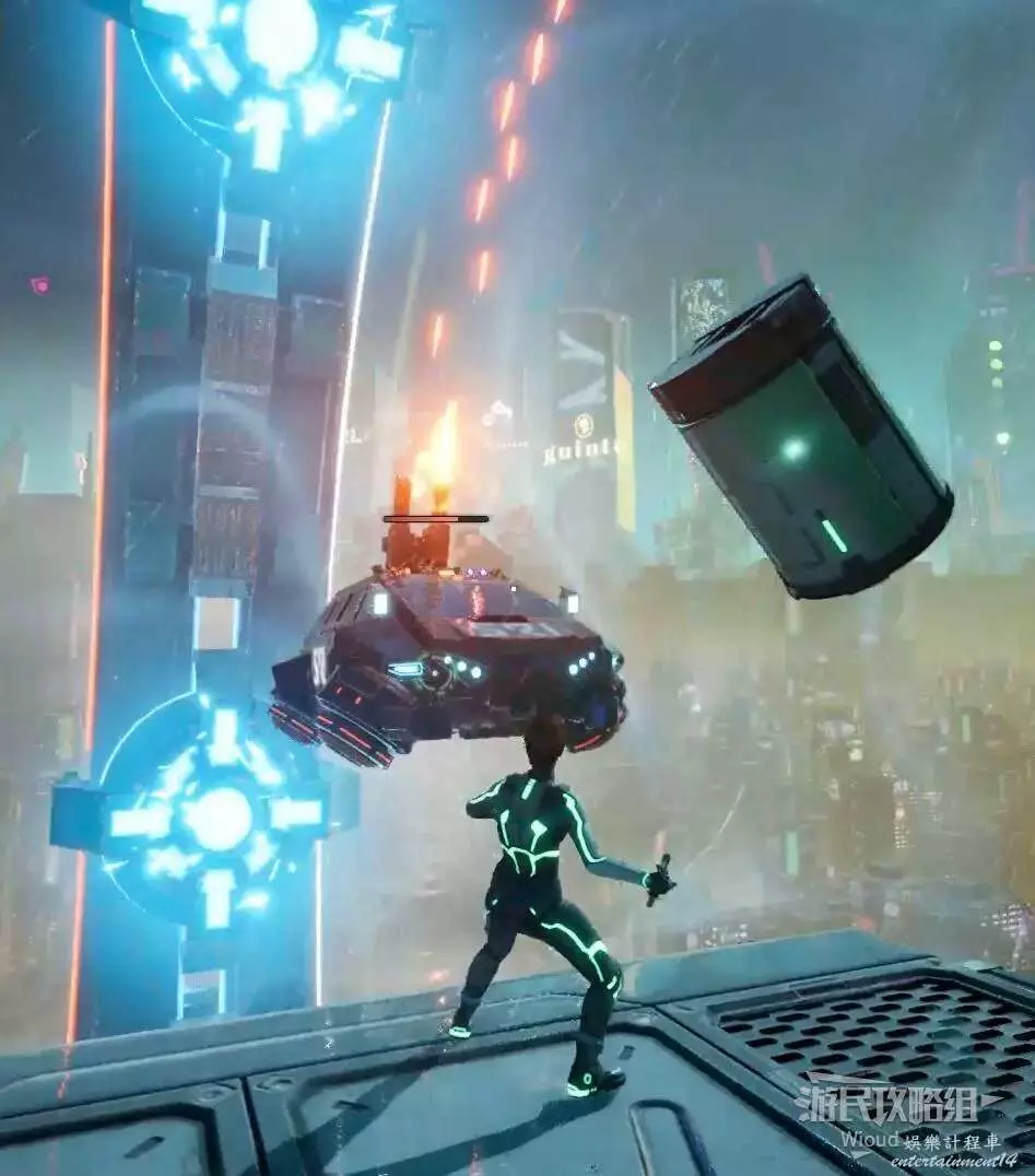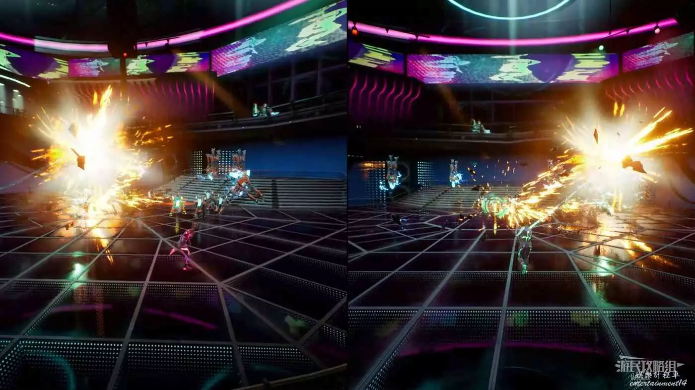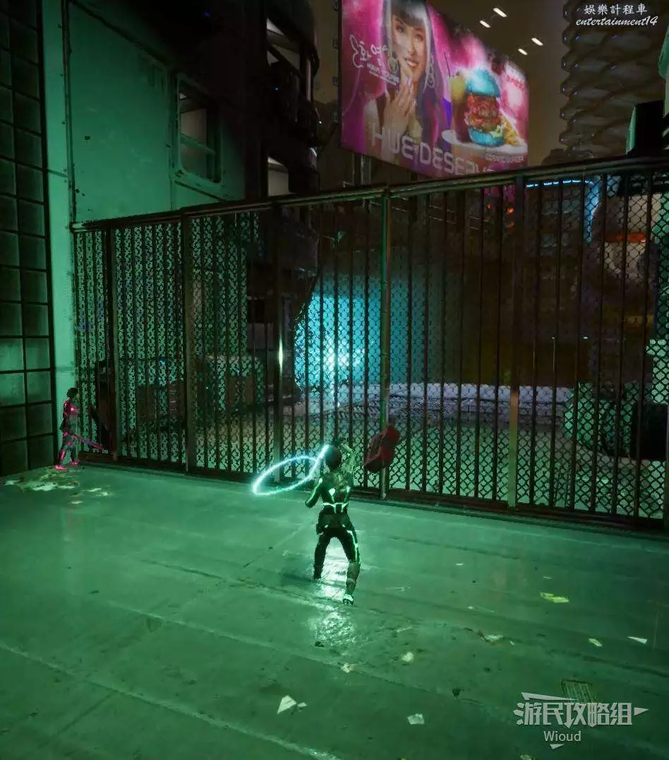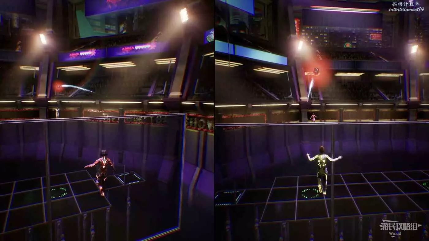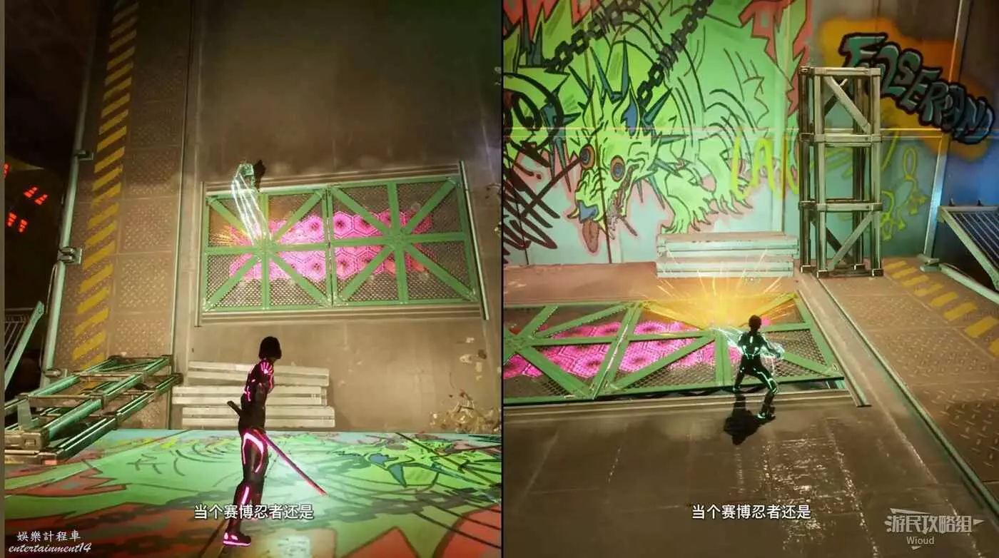 第二章是賽博風格關卡,人物也會出現新技能,綠色角色可以通過長鞭拖拽物體,紫色任務可以用刀攻擊或吸附到紫色的板塊處。