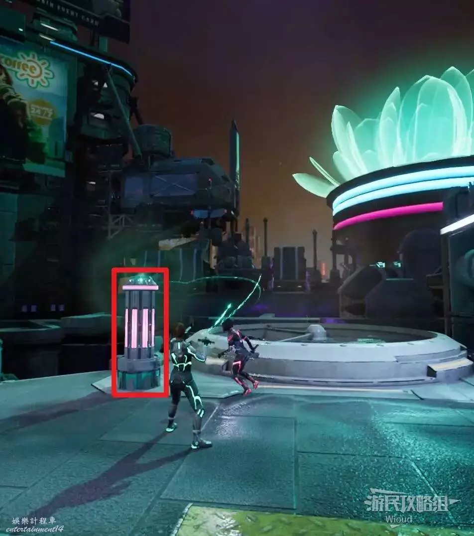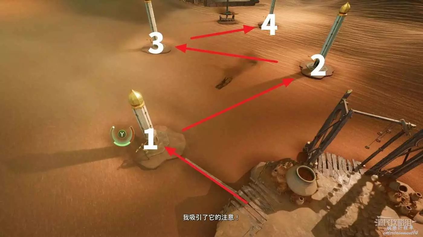 跟隨下圖箭頭移動到左前方的柱子旁。