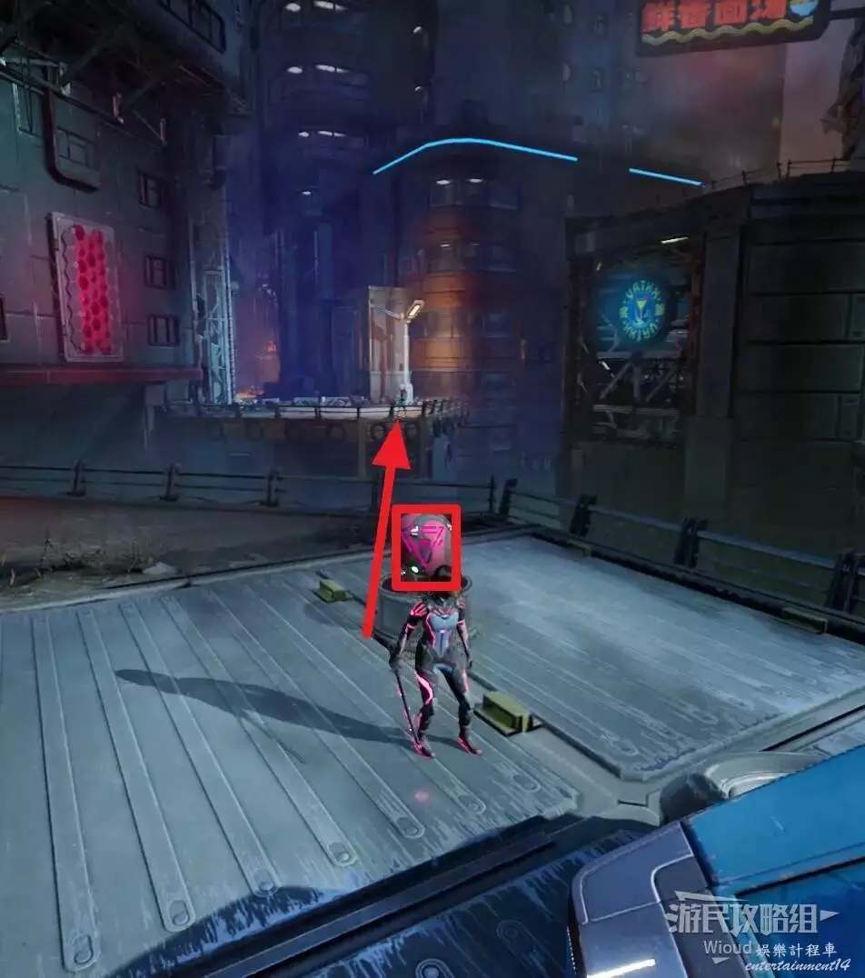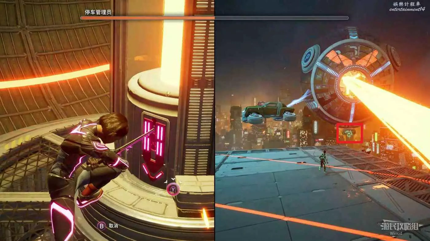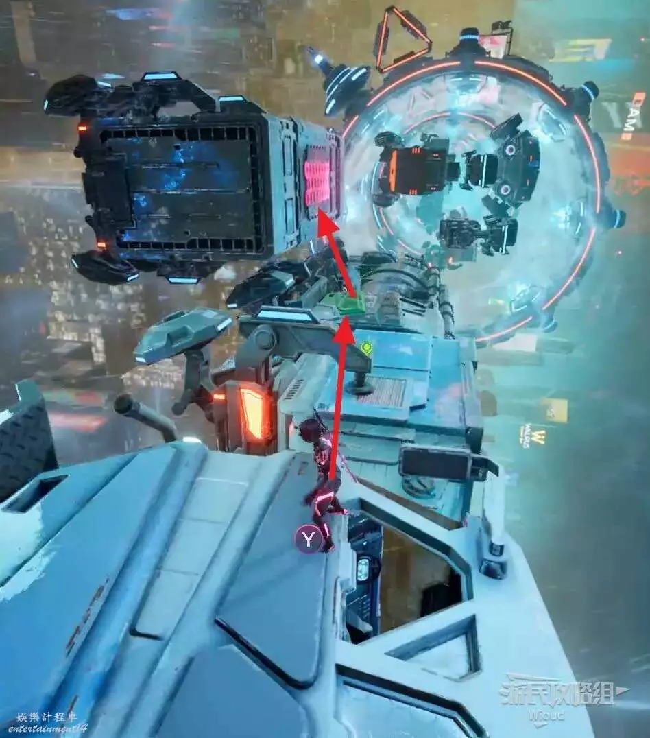 此時紫人需要移動到左前方的板塊上,通過旁邊的車做跳板,跟隨箭頭移動到車輛右側攻擊紅框所示的機關。