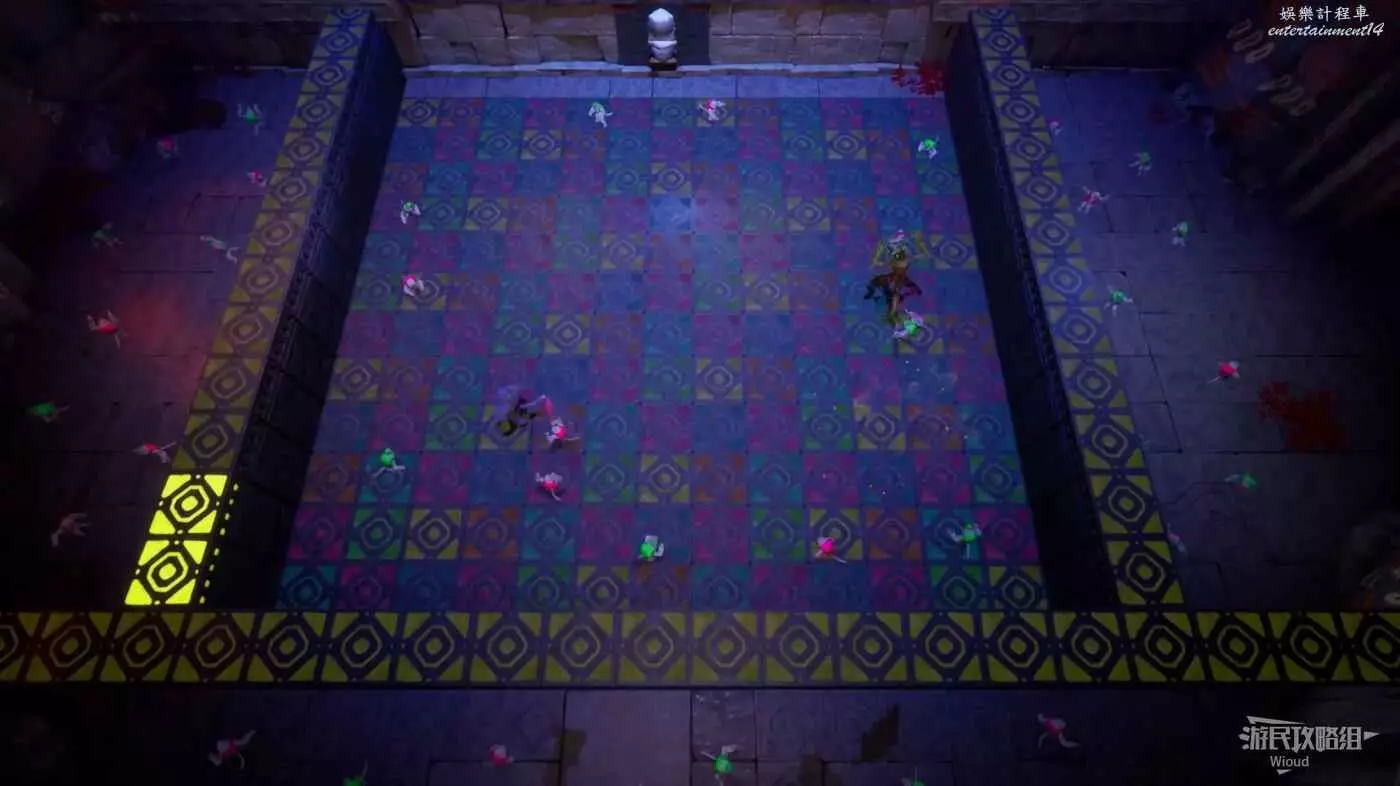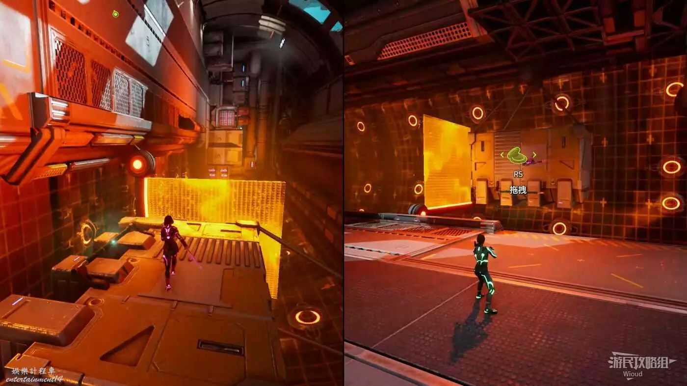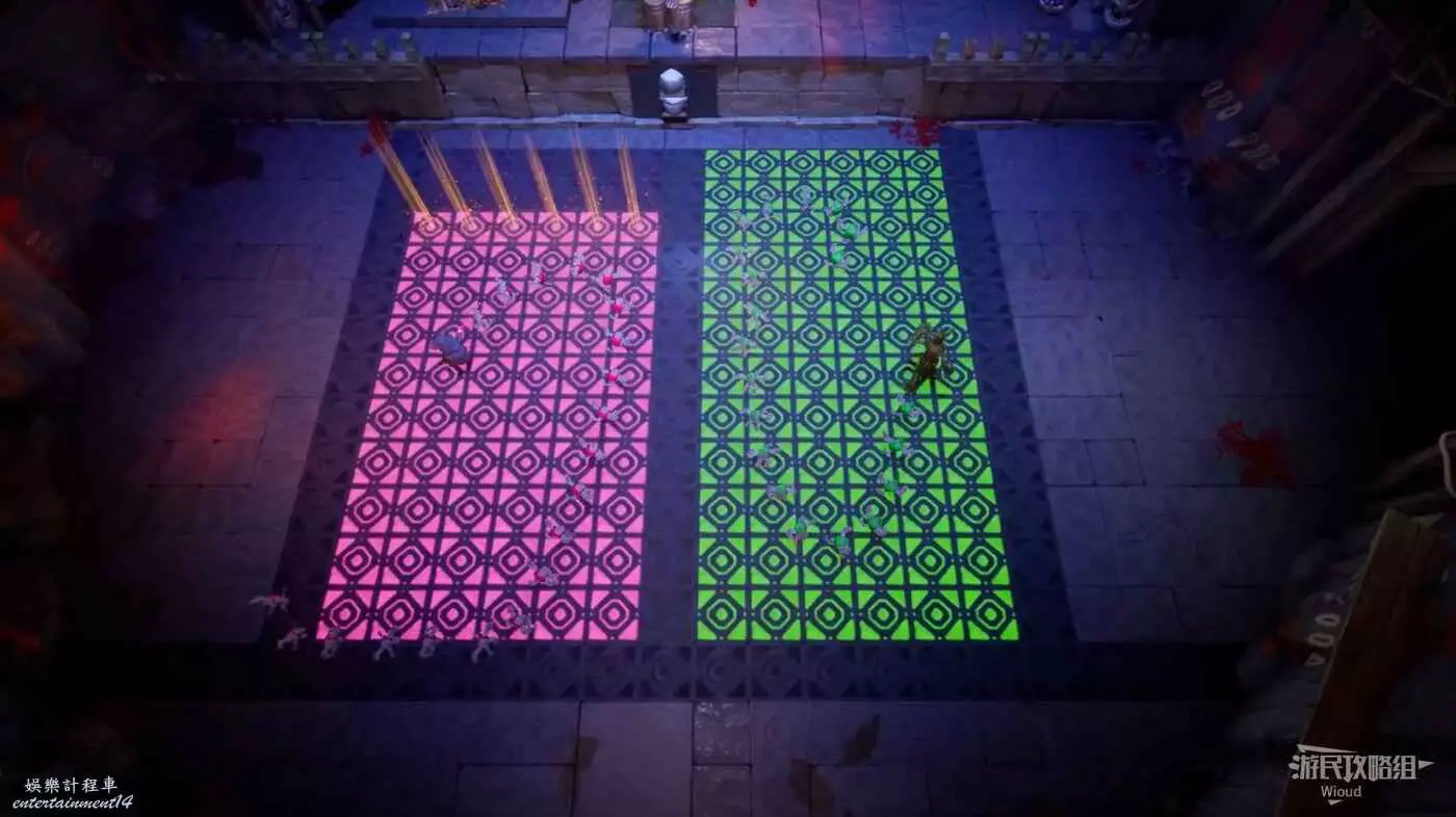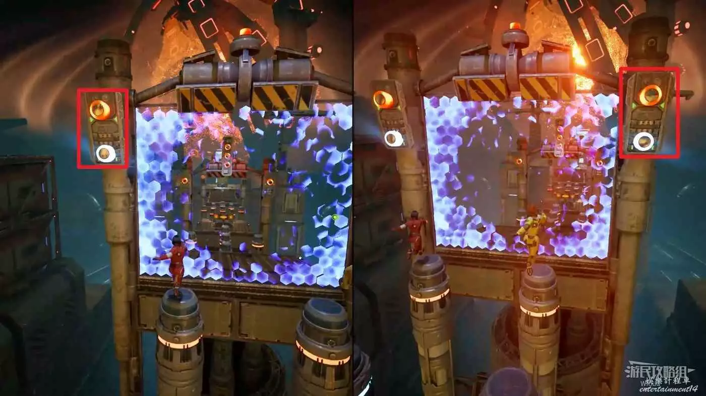 到達另一側房間,紫人先吸附地面的板塊與綠人處於同樣位置,然後綠人向左拖拽機關,左側會顯露一個紫色柱體,紫人直接攻擊柱體,然後重複右側操作打開大門。