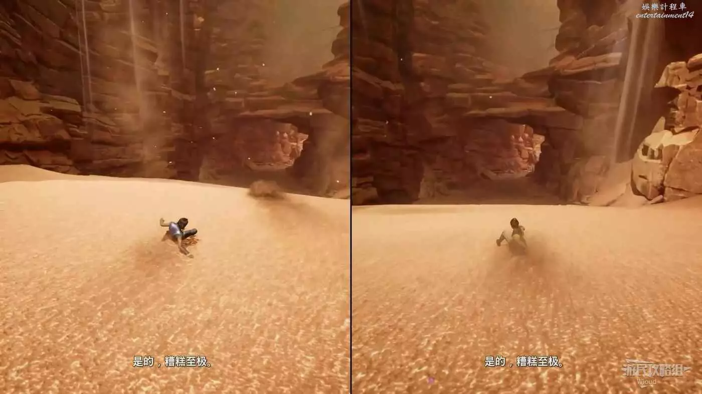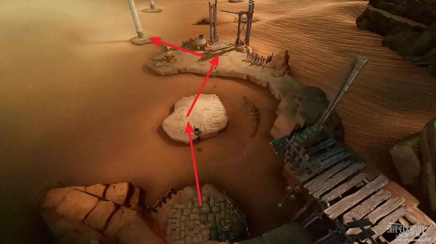 進入此支線直接滑沙到最底部,爬一段樓梯經過幾個鉤爪點,再滑沙一次到達機關位置。