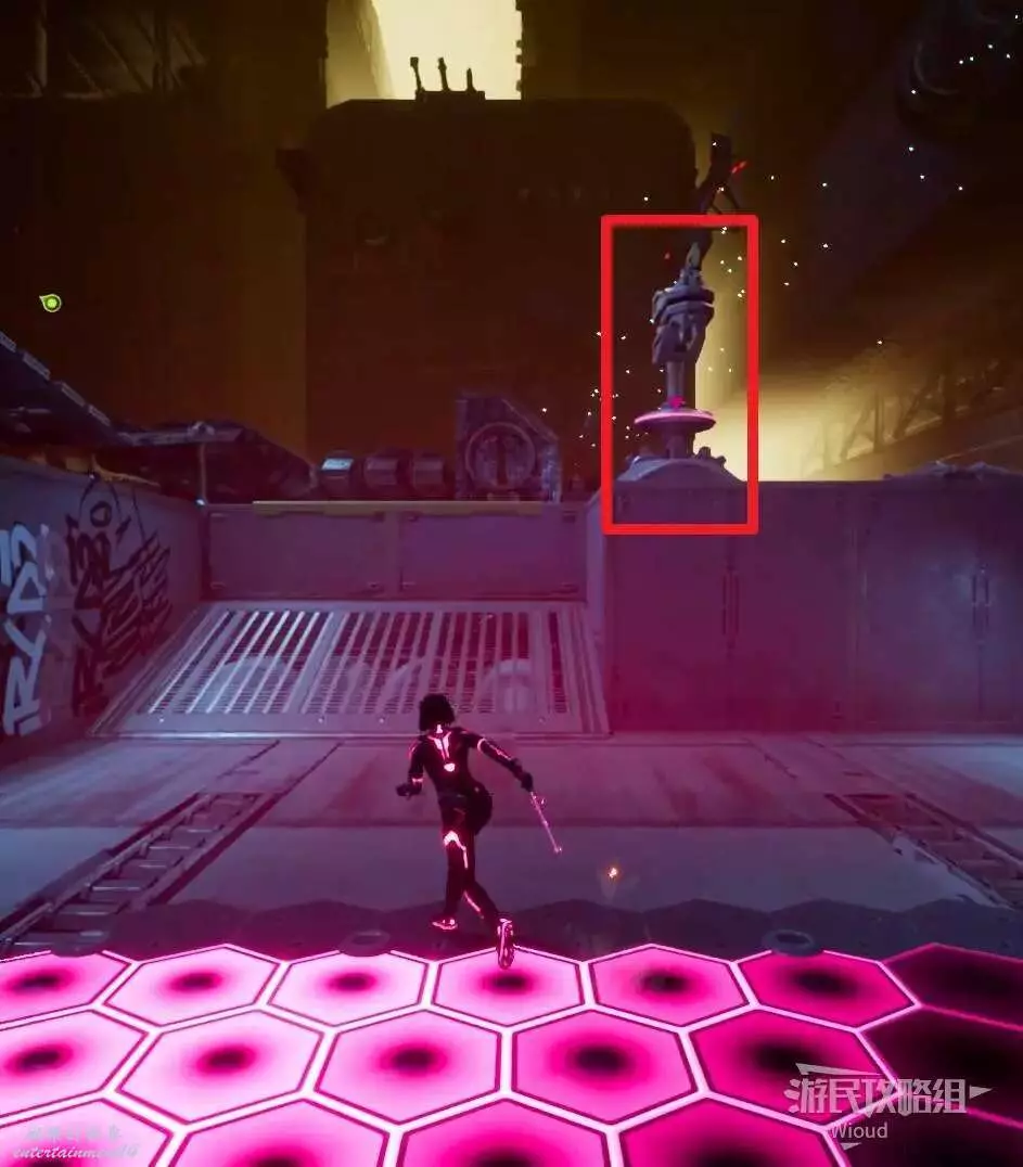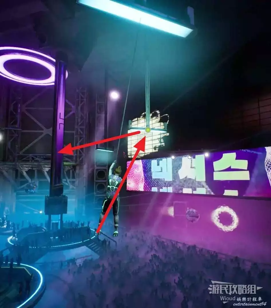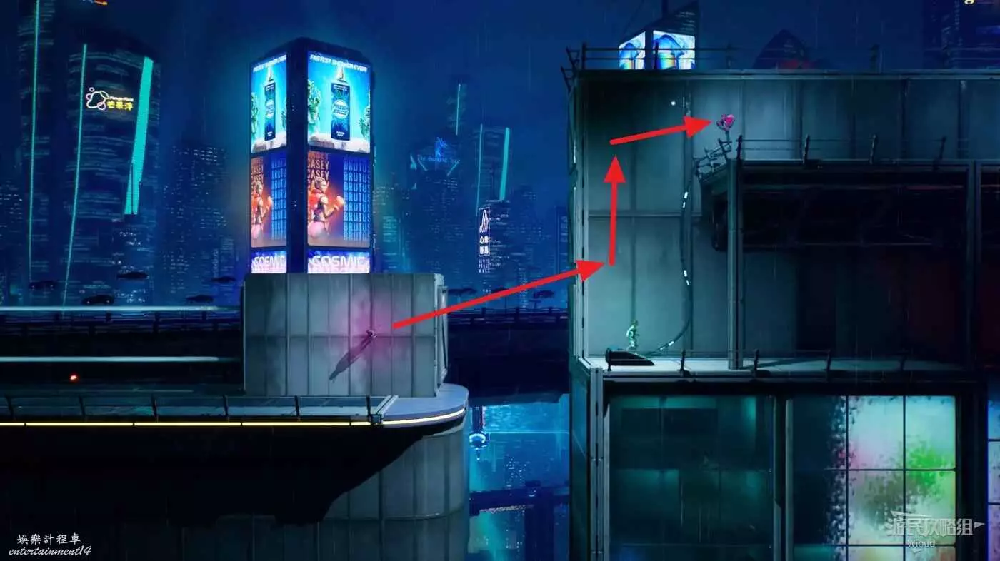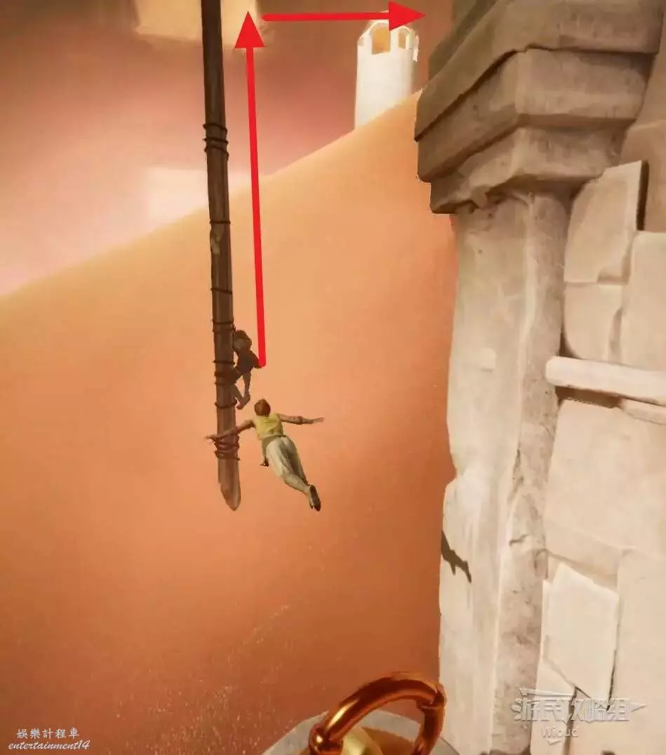 第三個平台直接跳到前面柱子上,再通過連跳和衝刺扒到左前方的柱子並爬到頂端,最後通過鉤爪移動到最高處的平台。