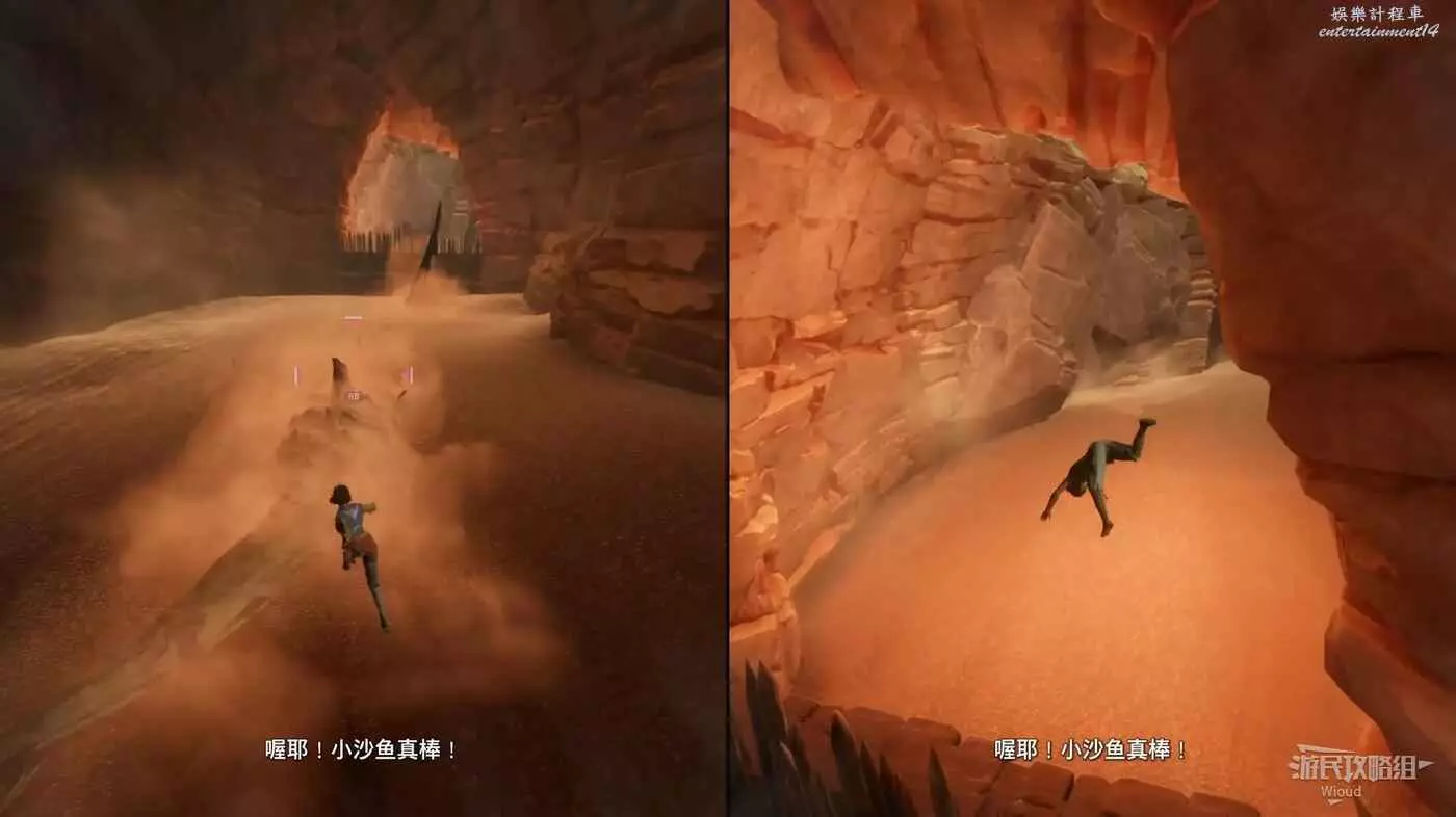 與柱子互動並按下指定按鍵,可以讓柱子下沉並吸引“沙魚”的注意力,然後另一個玩家要做的就是趁沙魚離開的時候立刻跑動下一個柱子旁,然後二人交叉移動都終點。