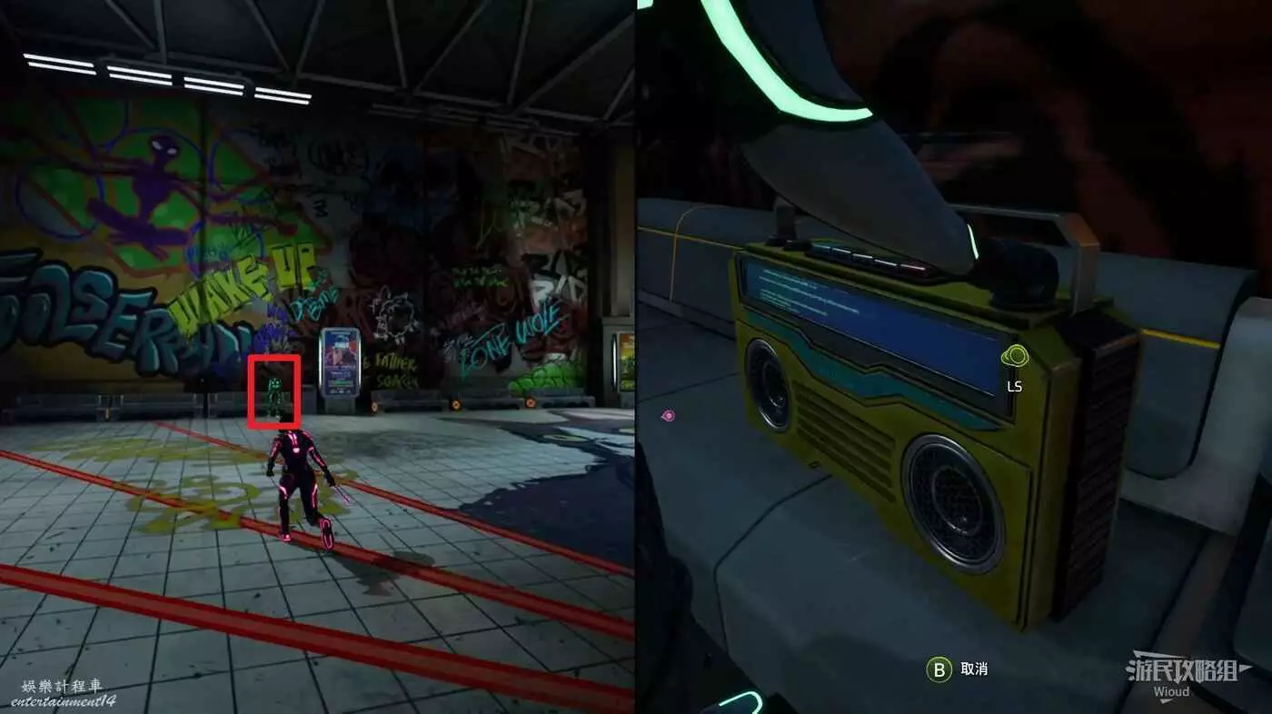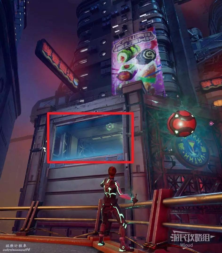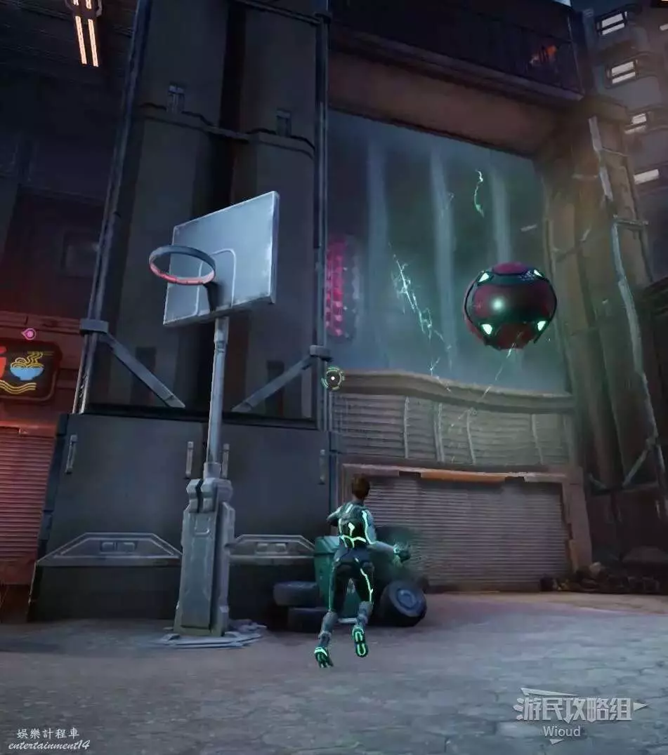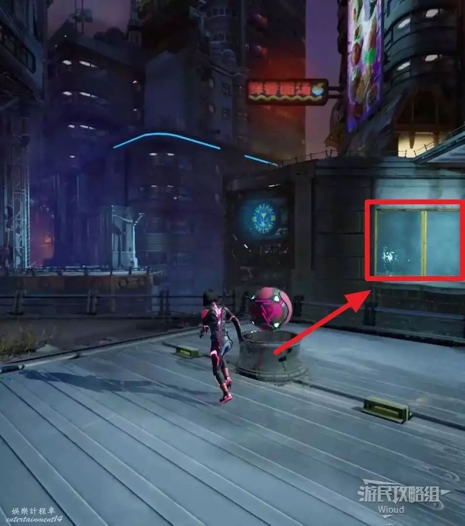 綠人使用能力抓住飛來的球,朝平台左前方的玻璃處扔,然後使用鉤爪進入建築物。