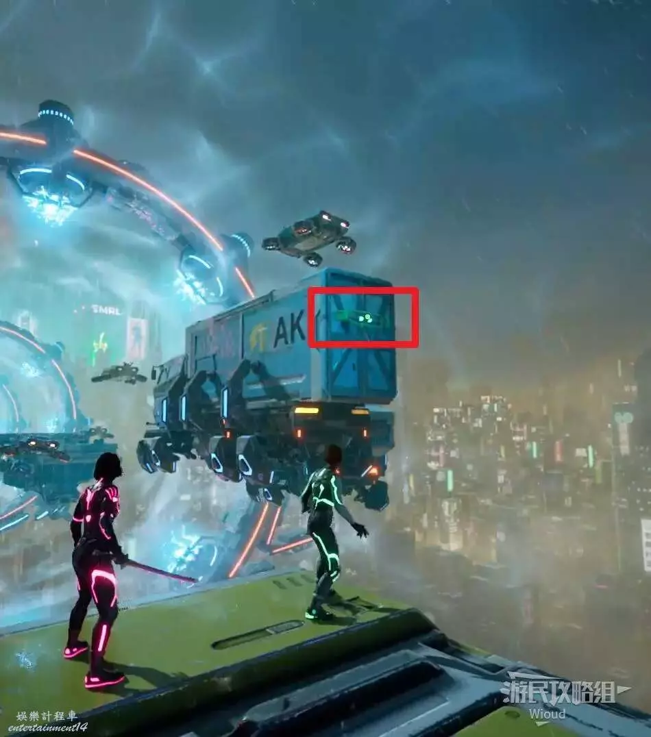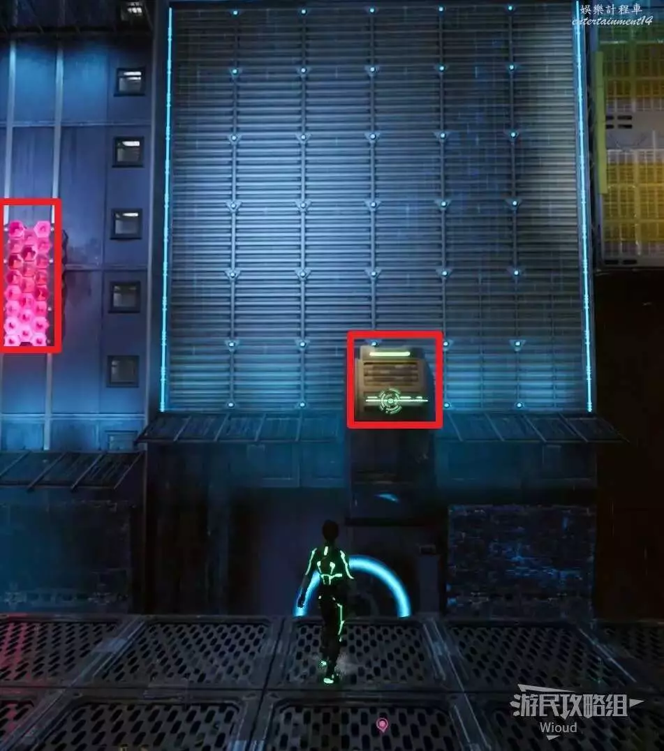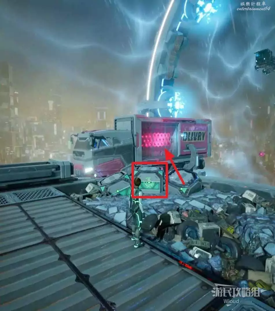 原地等待右前方的貨車移動過來,讓綠人使用能力將車廂大門打開製作一個鉤爪點。