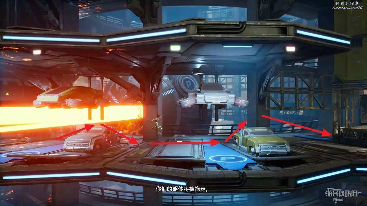 然後通過前方與右側的車跟隨箭頭連跳過去,拖拽右前方的罐車,打開一個通道,直接進去。