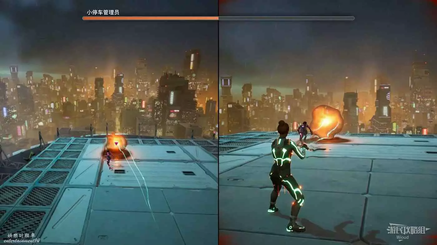 後續遇到的機炮車需要紫人攻擊平台上的貨倉爆出物品,然後綠人不斷的將物品扔過去造成傷害。