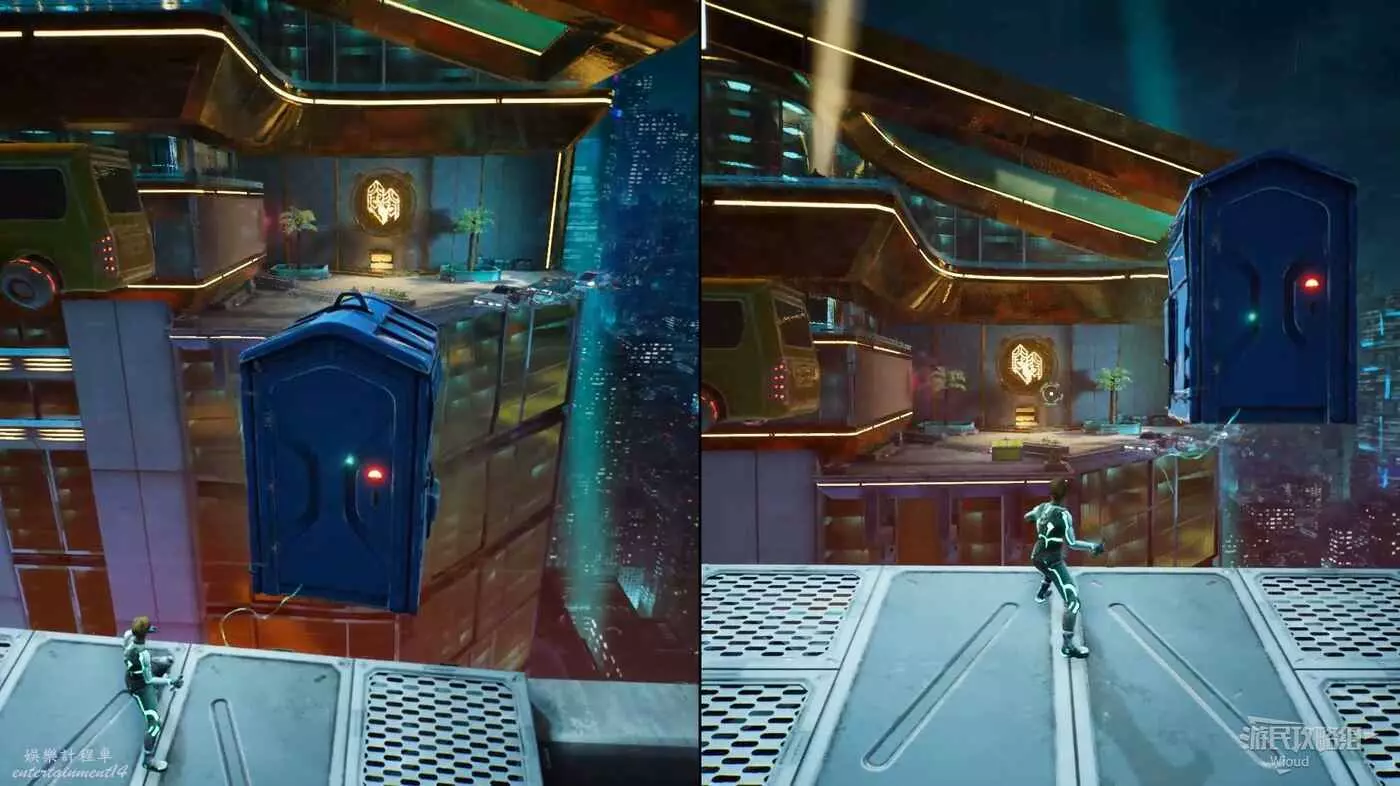然後綠人拖拽新平台處的箱子往倆玩家中間有板塊的貨車扔去,砸開板塊玻璃讓紫人吸附到上面。