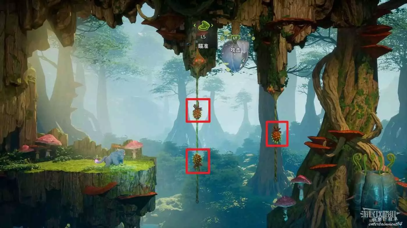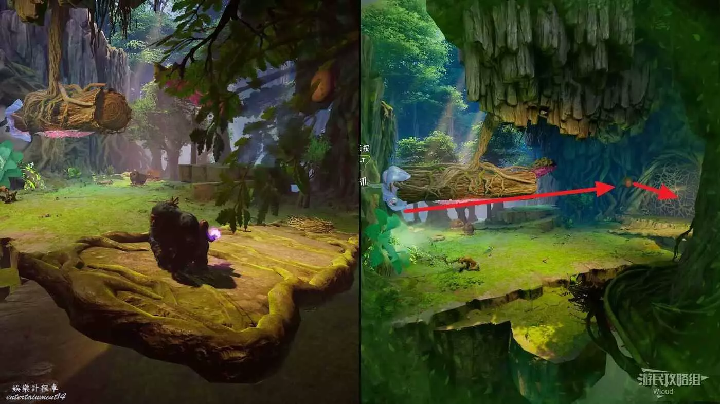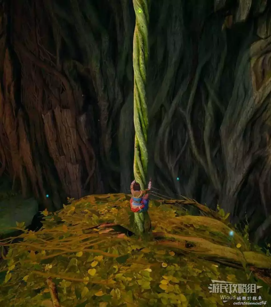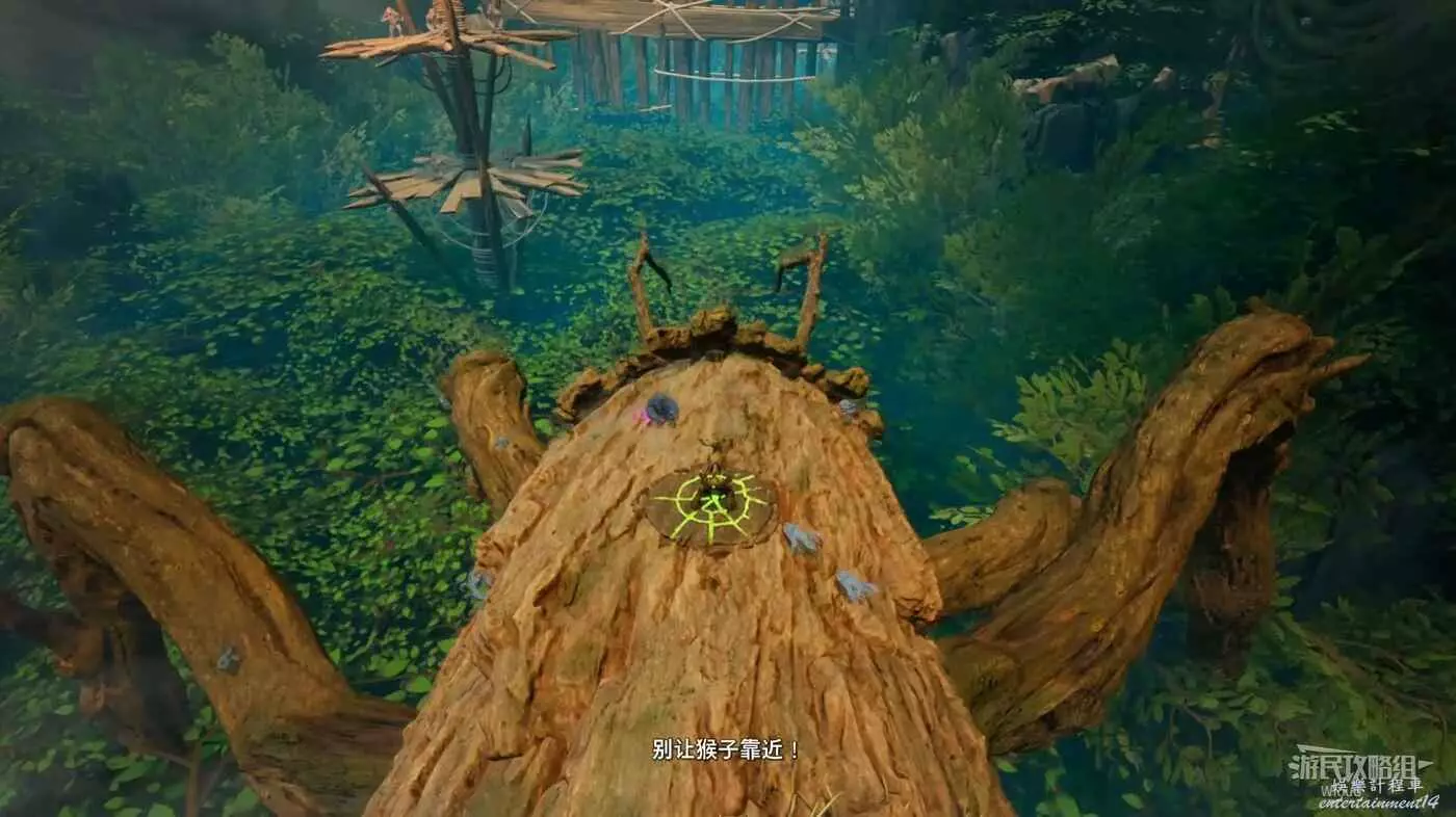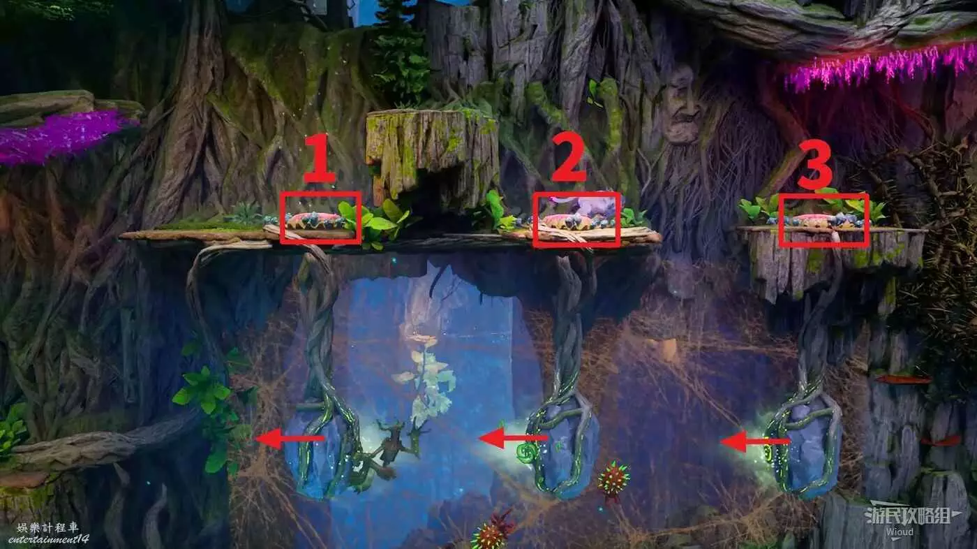到達樹樁頂端後,跳到頂部藤蔓的位置,讓另一個玩家操控好陷阱,只是一收一放的操作。