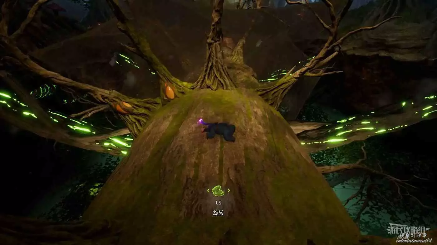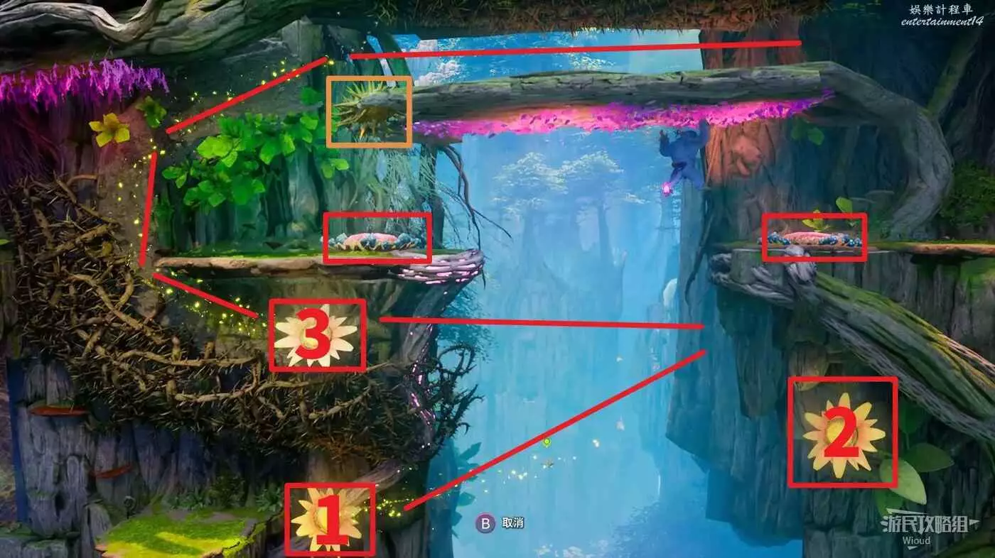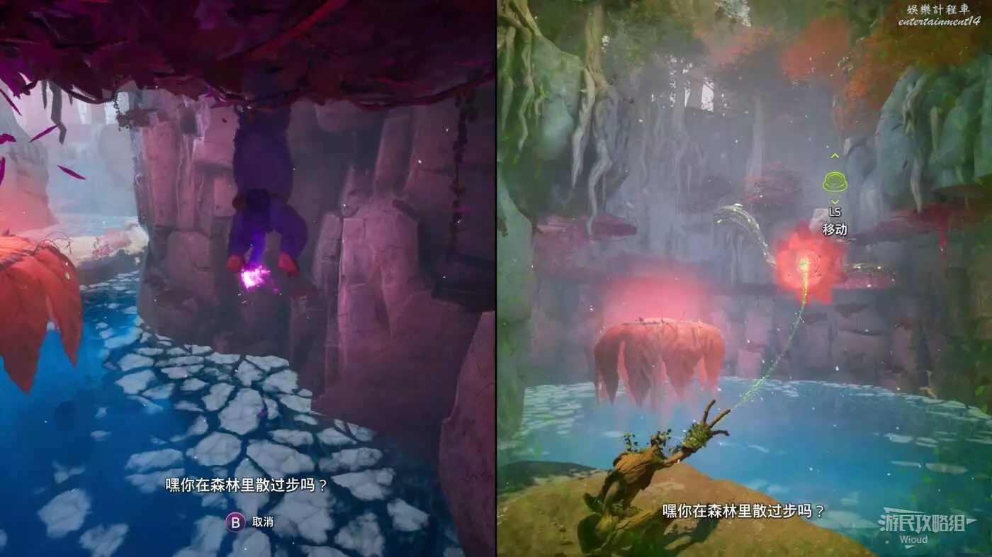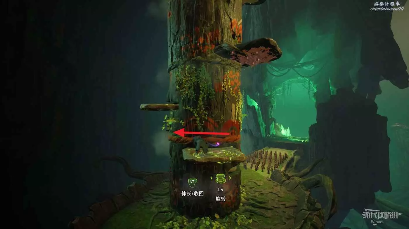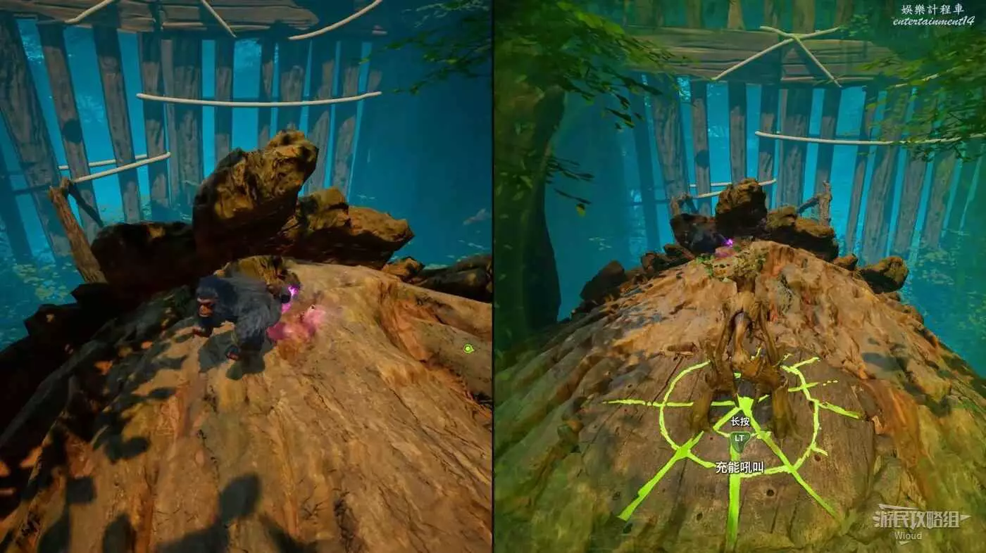 到達樹樁頂端後,跳到頂部藤蔓的位置,讓另一個玩家操控好陷阱,只是一收一放的操作。