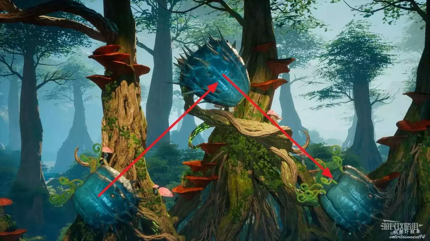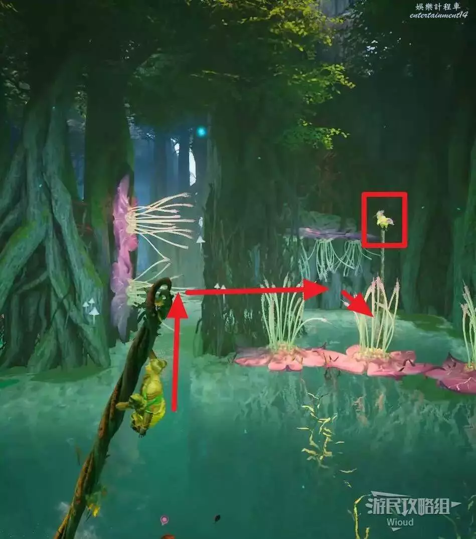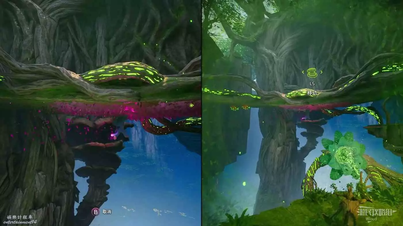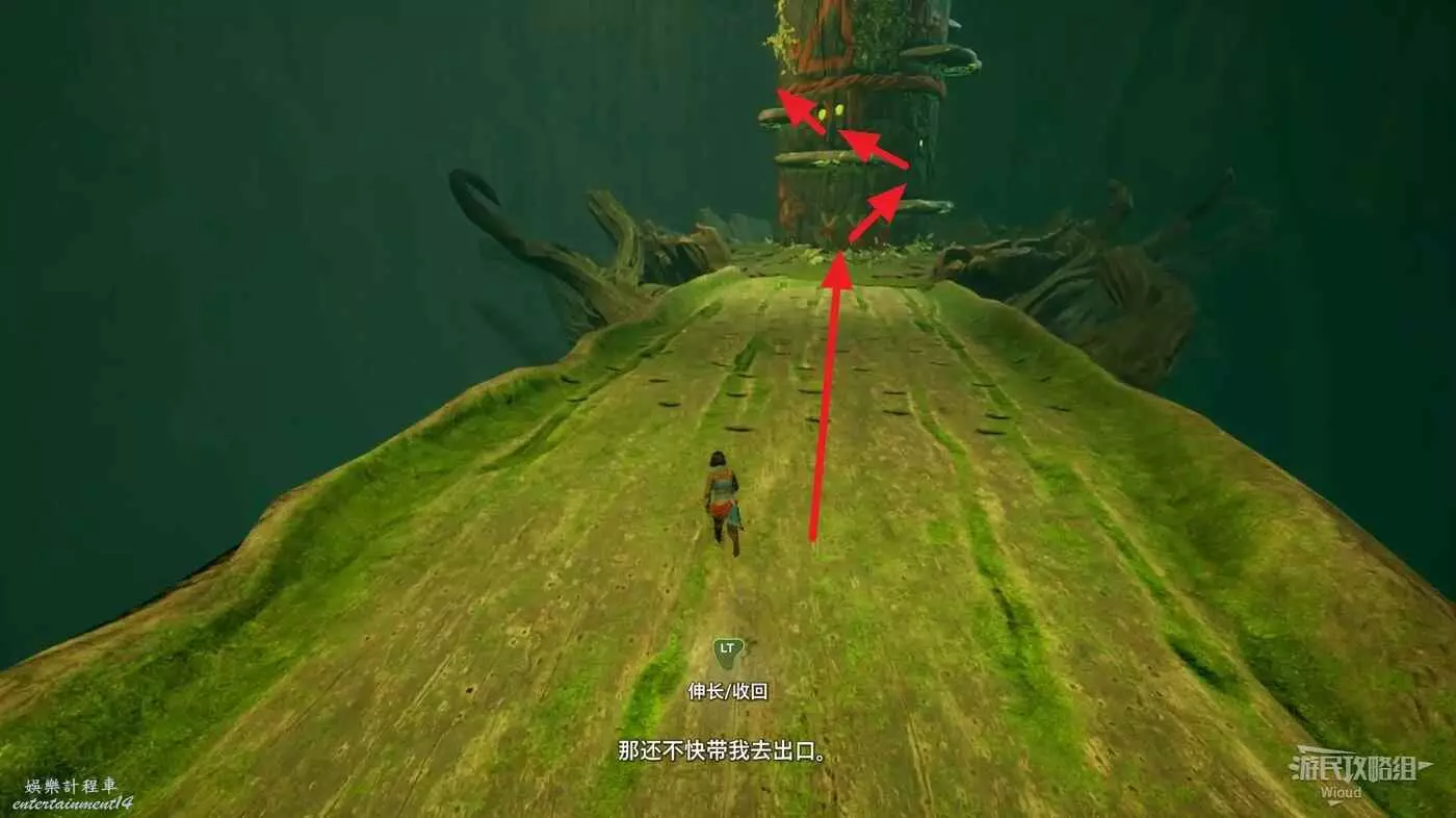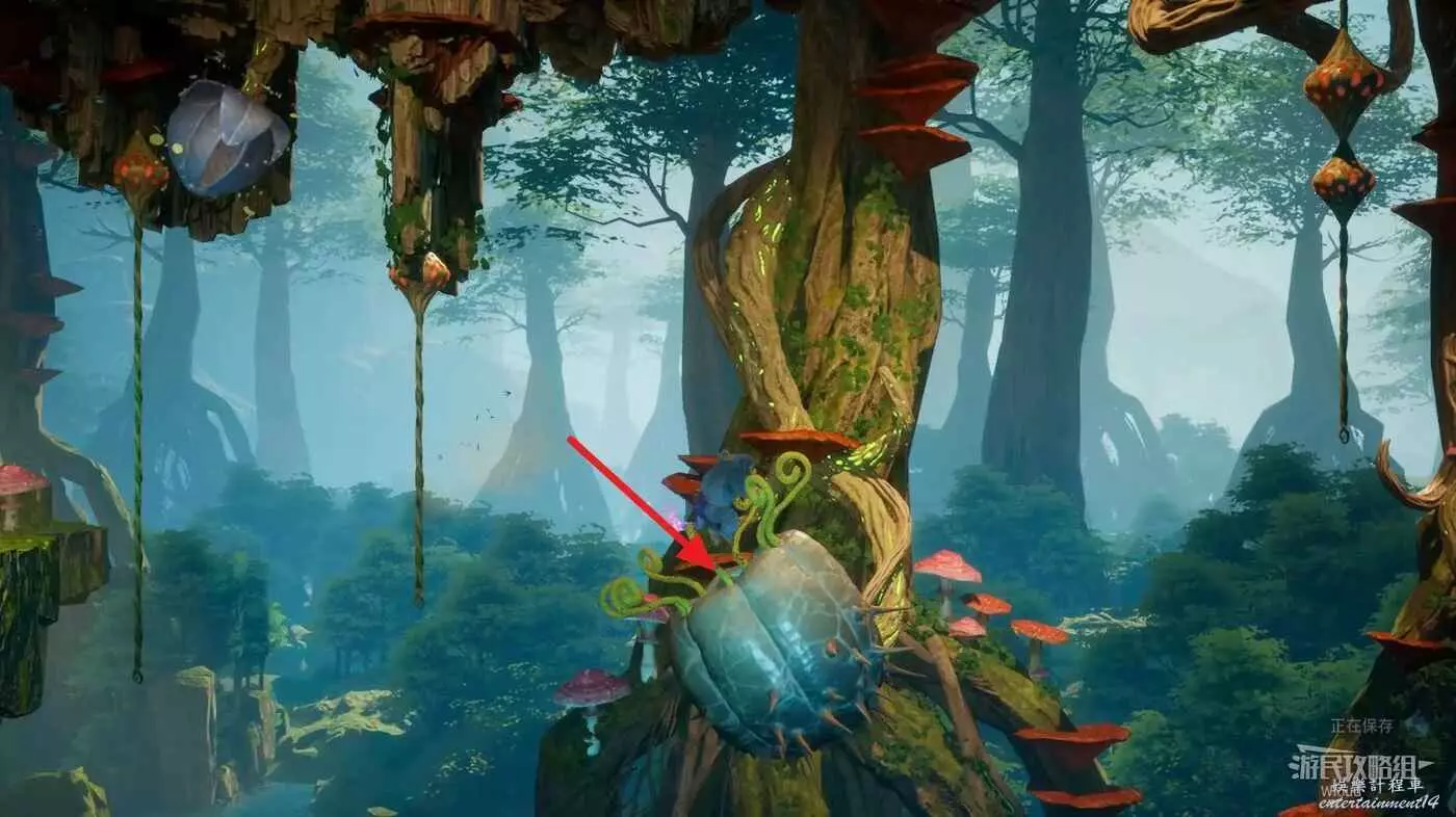 到達樹樁頂端後,跳到頂部藤蔓的位置,讓另一個玩家操控好陷阱,只是一收一放的操作。