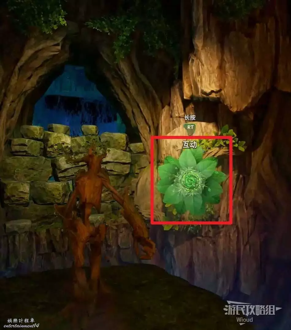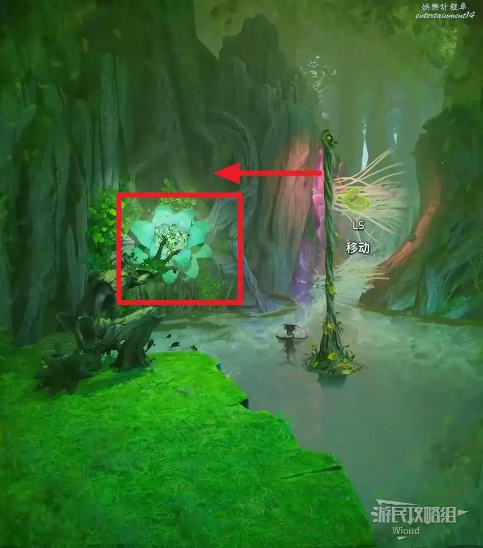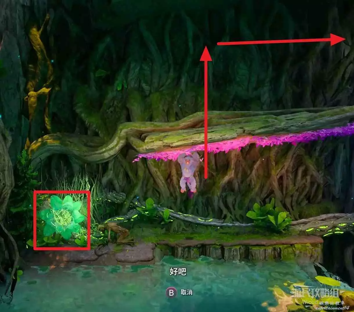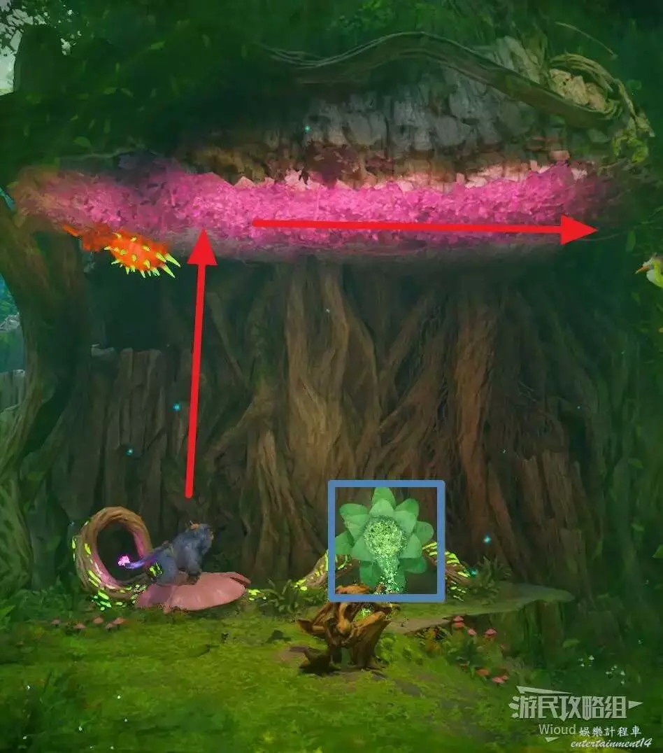 到達對面平台後,樹人操控紅色花朵移動帶有藤蔓的場景建築將猩猩送到中間的大紅花位置,直接將紅花砸下來,樹人再變成仙女飛過去使用樹人能力操控花朵向上移動。