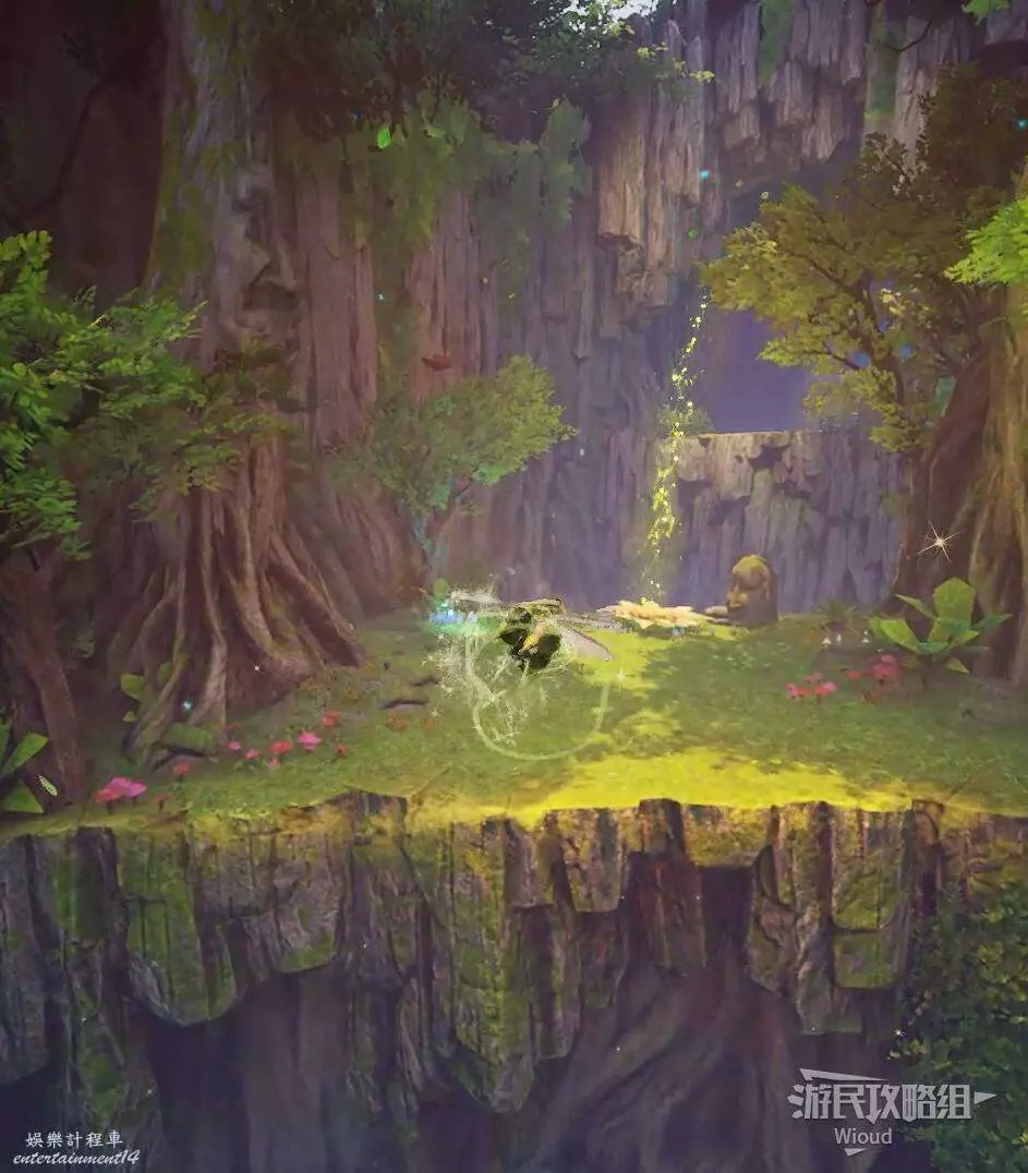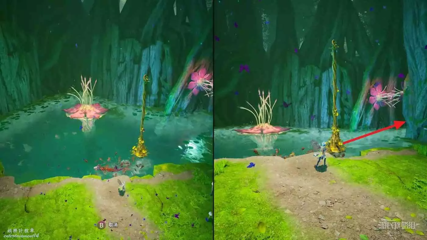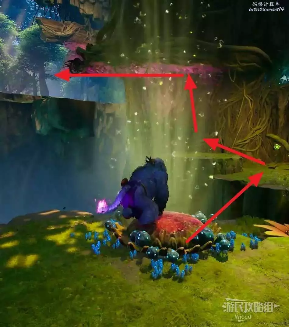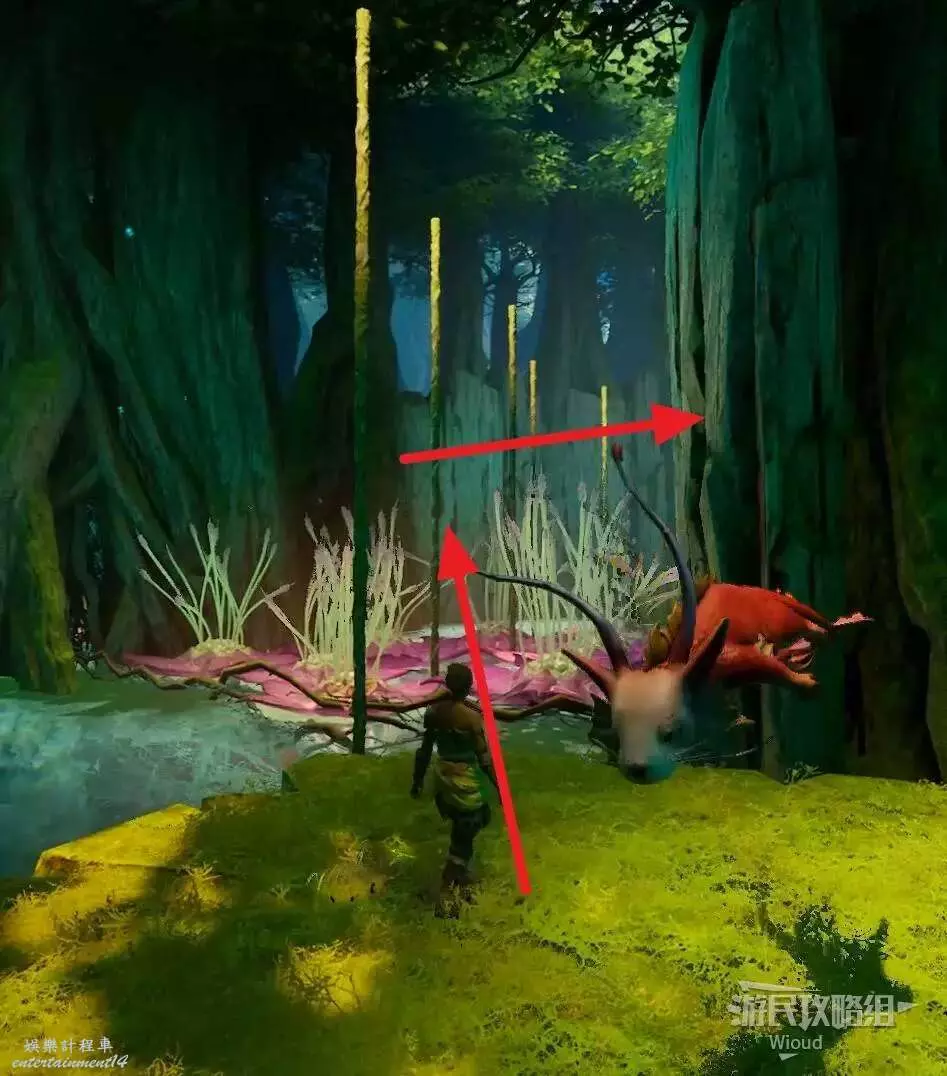 到達對面平台後,樹人操控紅色花朵移動帶有藤蔓的場景建築將猩猩送到中間的大紅花位置,直接將紅花砸下來,樹人再變成仙女飛過去使用樹人能力操控花朵向上移動。