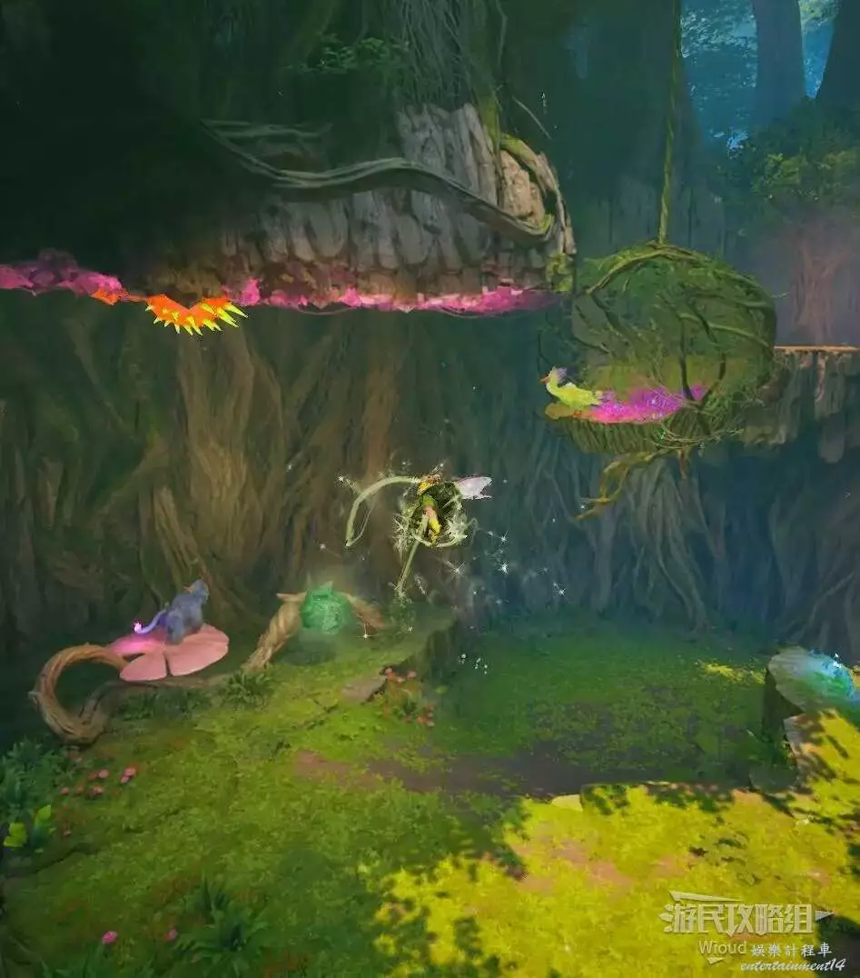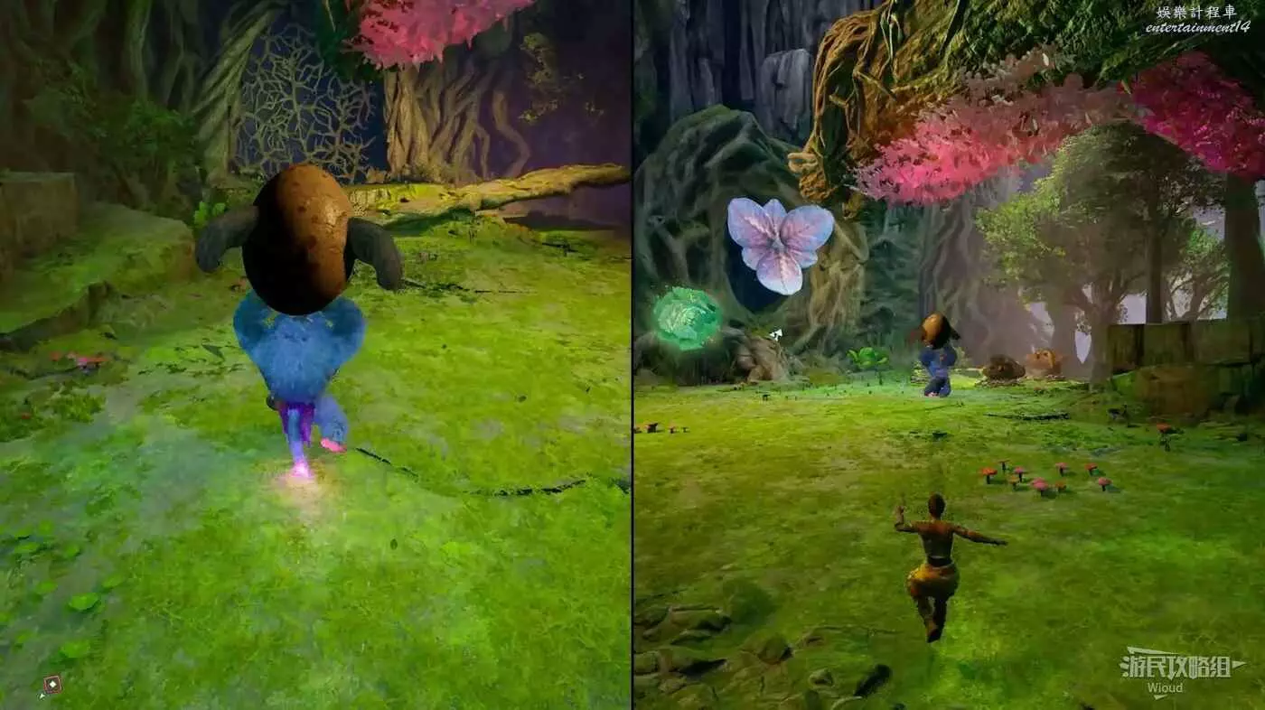 變成樹人與左側的綠花互動,操控紫色藤蔓一邊躲避蟲子一邊將猩猩移動到綠人所在的平台。