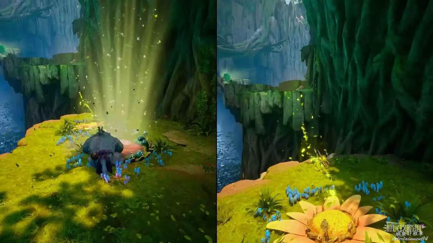 倆人完成了一系列解密後,正式進入了長青領主的體內,用猩猩砸開有紫色花紋的障礙,然後變樹人與裡面的花朵互動。