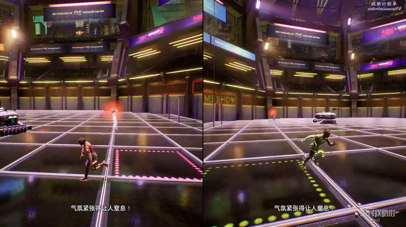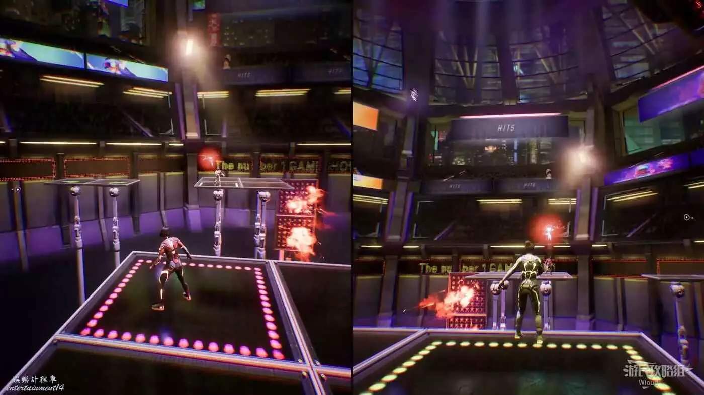 綠人出來後,紫人將視角對準綠人再次將球打過去,綠人接球扔到左側玻璃處將其打碎,進入左側建築物來到紫人所在的平台。