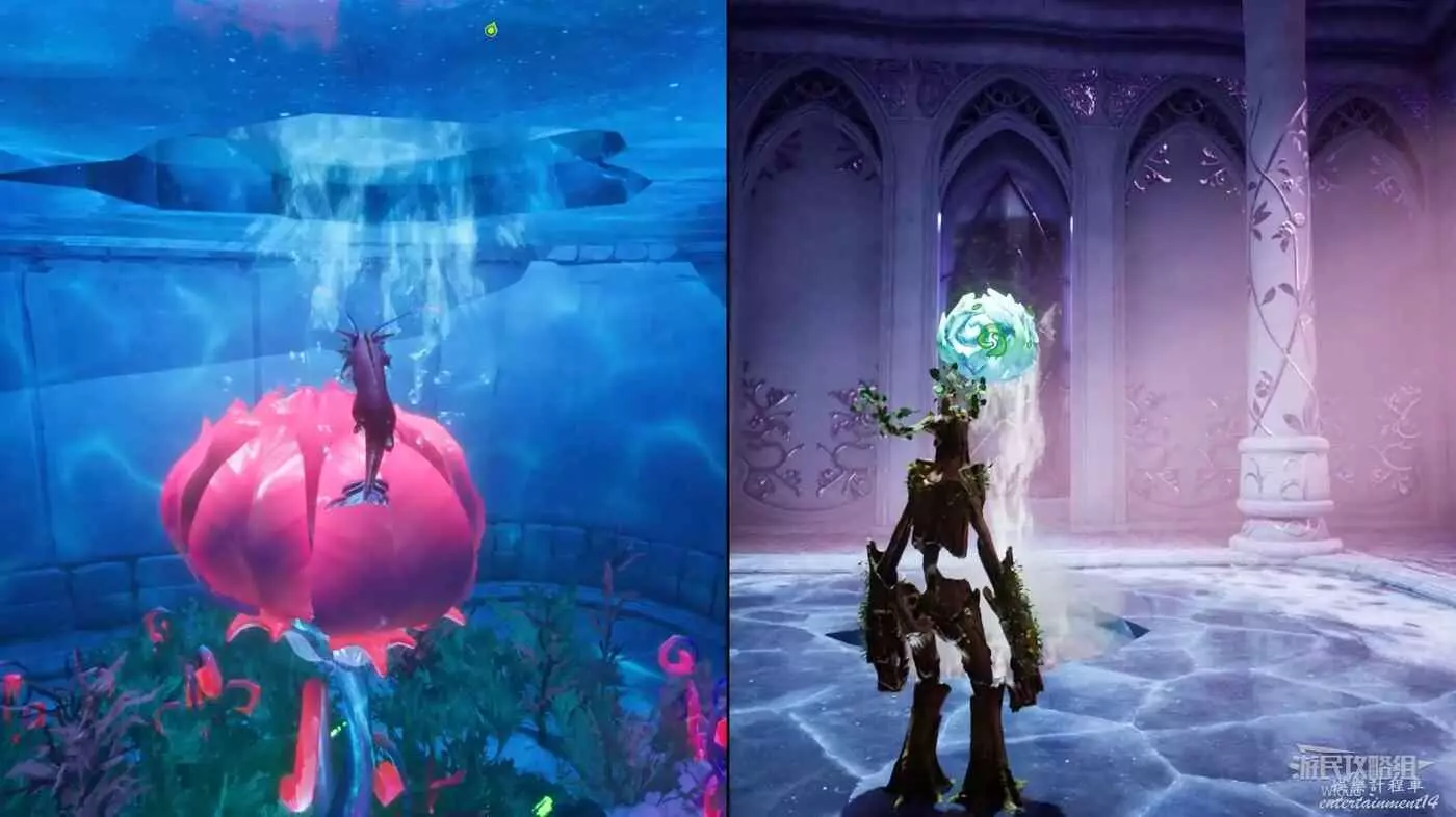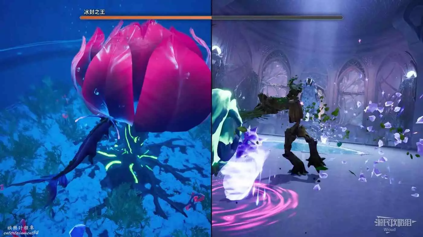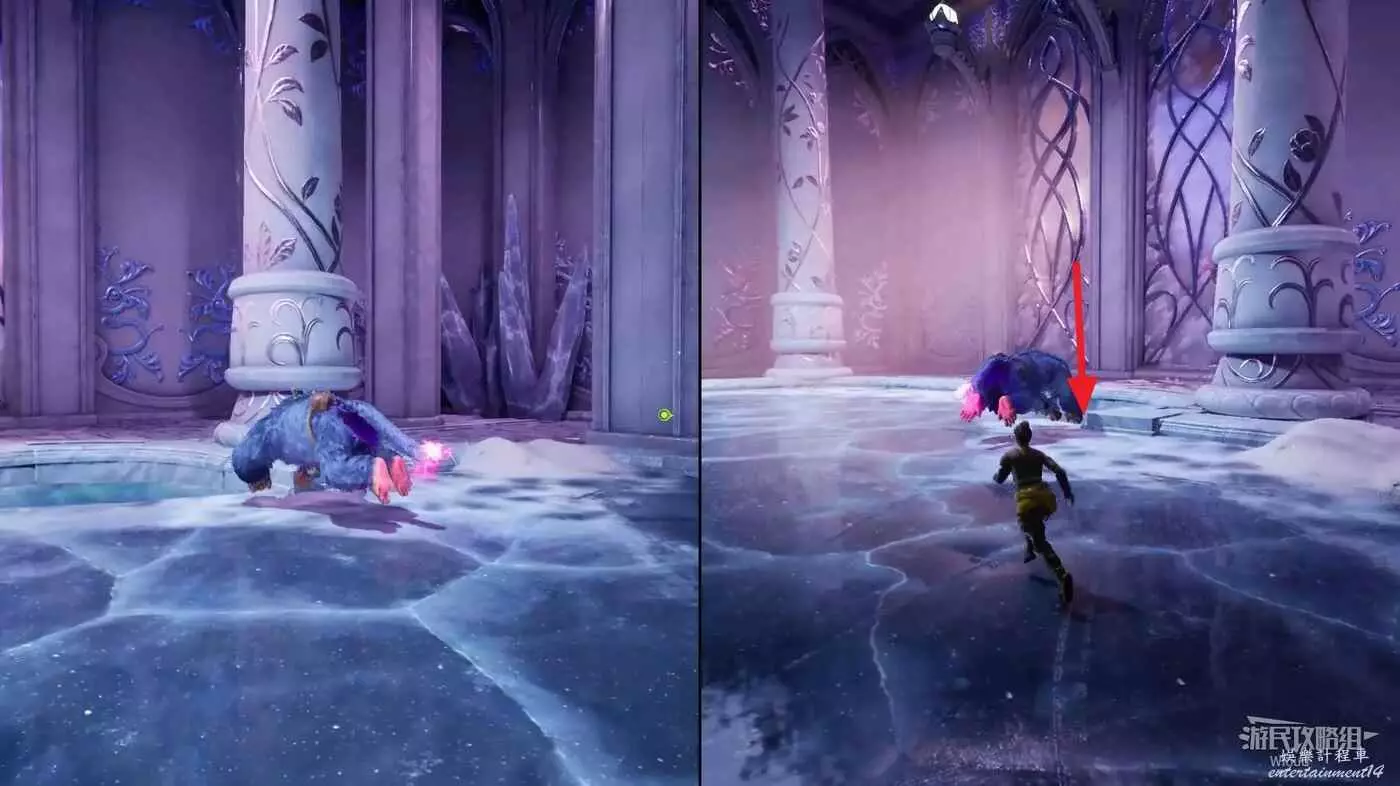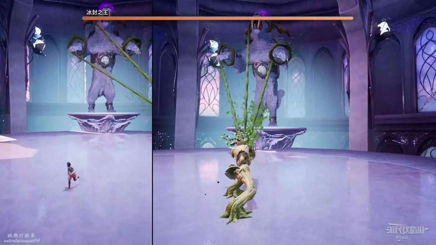沿路走到宮殿底部,變成樹人將雕像拽到冰面砸出一個缺口,另一個玩家變成魚進入水下將冰球扔到前方的冰塊打開大門觸發BOSS戰。