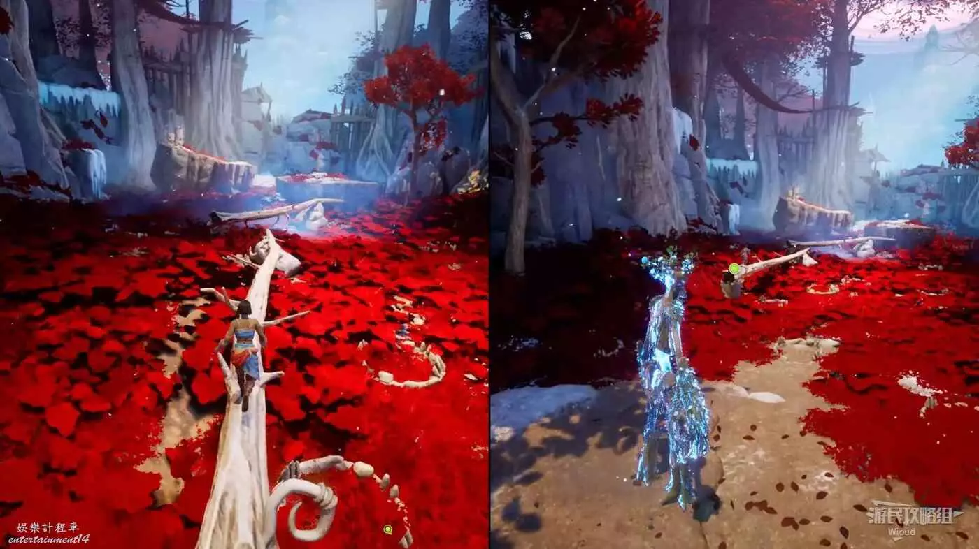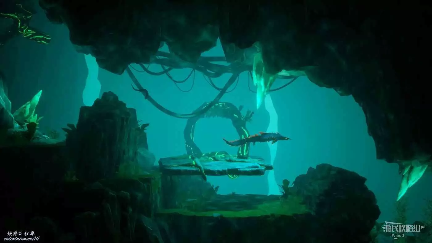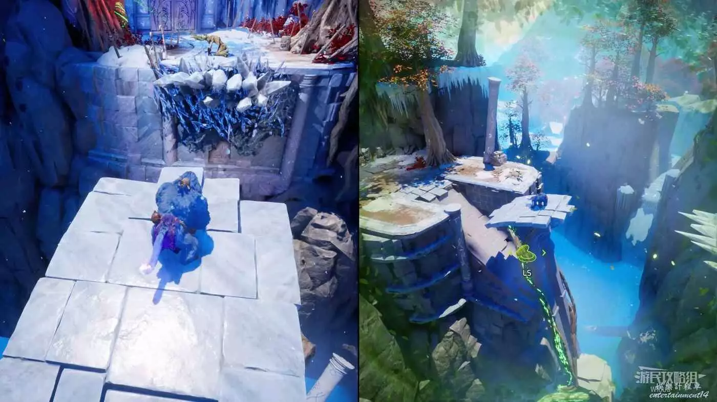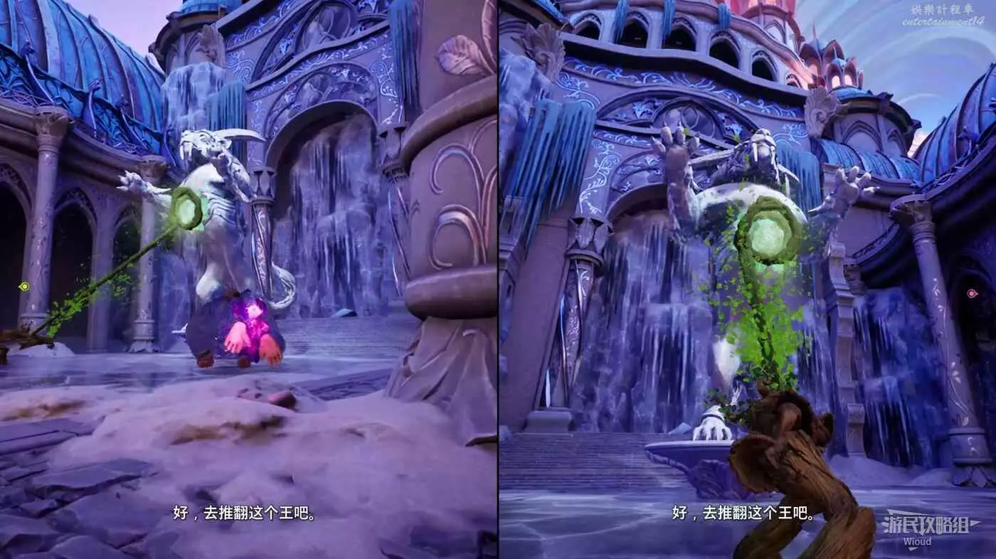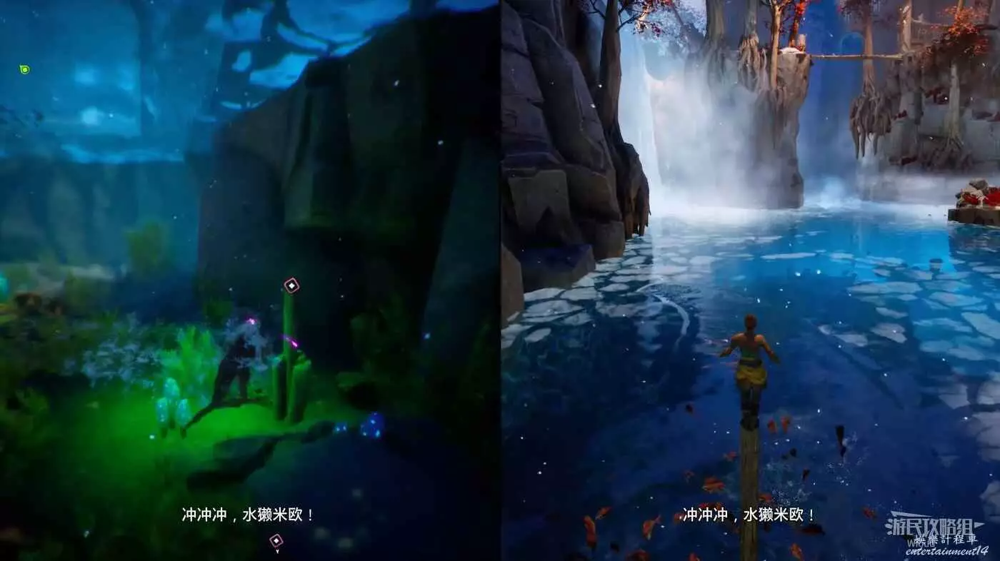 沿路走到宮殿底部,變成樹人將雕像拽到冰面砸出一個缺口,另一個玩家變成魚進入水下將冰球扔到前方的冰塊打開大門觸發BOSS戰。