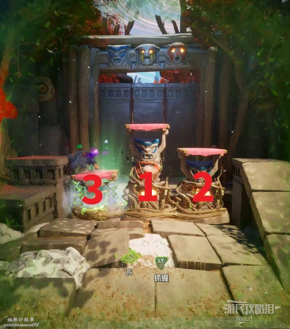 如果纏繞的面具正確,那麼面具雙眼會發出紅光,猩猩玩家先按照下圖順序將柱子依次砸下去,然後樹人玩家以1號柱子黃豬臉、2號柱子橙猴臉、3號柱子藍臉的順序將柱子固定住。