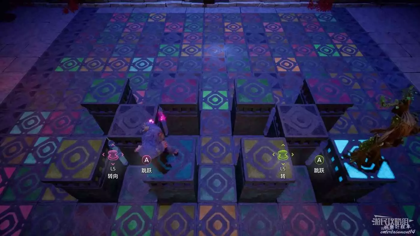 先操控紫人從支線的入口移動,走到盡頭右拐,跳到右側牆壁的板塊處,再跳到對面平台的板塊。